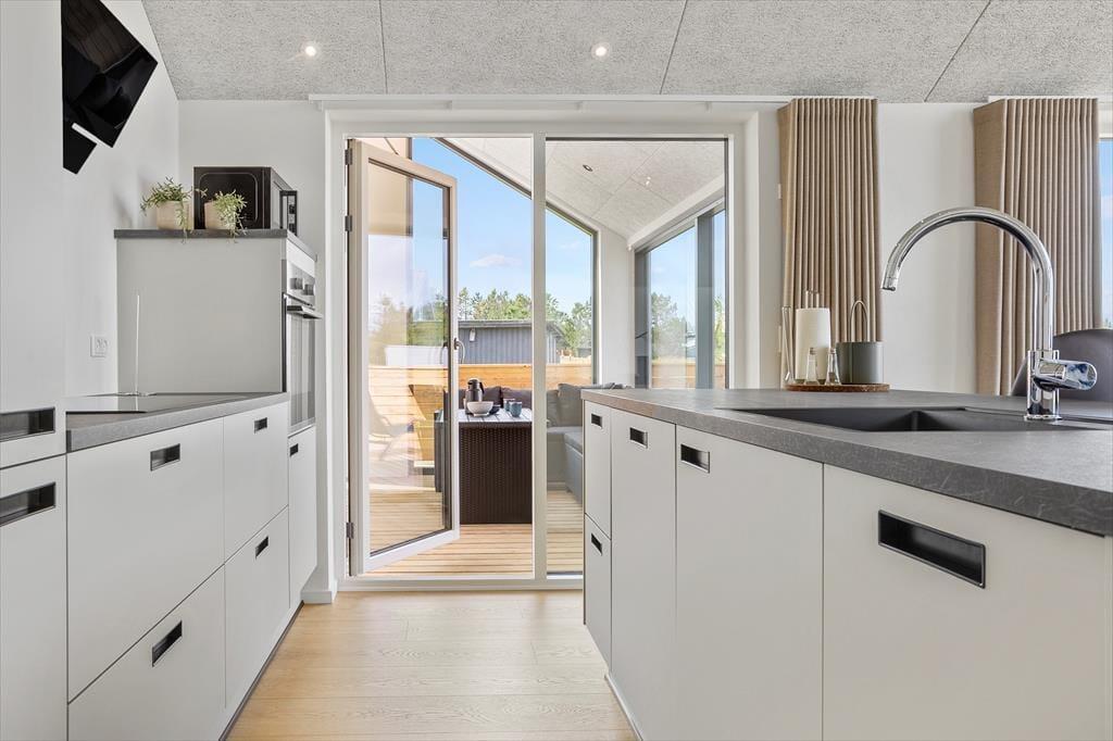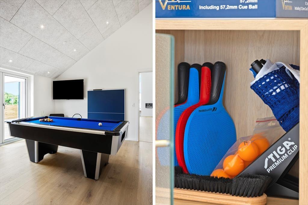 Træd ind i dette smagfuldt indrettede sommerhus og bliv mødt af en lys og moderne atmosfære, der emmer af kvalitet. Huset er designet med fokus på både æstetik og funktionalitet, hvilket skaber en perfekt ramme for hyggelige feriestunder. Den rummelige stue er indrettet med komfortable møbler og store vinduespartier, der lukker masser af naturligt lys ind og giver en skøn udsigt til de omkringliggende omgivelser. I det veludstyrede aktivitetsrum kan hele familien samles om spil og leg – her er både bordtennis og poolbord, som garanterer timevis af sjov og konkurrence.