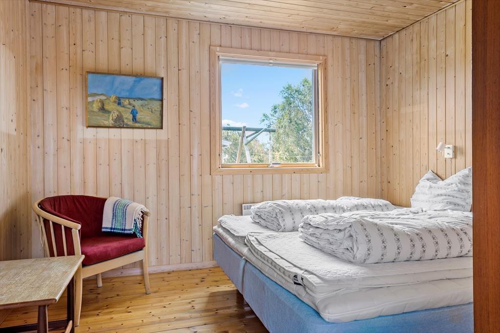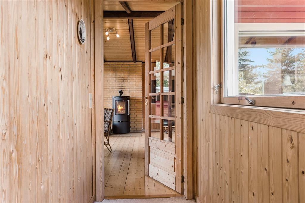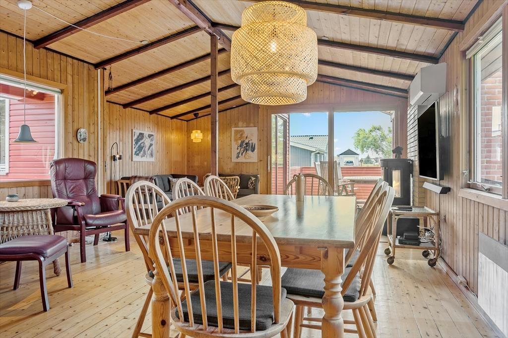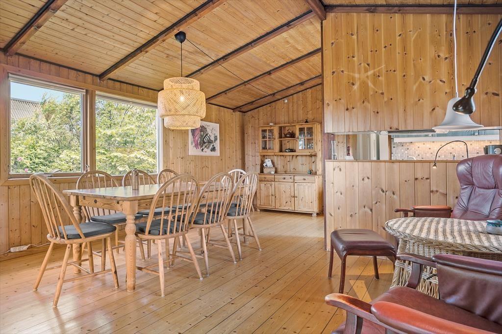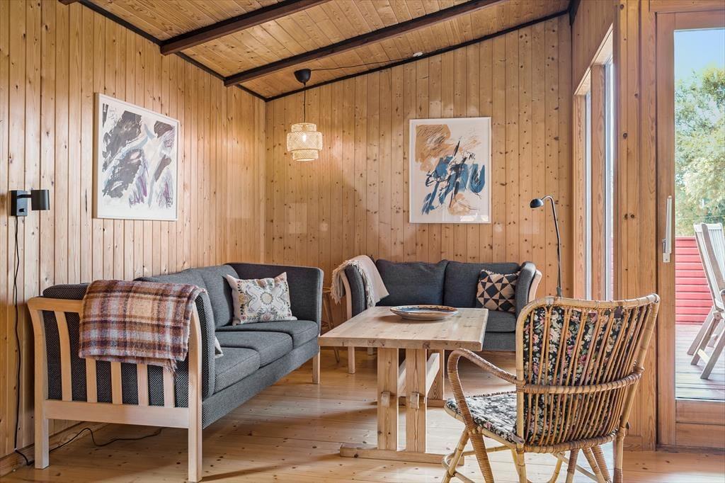 Når du træder ind i dette klassiske træsommerhus, bliver du mødt af en varm og indbydende atmosfære. Husets naturlige trævægge og loftsbjælker skaber den perfekte ramme om ægte sommerhushygge, mens brændeovnen i stuen sørger for varme og afslapning på kølige dage. Sommerhuset er rummeligt og kan komfortabelt rumme op til 10 personer – ideelt til store familier eller vennegrupper, der ønsker at tilbringe ferien sammen. De åbne opholdsrum inviterer til fælles stunder, hvad enten det er ved spisebordet eller foran brændeovnen med en kop varm kakao.
