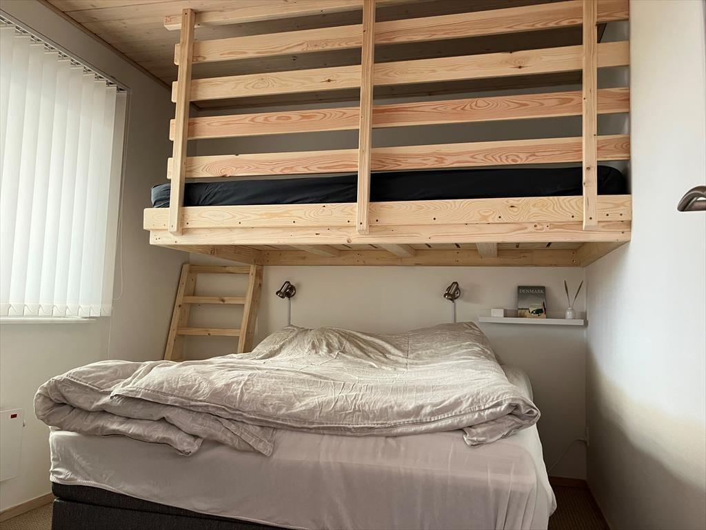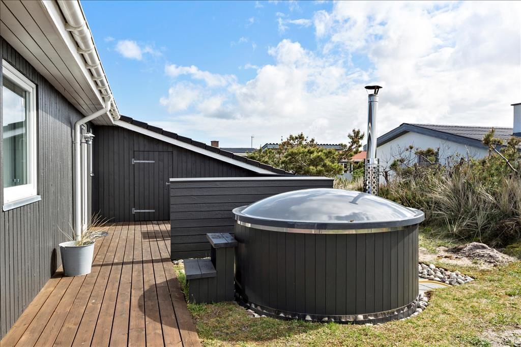 Udenfor venter en skøn naturgrund, der inviterer til leg og aktiviteter for både store og små. Her kan du tage et spil bold med børnene eller bare nyde stilheden på terrassen med en kop kaffe i hånden. For ekstra luksus kan du tage et afslappende bad i sommerhusets vildmarksbad, hvor du kan lade tankerne flyde, mens du nyder den friske luft og stjernehimlen over Vorupør. Uanset om du vil være aktiv eller bare nyde freden, er rammerne her perfekte til at koble af og lade op.