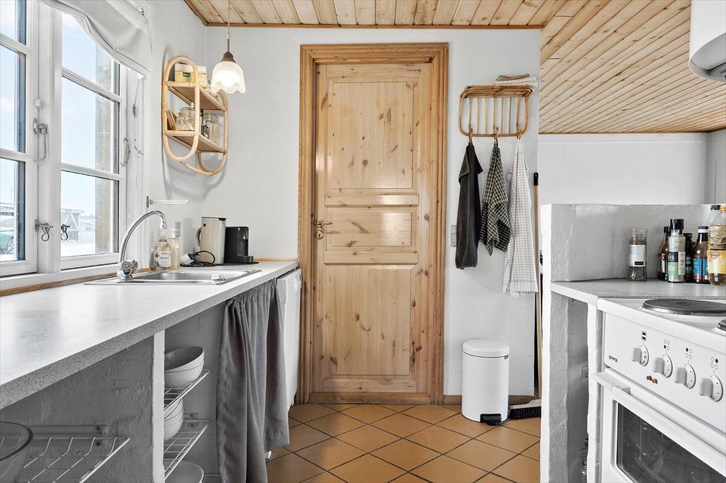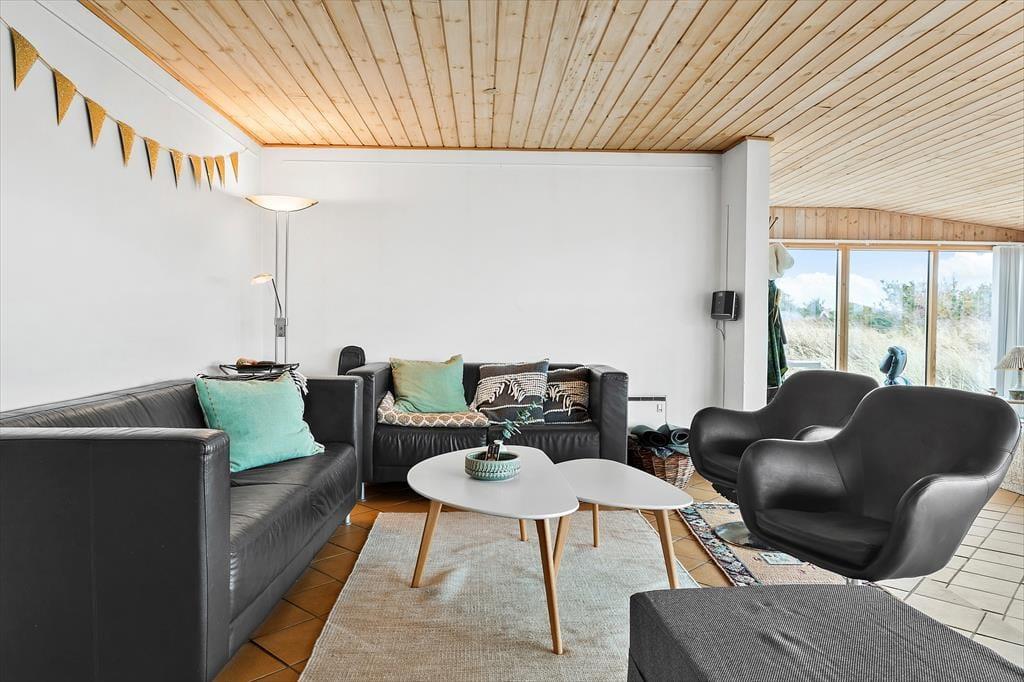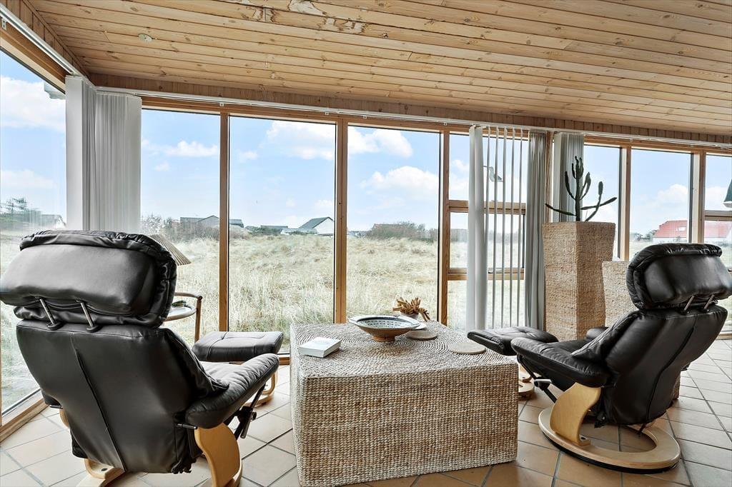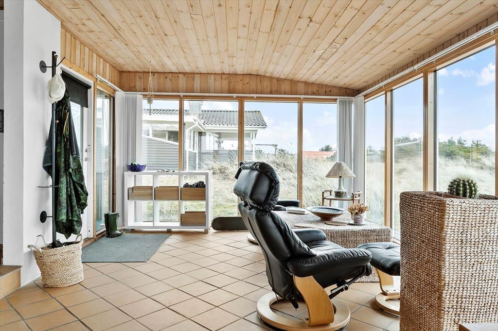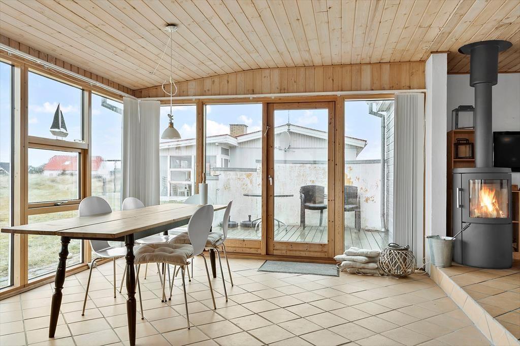Træd ind i dette smagfuldt indrettede sommerhus, hvor lyse trælofter og klinkegulve skaber en varm og indbydende atmosfære. Den rummelige opholdsstue er integreret med et veludstyret køkken, hvilket gør det nemt at samles om madlavning og måltider. En særlig perle er den store udestue, hvor du året rundt kan nyde udsigten til det fredede klit- og hedeareal foran huset. Efter en dag fuld af oplevelser kan du slappe af foran brændeovnen, mens flammerne knitrer og varmer rummet op.