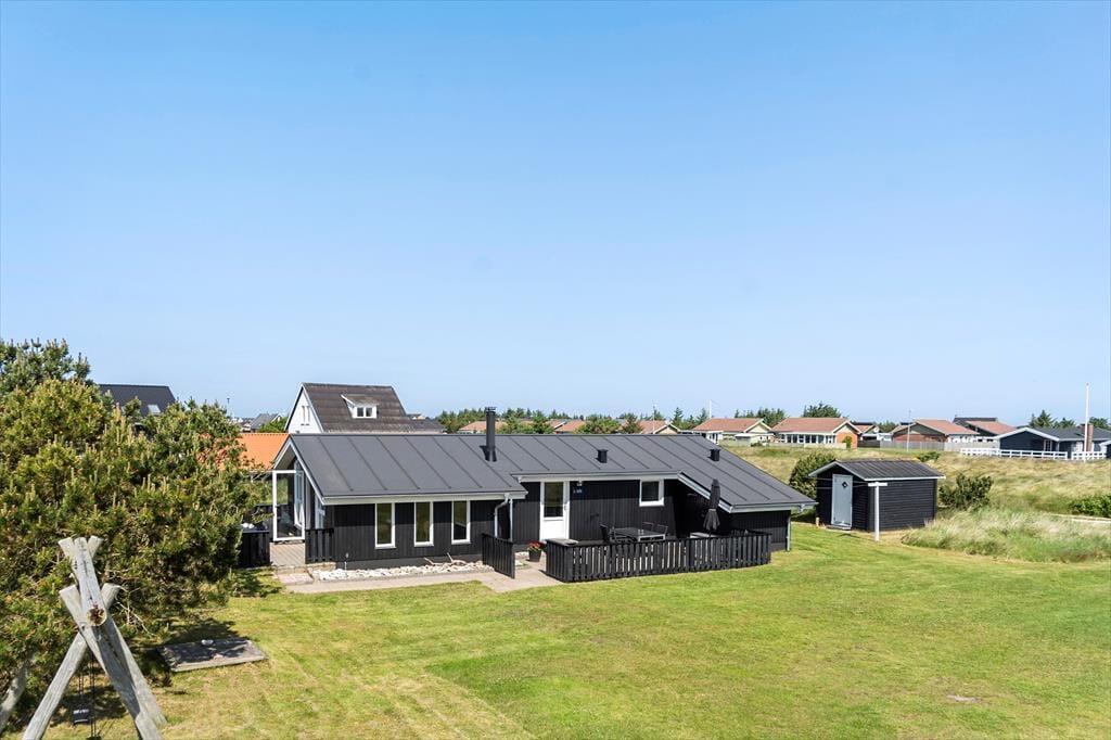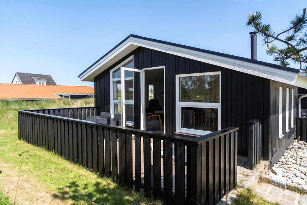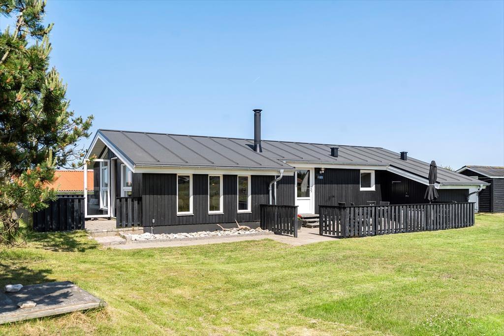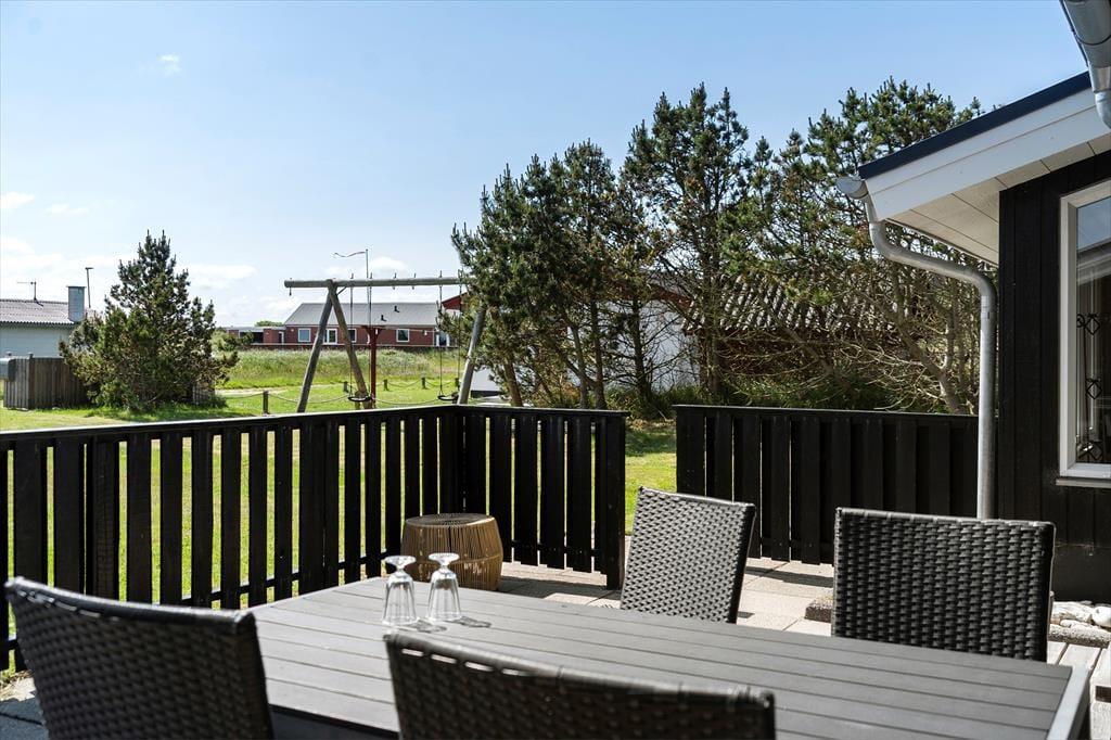 Sommerhuset er omgivet af en dejlig terrasse, hvor du kan nyde morgenkaffen i solen eller grille om aftenen, mens solen går ned over klitterne. Den lukkede have giver både børn og kæledyr mulighed for at lege frit, mens de voksne slapper af med en god bog eller et glas vin. Beliggenheden for enden af en blind vej sikrer fred og ro, så I virkelig kan koble af fra hverdagens stress og jag.