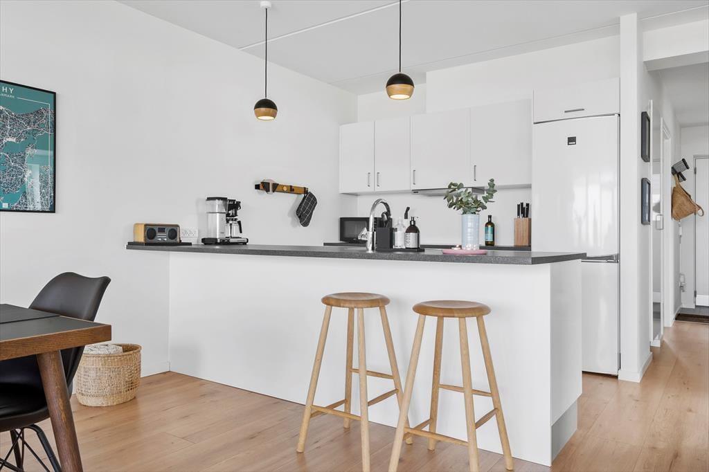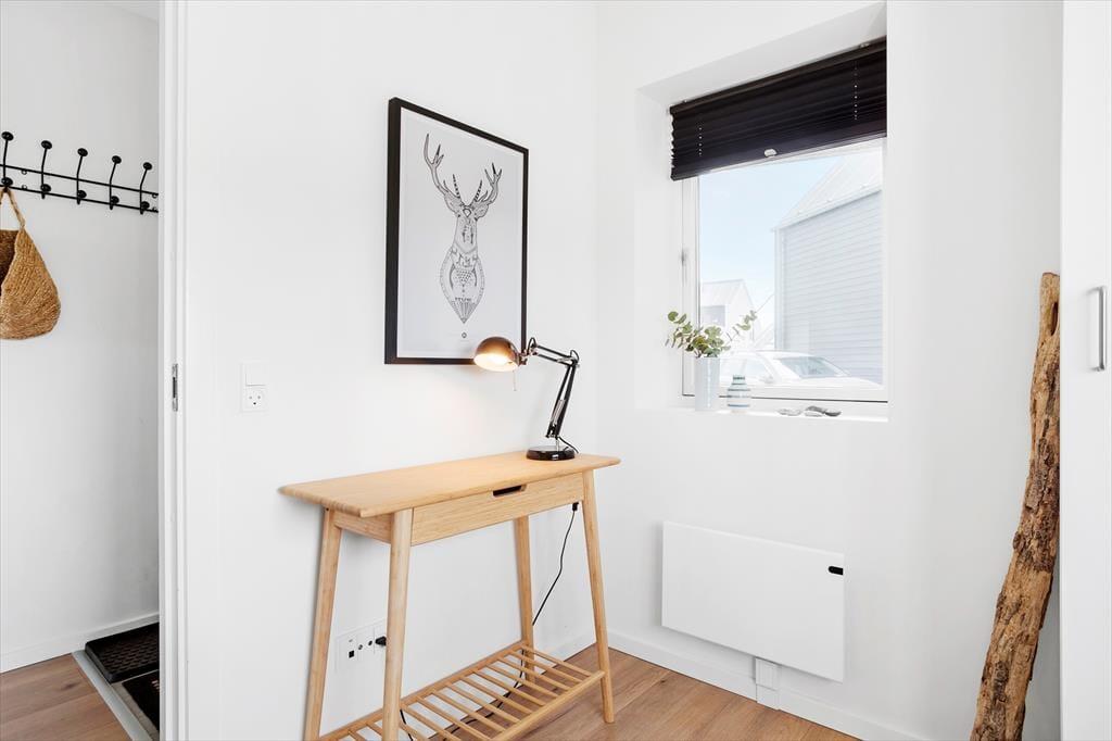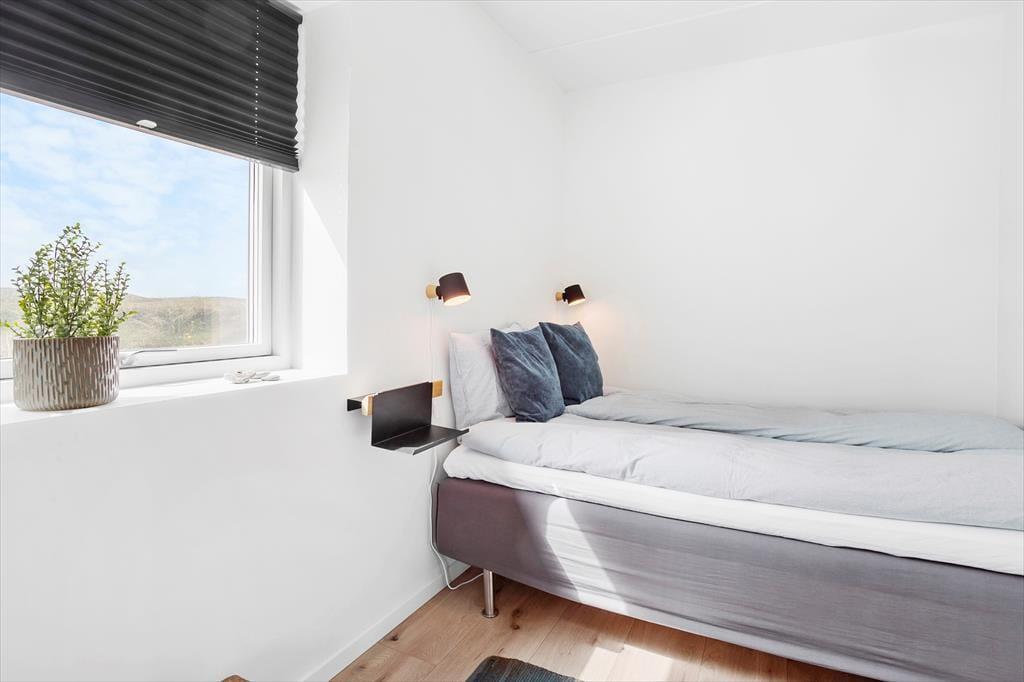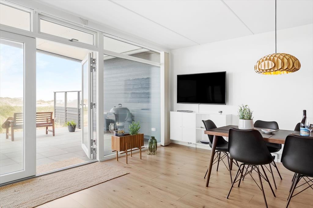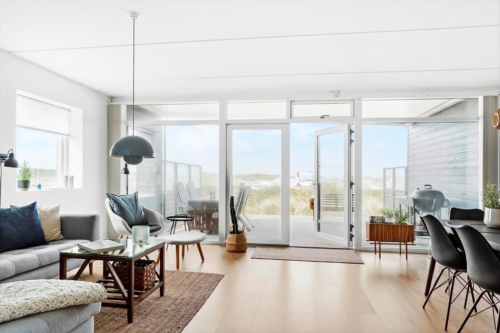 Indenfor mødes du af en stilren og hyggelig atmosfære, hvor store vinduer trækker lyset og naturen helt ind i rummene. Indretningen er moderne og smagfuld med en varm og indbydende stemning, der gør det nemt at slappe af. Stuen byder på en skøn sofa, hvor du kan synke ned med en god bog eller nyde en kop kaffe, mens du betragter det skiftende lys over klitterne. Køkkenet er veludstyret og åbent, så feriemåltiderne kan tilberedes i hyggelige rammer.