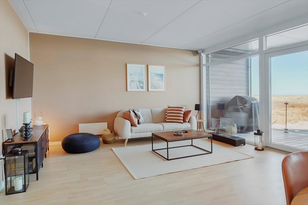 Indenfor mødes du af et smagfuldt indrettet sommerhus, hvor moderne komfort går hånd i hånd med en hyggelig atmosfære. De lyse rum, de stilrene møbler og de store vinduer, der lader dagslyset strømme ind, skaber en behagelig og indbydende stemning. Husets hjerte er den åbne stue, hvor du kan slappe af i sofaen eller samle familien til hyggelige middage ved spisebordet. Køkkenet er funktionelt indrettet og gør madlavningen til en fornøjelse. Takket være varmepumpen er huset behageligt at opholde sig i året rundt – uanset om du besøger det i sommerens varme eller vinterens friske briser.