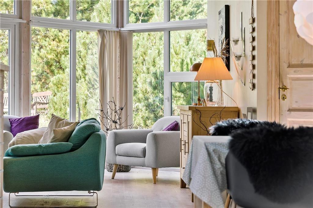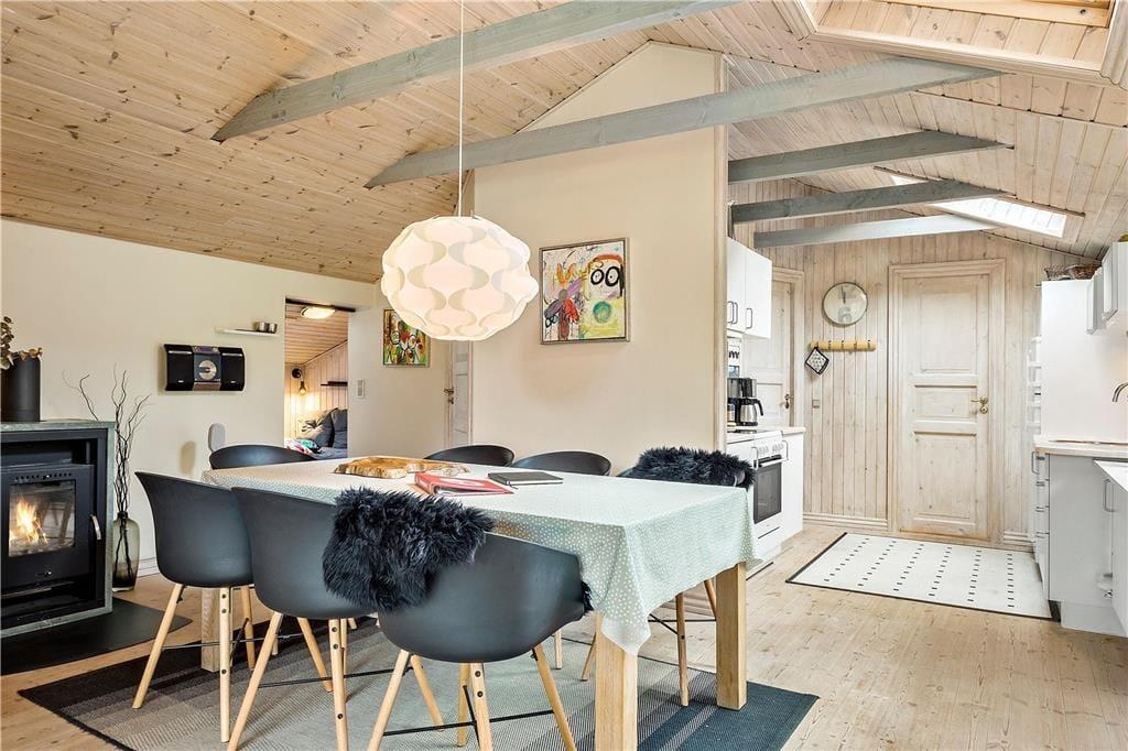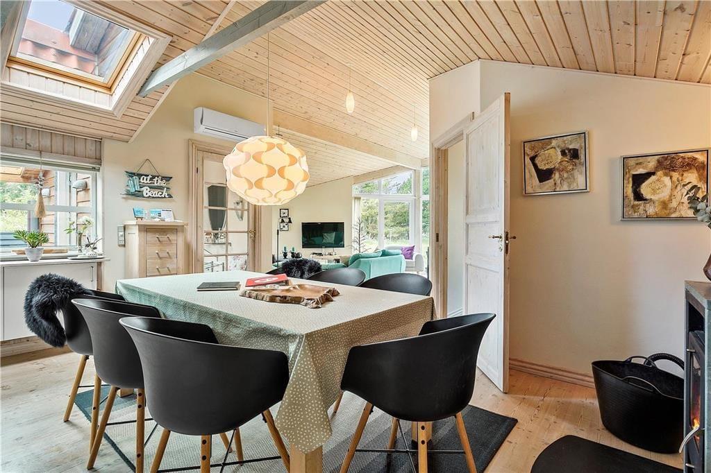 Når du træder ind i dette sommerhus, bliver du mødt af en varm og indbydende atmosfære. De lyse rum og den hyggelige indretning skaber den perfekte ramme om ferien, hvad enten du er her med familien eller gode venner. Hjertet i huset er opholdsstuen, hvor brændeovnen står klar til at sprede varme og hygge på kølige dage. Forestil dig at krybe sammen med en god bog, mens flammerne knitrer, eller samle dine nærmeste til en hyggelig spilleaften. Køkkenet er funktionelt og åbent, så madlavningen kan foregå i selskab med dem, du holder af. Efter en dag fyldt med oplevelser kan du trække dig tilbage til et af de komfortable soveværelser og lade roen falde på.