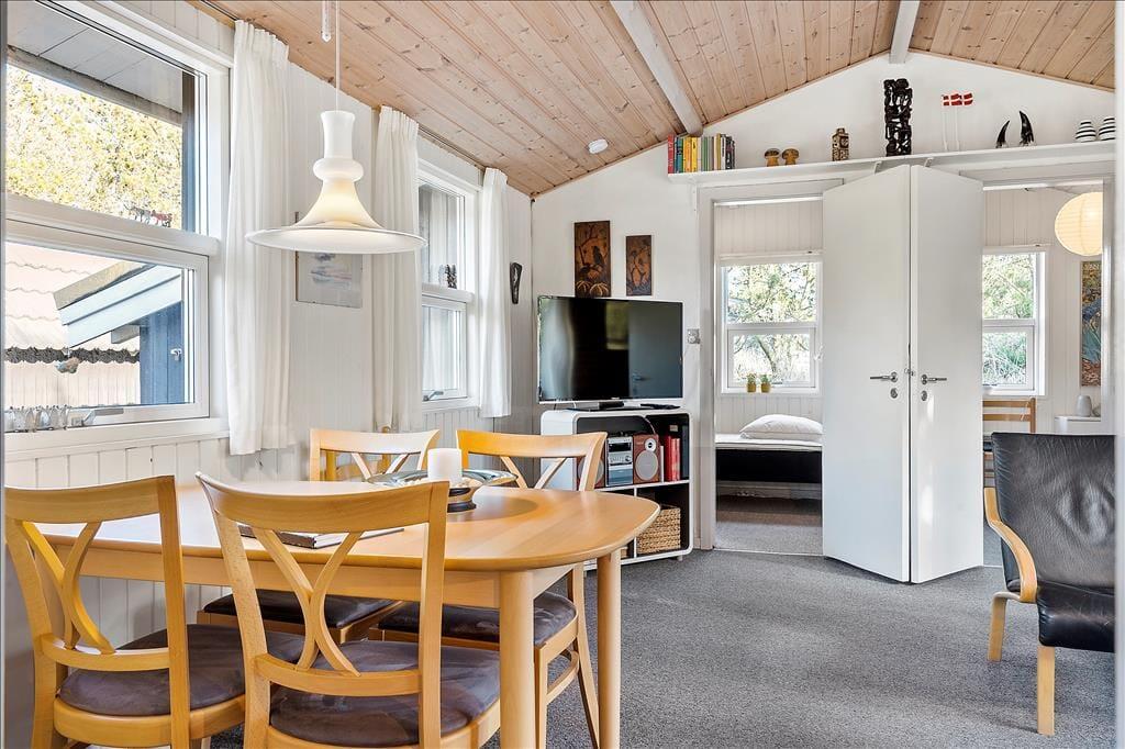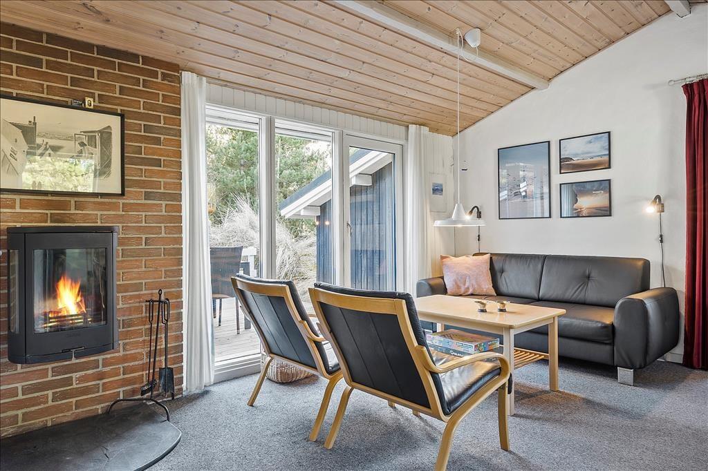 Indenfor mødes du af en varm og indbydende stemning, hvor brændeovnens knitrende ild sætter scenen for hyggelige aftener i godt selskab. Sommerhuset er pænt og velholdt med en indretning, der indbyder til afslapning og samvær. Efter en dag i den friske havluft er det rart at kunne synke ned i sofaen med en god bog eller nyde et måltid i den hyggelige spisestue. Køkkenet er praktisk og funktionelt, så du nemt kan tilberede alt fra morgenmad til lange middage med familie og venner. Her er der plads til fem personer, hvilket gør det til et oplagt valg for en mindre familie eller en vennegruppe, der ønsker at opleve Vestkystens rå og betagende natur.