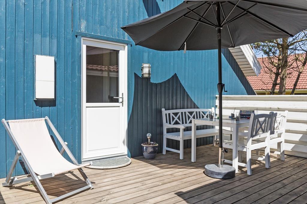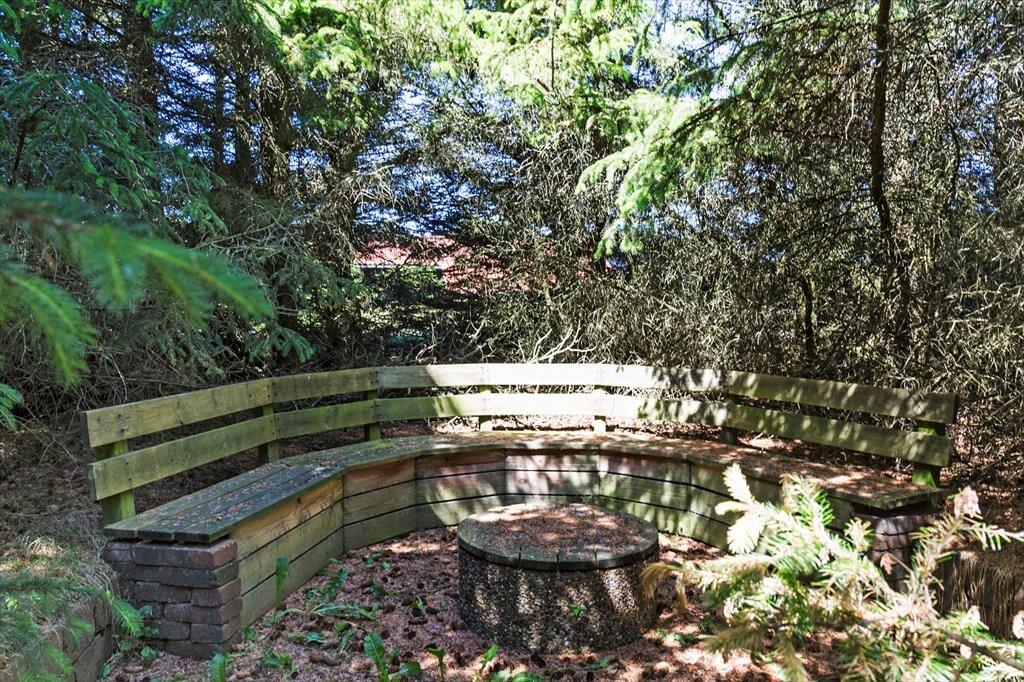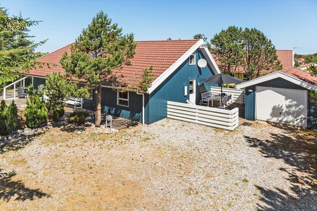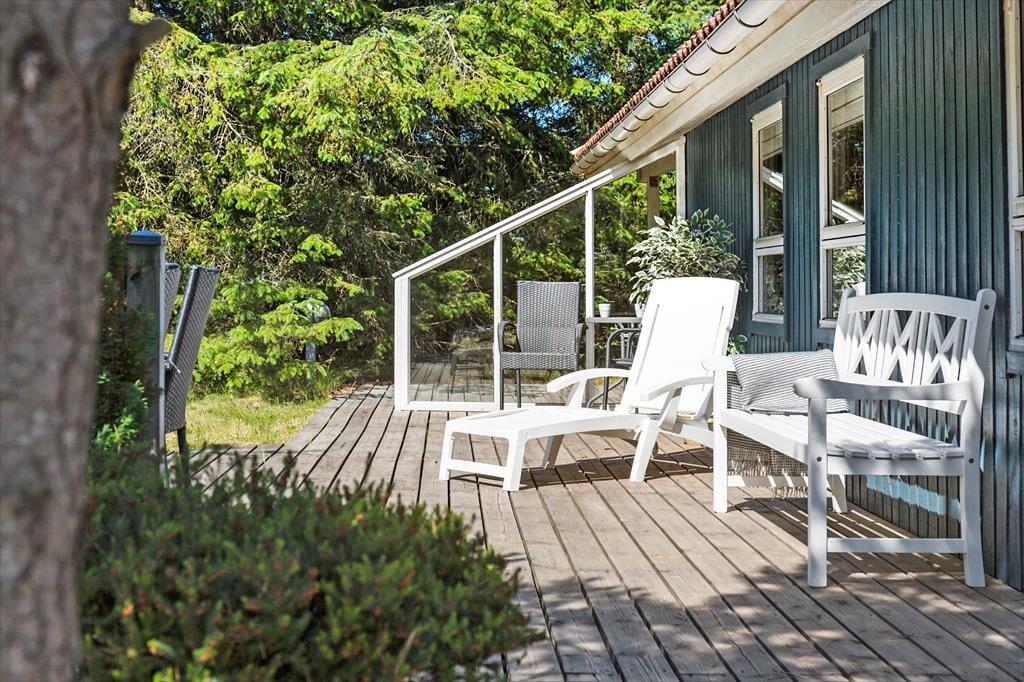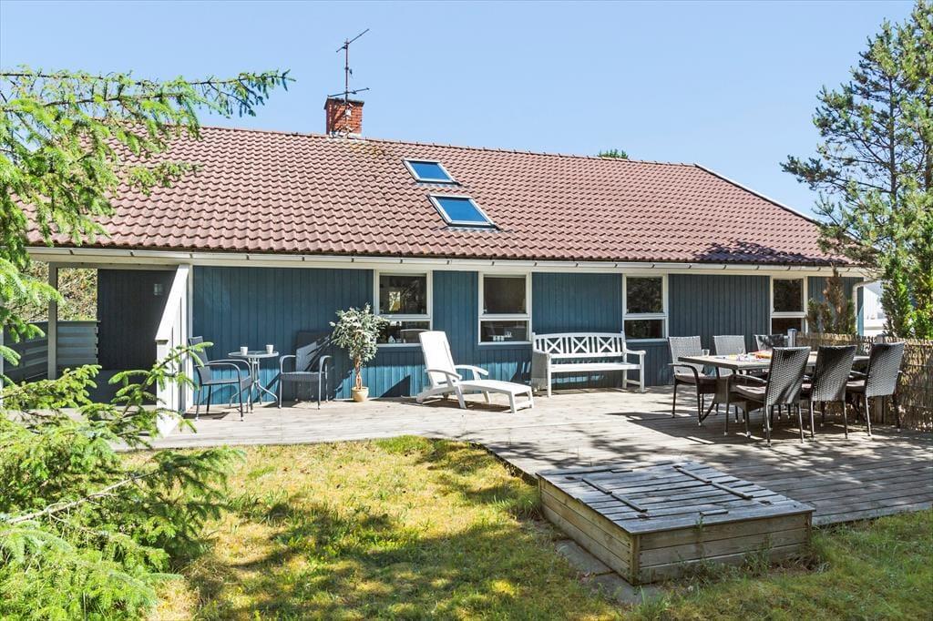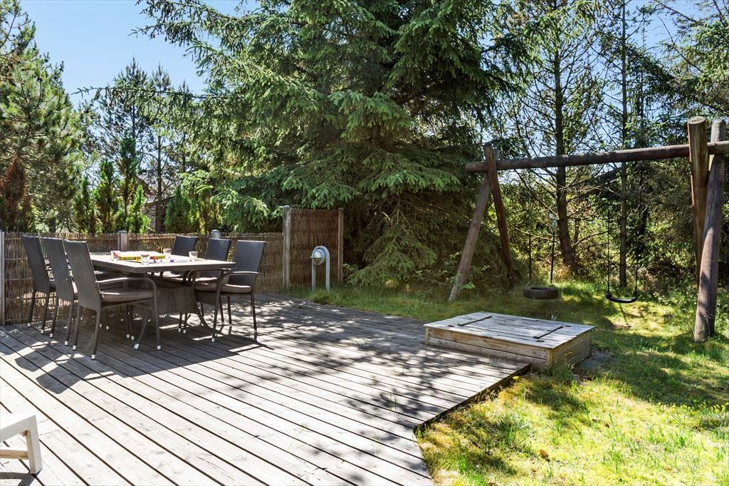 Sommerhuset ligger på en flot naturgrund. Der hører garage med til huset. Stor sydvendt terrasse, og dejlig aftenterrasse mod vest, som er delvist overdækket. Du har både havemøbler, liggestole, grill og parasol til rådighed under dit ophold. Der findes på grunden både gynge og sandkasse, og sommerhuset er hos klacificeret som værende specielt småbørnsvenligt.