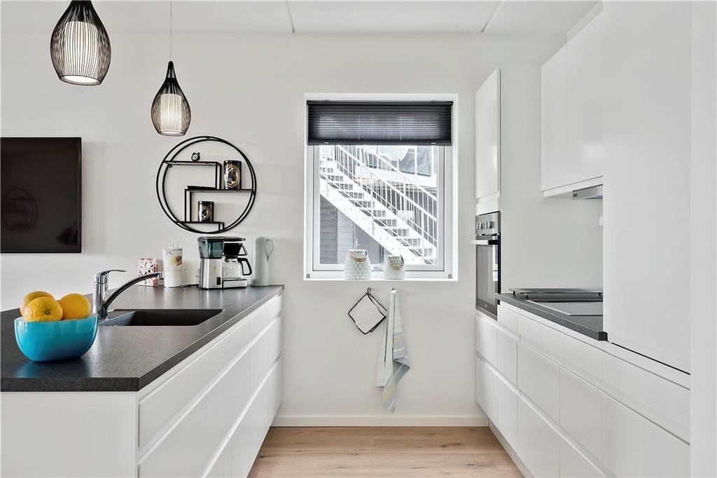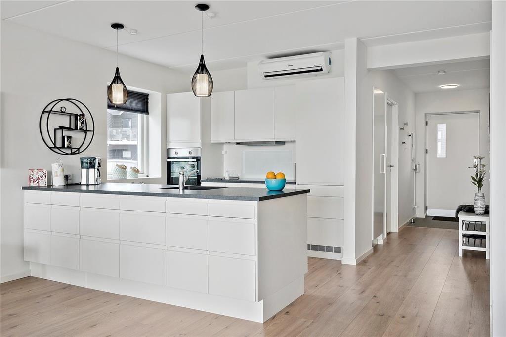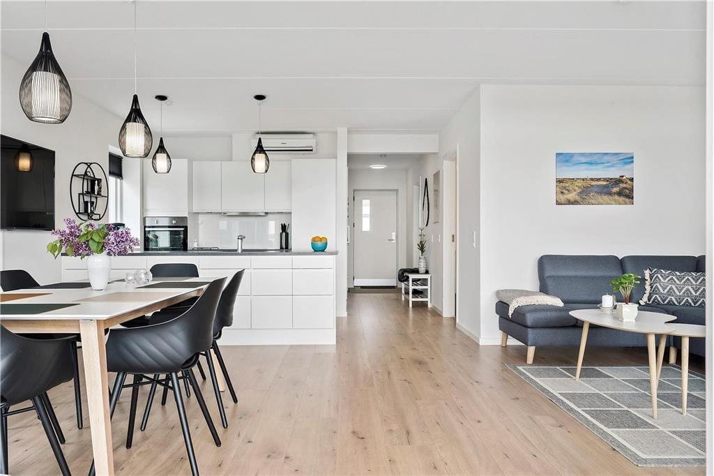 Træd ind i en verden af moderne hygge og sanselig elegance, hvor hvert rum emmer af omhyggeligt udvalgte detaljer og en atmosfære, der indbyder til afslapning og samvær. Den smagfulde indretning byder på lyse farver, bløde tekstiler og et velovervejet interiør, der sammen skaber et varmt og imødekommende miljø. Her mærkes den gennemtænkte kombination af stil og komfort, som gør det let at glemme hverdagens stress og jag. Du kan næsten fornemme den blide duft af nybrygget kaffe, der breder sig fra køkkenkrogen, mens du nyder udsigten mod det blå hav. Hver detalje, fra de hyggelige møbler til de fine kunstneriske elementer, er med til at gøre opholdet ekstra mindeværdigt. Samtidig sørger varmepumpen for en konstant behagelig temperatur, så du kan slappe helt af i det dejlige miljø, uanset årstid.