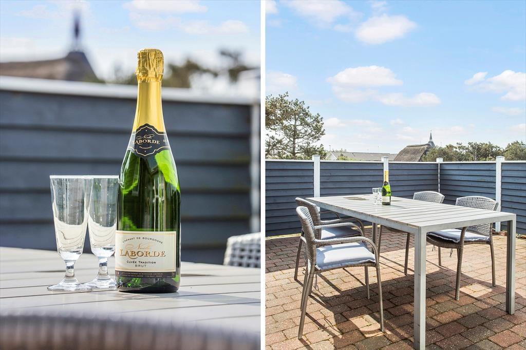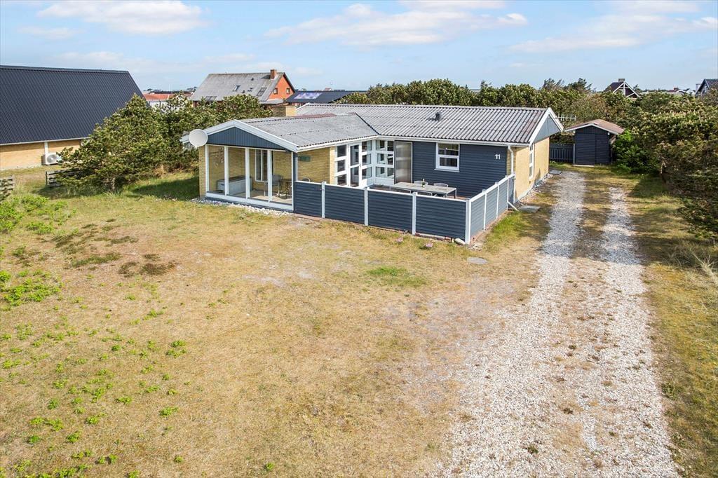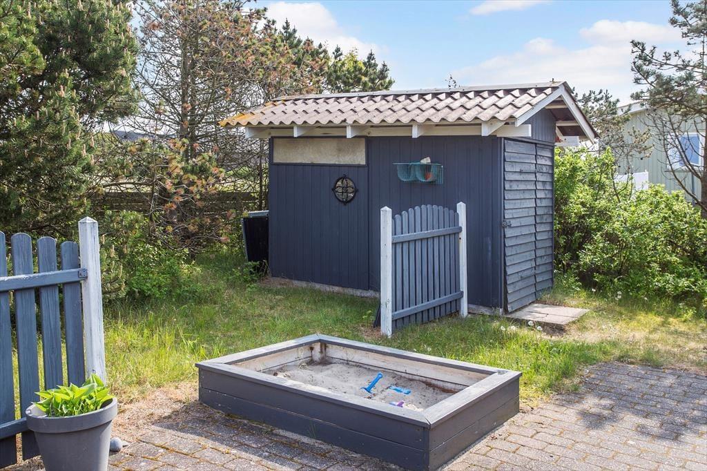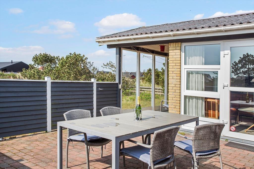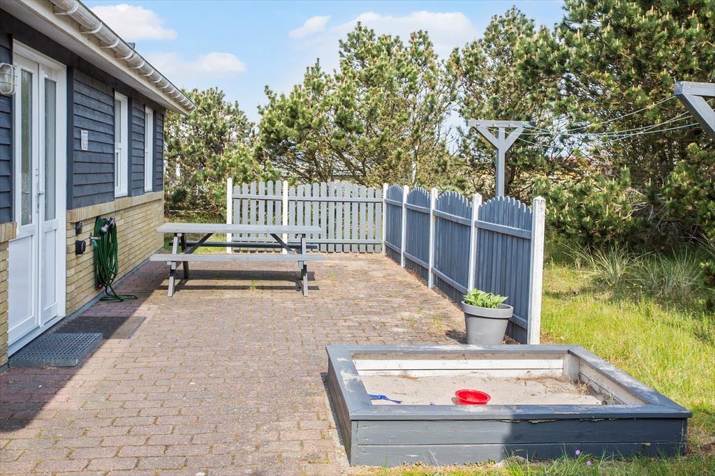 Udenfor åbner der sig et intimt og lukket terrasseområde, hvor du kan lade tankerne flyve frit og lade sanserne blive vækket af den skønne natur. Her er der plads nok til at nyde morgenkaffen i stilheden, mens du mærker solens blide stråler og lytter til de fjerne lyde fra naturen. Terrassen indbyder til hyggelige grillaftener og livlige snakke med familie og venner, mens du mærker den behagelige brise fra Vesterhavet. Det trygge og private uderum giver mulighed for at lege med børnene eller slappe af med en god bog i fred og ro – alt imens du kan lade dig forføre af den stemning, der kun findes i et autentisk sommerhusmiljø i Thy.