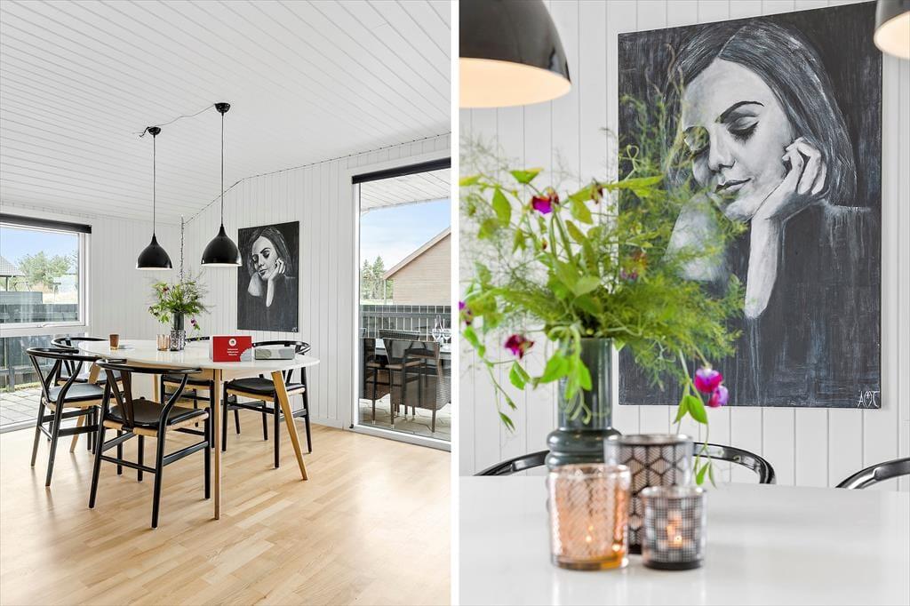 Træd indenfor i dette charmerende sommerhus, hvor den hyggelige indretning og den varme atmosfære straks omfavner dig. Her finder du en stue, der indbyder til lange, rolige stunder foran den knitrende brændeovn, som ikke blot skaber varme på de køligere aftener, men også er med til at forme en stemning af hjemlig hygge og samvær. De bløde farver og de nøje udvalgte møbler bidrager til en følelse af komfort og nærvær, hvor du let kan mærke, at alle detaljer er med til at understrege den intime atmosfære. Hver eneste krog i huset emmer af personlighed og omtanke, hvilket gør det nemt for dig at forestille dig lange samtaler, hyggelige film-aftener eller stille stunder med en god bog i hånden.