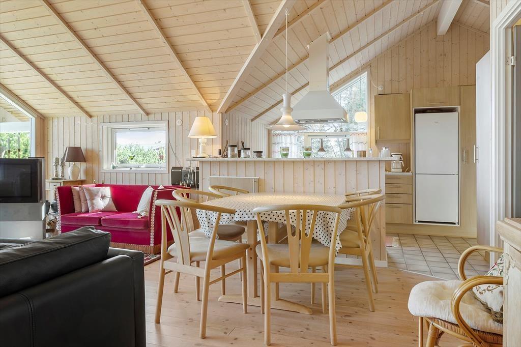 Træd ind i et lyst og godt indrettet sommerhus, der med sin rummelige stue, der er åben mod køkkenet, skaber de perfekte rammer for hyggelige stunder sammen. Med plads til seks personer og ikke mindst to hunde, er der tænkt på hele familien. Brændeovnen står klar til at sprede varme og hygge på køligere dage, mens den knitrende lyd af brænde tilføjer en ekstra dimension af ro. Forestil dig de afslappende aftener, hvor brændeovnens skær oplyser stuen, mens du nyder den særlige stemning, der kun findes i et ægte sommerhus.