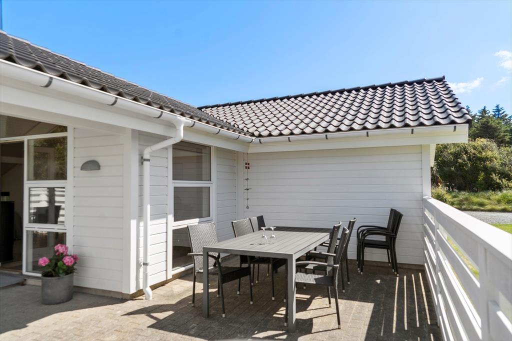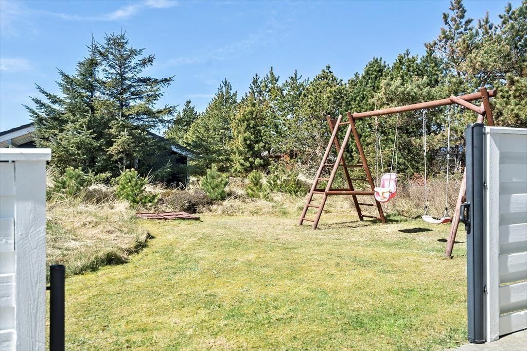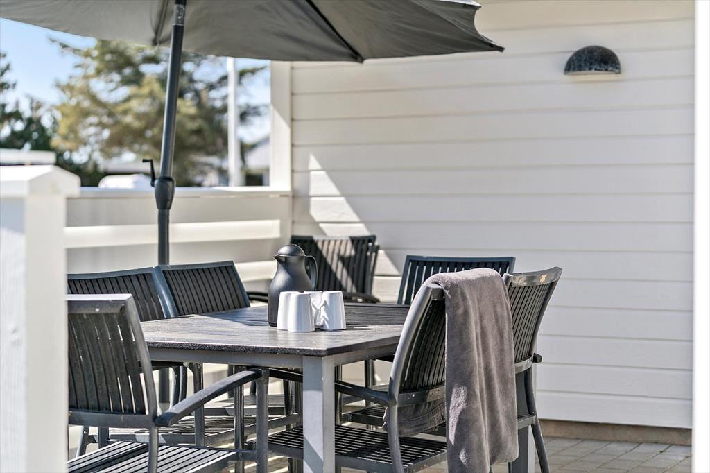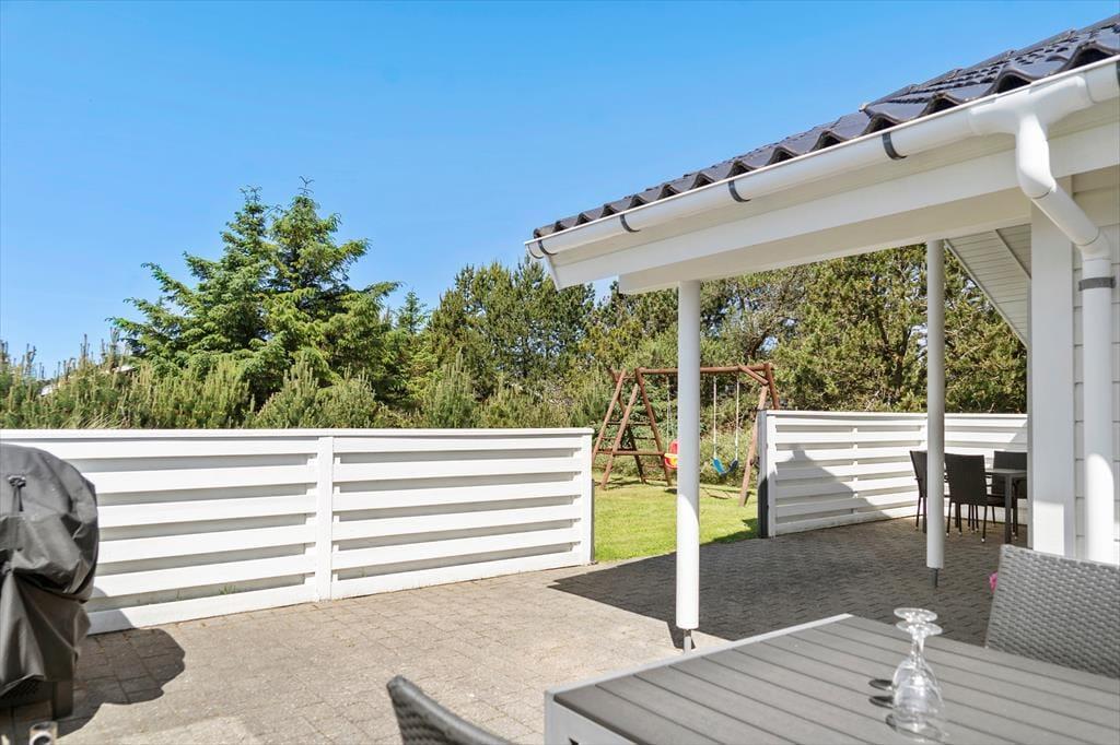 Selv om det indre af sommerhuset opfordrer til hygge og afslapning, er udelivet mindst lige så fristende. Fra stuen kan du træde direkte ud på en skøn terrasse, hvor frokostbordet i sommersolen kan blive dagens højdepunkt, og hvor du kan lade dig omfavne af den friske, vestjyske havluft. De omkringliggende klitlandskaber og den rolige atmosfære vidner om, at du her befinder dig i et af Danmarks mest naturskønne områder. Haven indbyder til leg og latter; mens børnene boltrer sig i græsset, kan de voksne nyde en stille stund med en kop kaffe og lade tankerne vandre. Med en enkel gang- eller cykeltur når du lynhurtigt ud i klitterne, hvor du kan lade vinden i håret og smagen af salt på læberne minde dig om, hvor tæt du er på det brusende Vesterhav. Når aftenroen sænker sig, er terrassen det perfekte sted at samle alle til et grillmåltid i solnedgangens bløde skær, inden I trækker jer tilbage til varmen indendørs.
