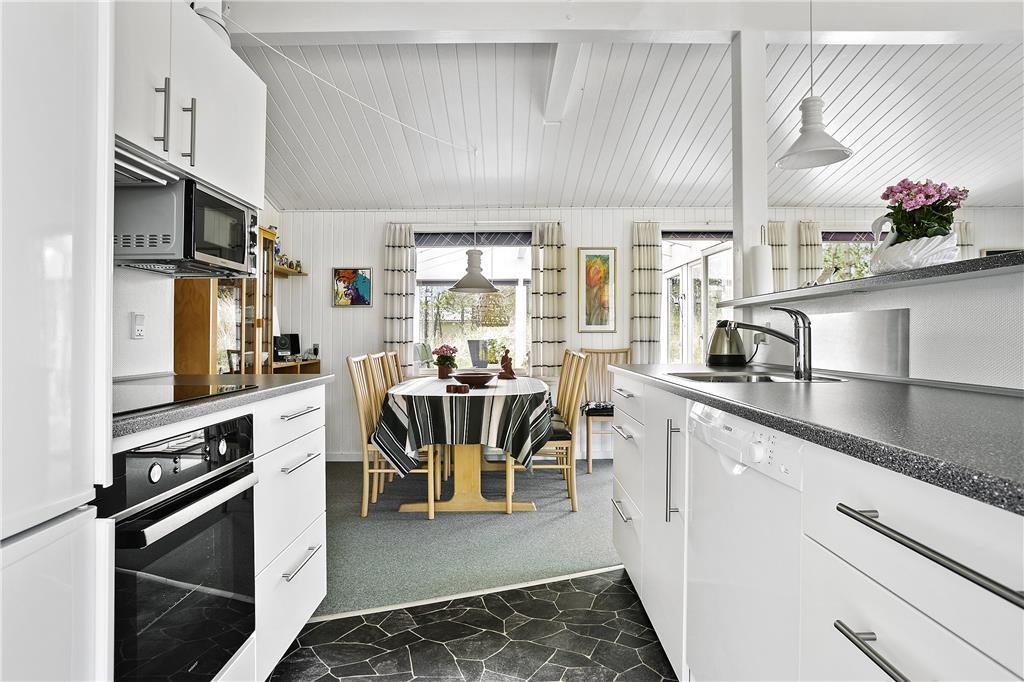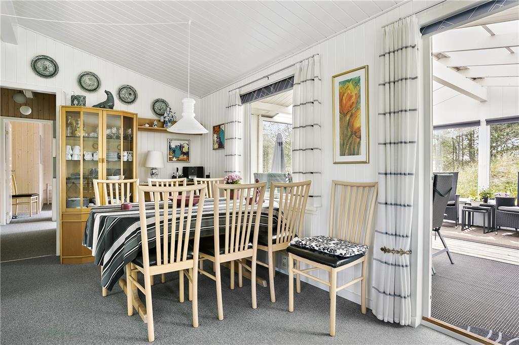 Når du træder ind i dette charmerende sommerhus, mødes du af en varm og indbydende stemning, der straks får skuldrene til at sænke sig. Det hyggelige opholdsrum er indrettet med komfortable møbler og masser af lysindfald fra de store vinduer, og brændeovnen udgør det naturlige samlingspunkt på kølige aftener. Her kan I lade ilden knitre, mens I fornemmer varmen brede sig, og nyde en god bog eller hyggelige samtaler over et glas vin. I den generøse spisestue kan I samles om måltiderne og diskutere dagens oplevelser ved havet eller i Nationalpark Thy, som ligger lige i nærheden. Alt i huset er indrettet med tanke på at skabe en rar og hjemlig atmosfære, hvor både familie og venner kan finde ro og nærvær. Og med muligheden for at have alle husdyr med, kan din firbenede ven også være en del af feriefællesskabet. Her er der med andre ord lagt op til skønne dage fulde af samvær og afslapning, uanset om vejrudsigten byder på solskin eller en køligere brise.