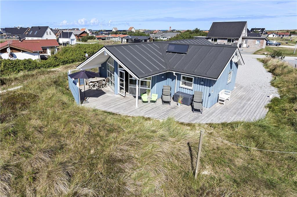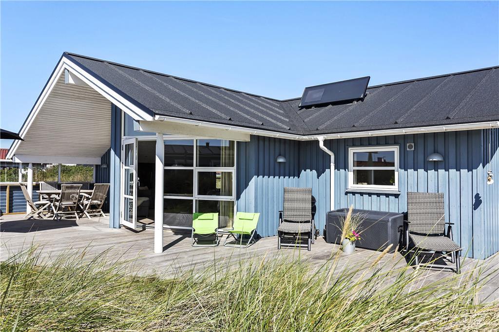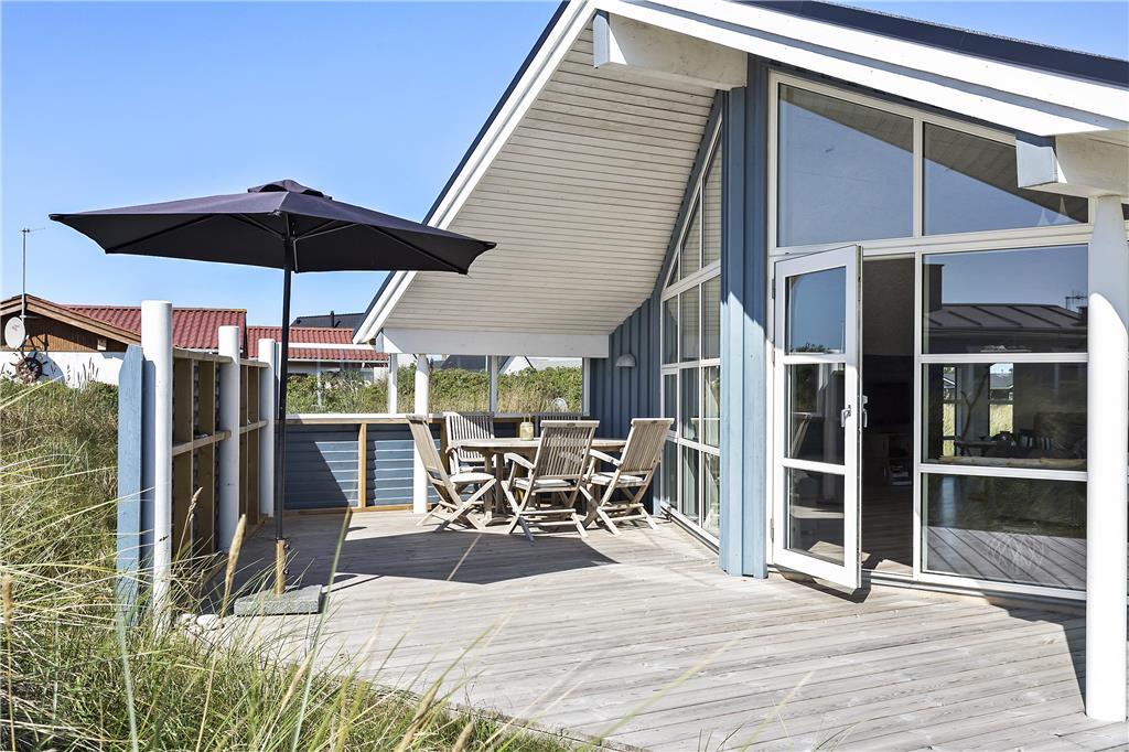 Udenfor fortsætter oplevelsen med en indbydende terrasse, der er lige så smukt og velindrettet som husets interiør. Forestil dig solrige dage, hvor du nyder en kop kaffe eller et glas vin i den friske luft, mens du lader tankerne flyve frit. Den rummelige terrasse byder på plads til både afslapning og sociale stunder, hvor du kan mærke vinden fra Vesterhavet og høre naturens stille symfoni. Her kan du arrangere grillfester eller hyggelige sammenkomster, hvor latter og gode minder bliver en del af den daglige oplevelse. Den smukke udsigt og den nøje udformede udendørs indretning skaber en perfekt balance mellem luksus og naturlig skønhed, så du kan nyde livet i fulde drag.