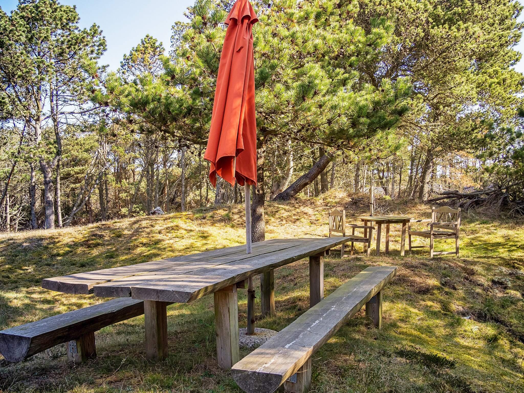 Den 13 m2 glaserede veranda giver et beskyttet rum til køligere aftener og fører direkte til haven, hvor en grill er tilgængelig. Ejendommen er omgivet af træer og naturlig beplantning og byder på en ægte naturoplevelse samtidig med, at den giver læ for vinden. Sommerhuset har en fredelig beliggenhed på en sidevej i et attraktivt og naturskønt område nær Sdr Vorupor, kendt for sin unikke kystcharme.