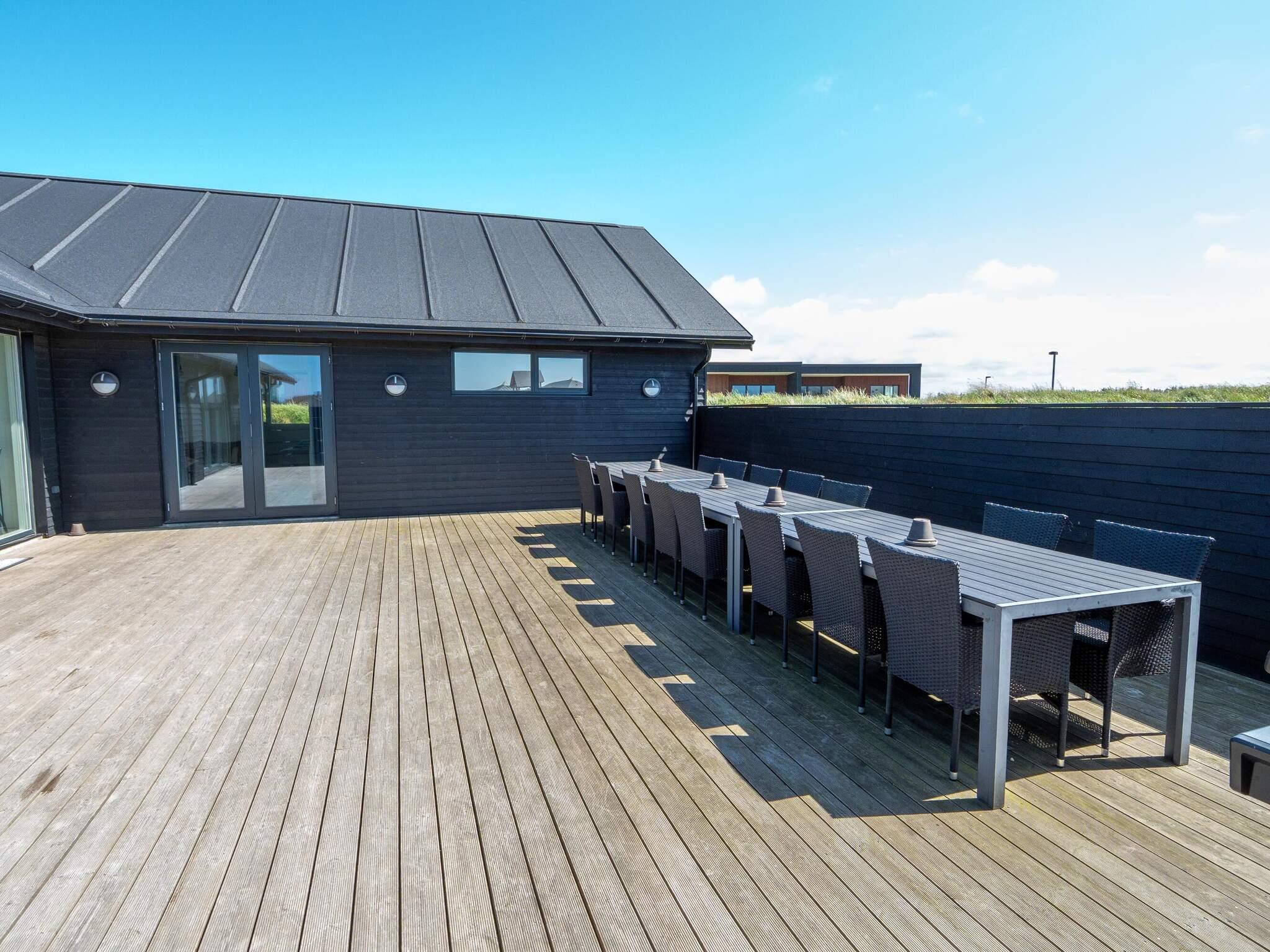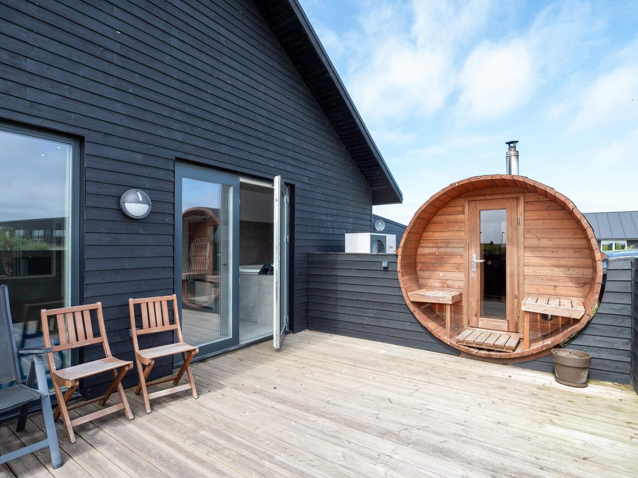 Udendørs er der plads til måltider og hygge på stor terrasse langs med huset med adgang fra både aktivitetsrum og spisestue. I finder også en lukket terrasse fra poolrummet med udendørs sauna og havemøbler. Tøndesaunaen varmes op med brændeovn.