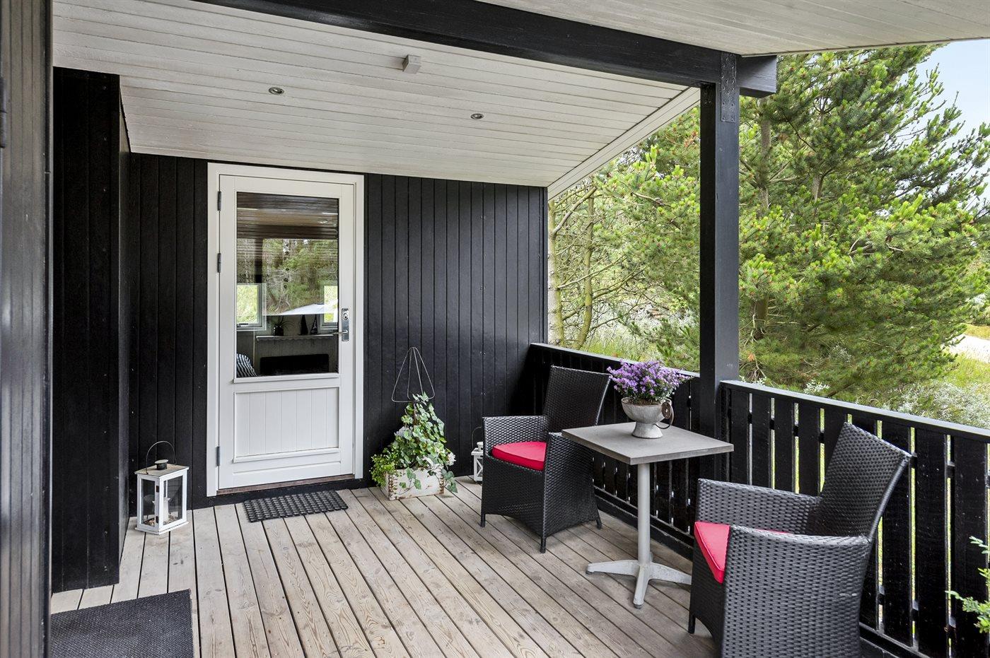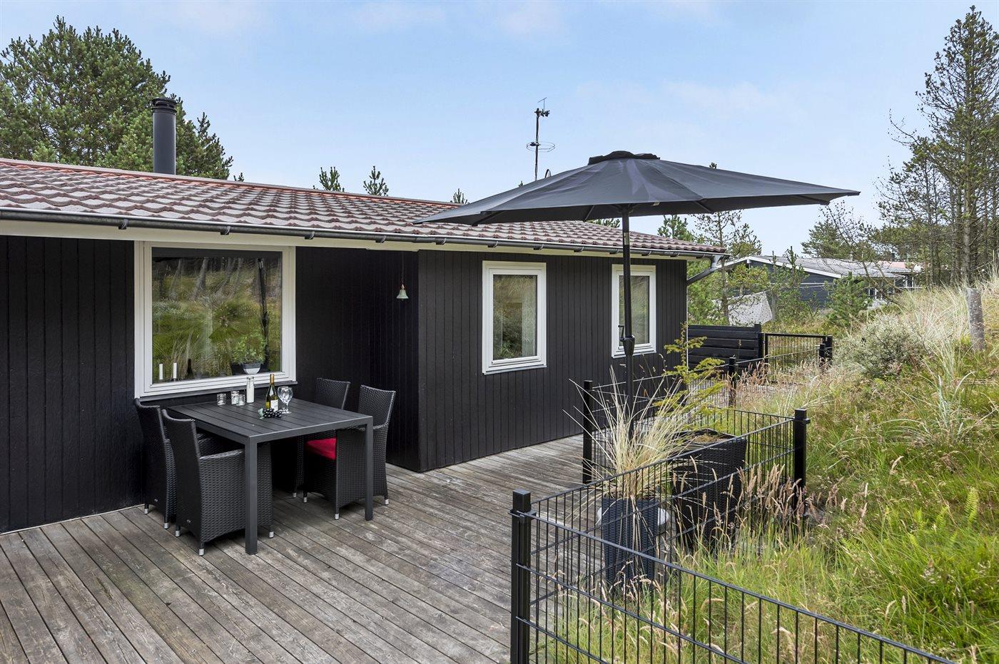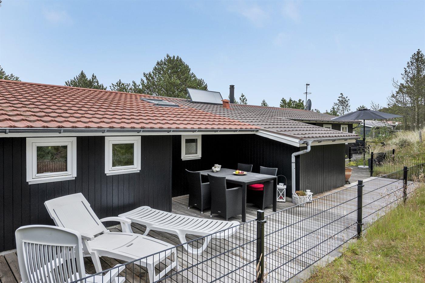 Ferieboligen er beliggende på en 1400 m² stor klitgrund. Der er 1700 m til havet. Nærmeste forretning er beliggende i en afstand af 1500 m. Til ferieboligen hører 61 m² terrasseareal. Desuden er der 13 m² overdækket terrasse. Heraf i alt 74 m² lukket terrasse. Der er redskabsrum. Sandkasse. Der er 2 grill til rådighed. (Én til kul og én til gas). Parkering ved ferieboligen.