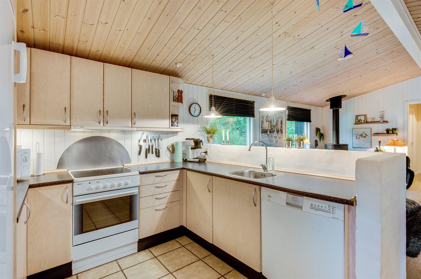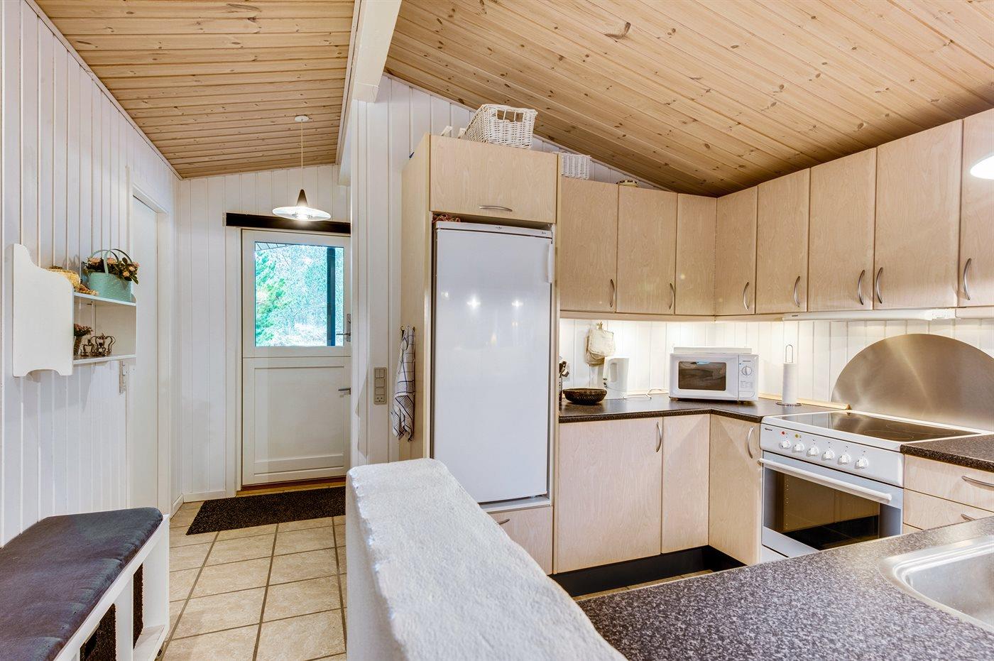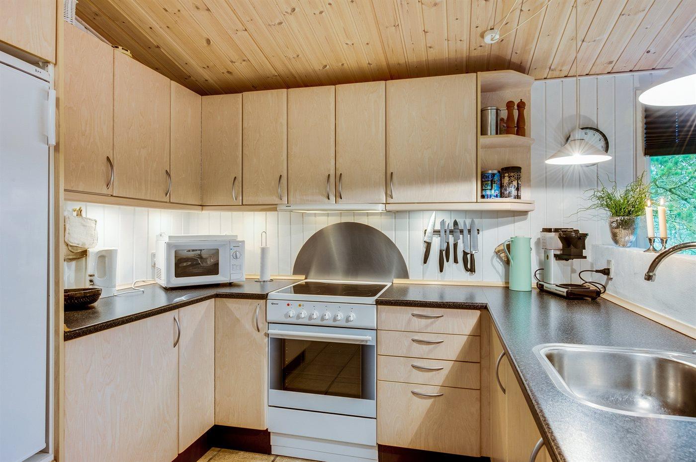 Køkkenet er udstyret med 1 køleskab. Der er 4 keramiske kogeplader, bageovn, mikrobølgeovn samt opvaskemaskine.