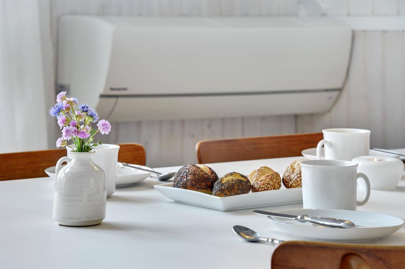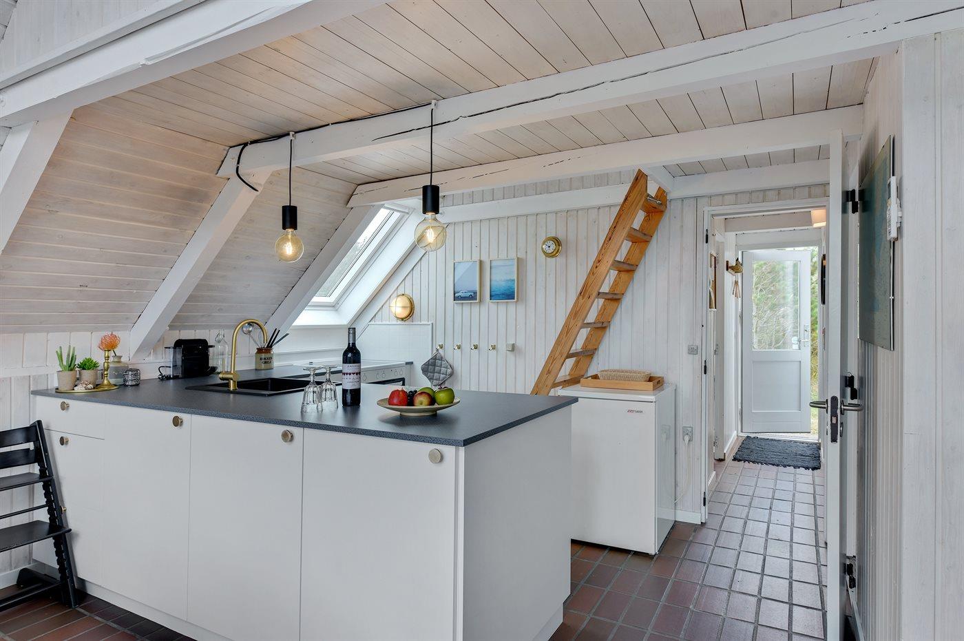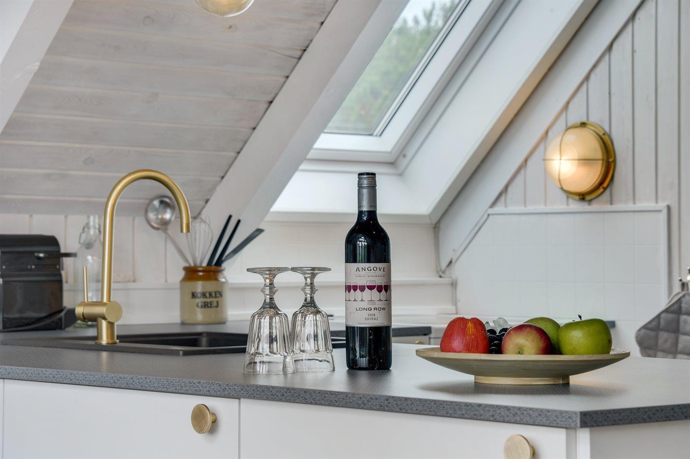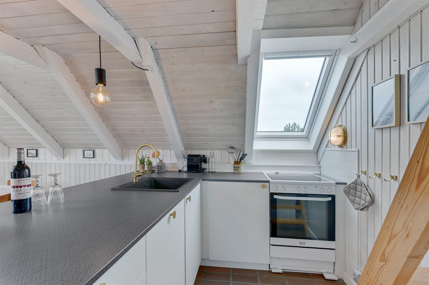 Køkkenet er udstyret med 1 køleskab. Der er 4 keramiske kogeplader, varmluftovn samt opvaskemaskine.