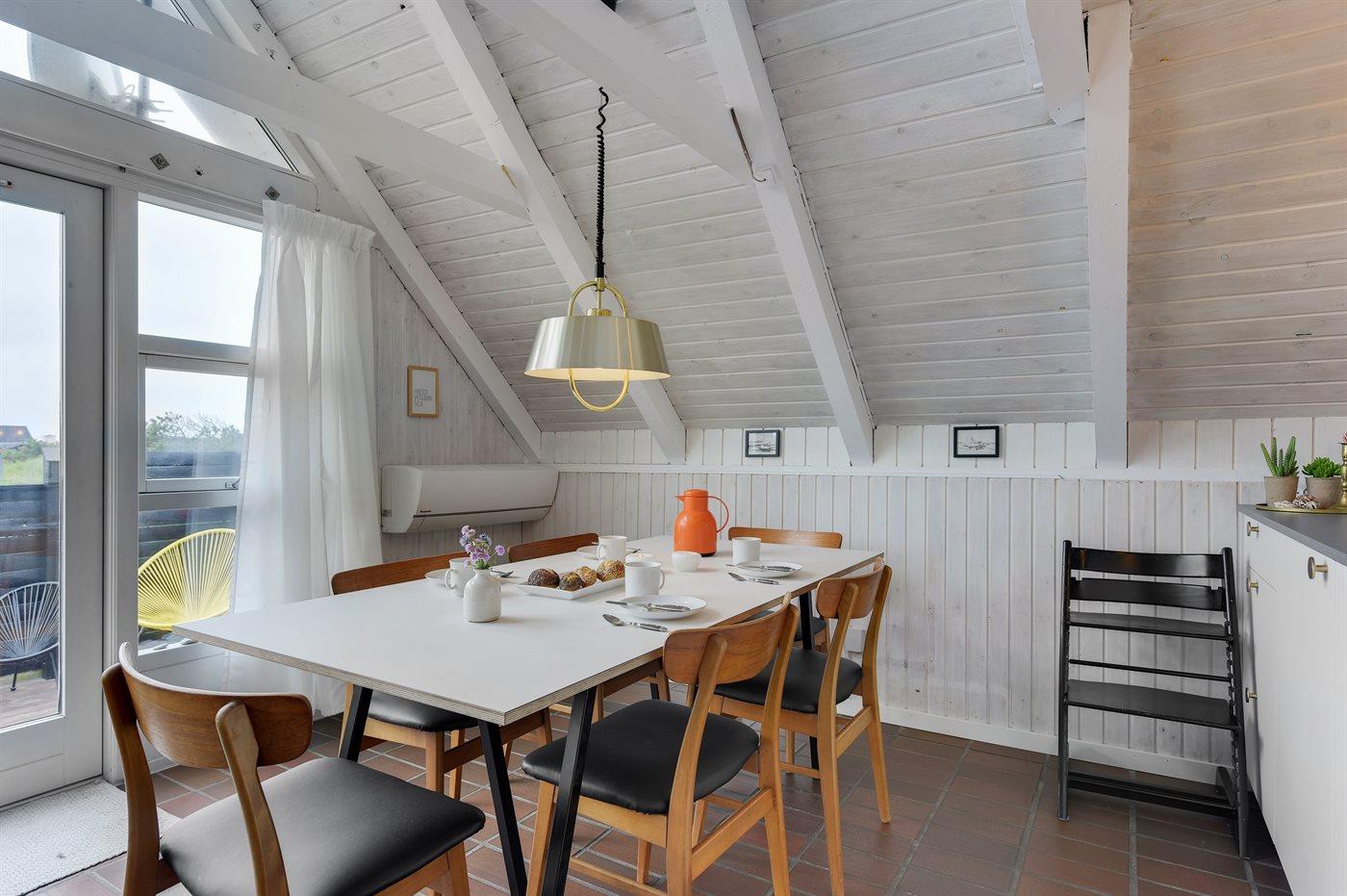 Hyggeligt sommerhus med en virkelig attraktiv beliggenhed i klitterne helt ud til et fredet naturområde og havet med tilhørende skønne terrassearealer med gode læforhold. Der er havudsigt fra husets 1. sal. Huset er indrettet lyst med adgang til hems, hvor 2 af sovepladserne befinder sig.
