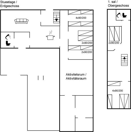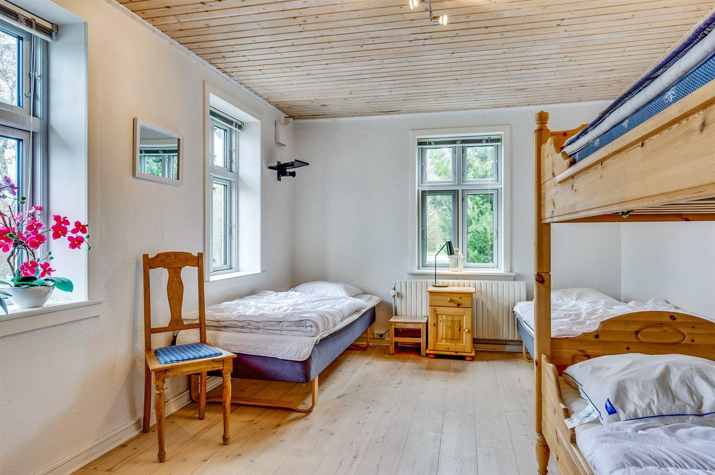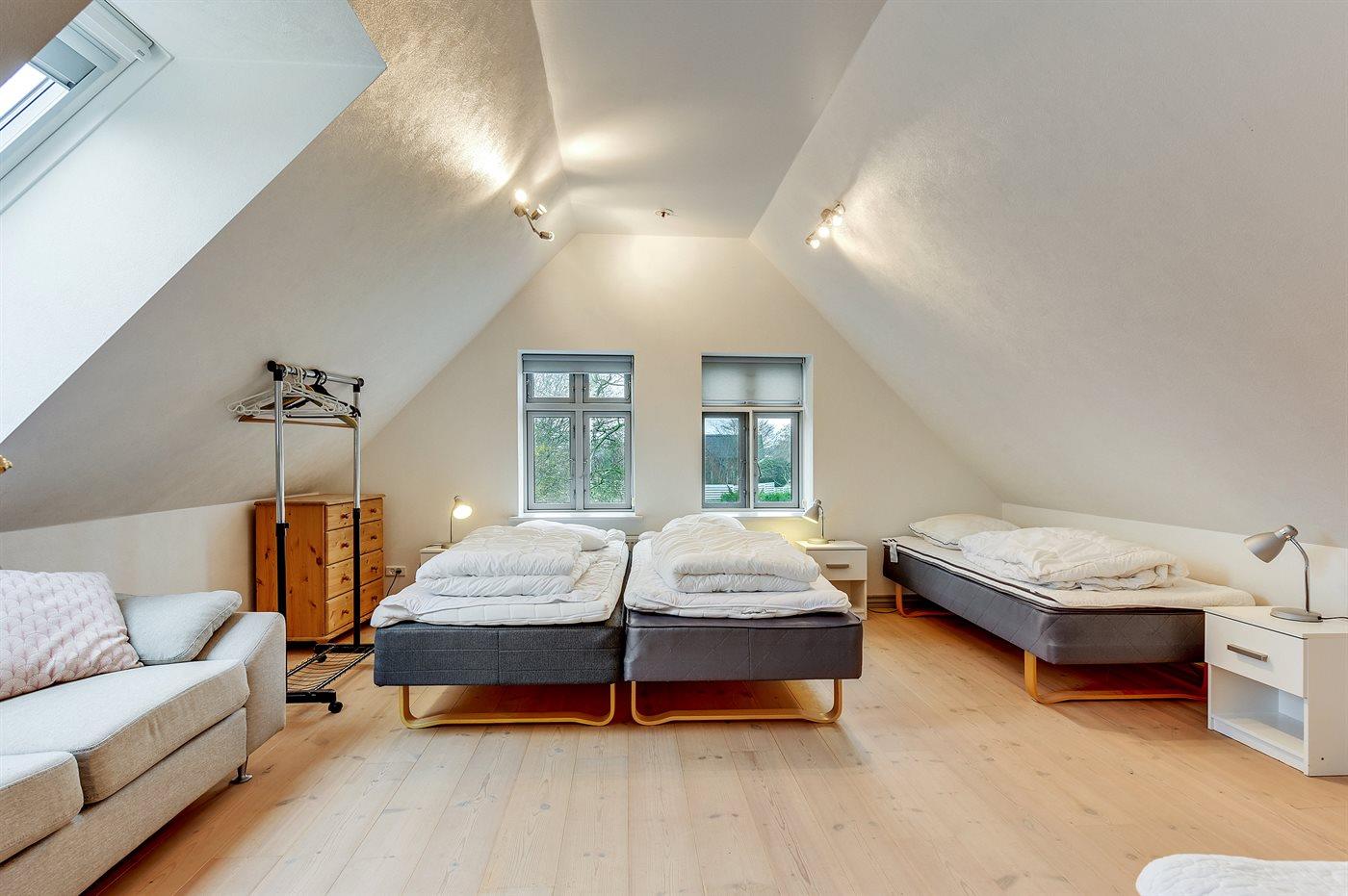 Der er i alt 5 soveværelser. Sovepladserne fordeler sig på: 6 sovepladser i dobbeltsenge. 8 sovepladser i enkeltsenge. Derudover er der 1 stk. barneseng.