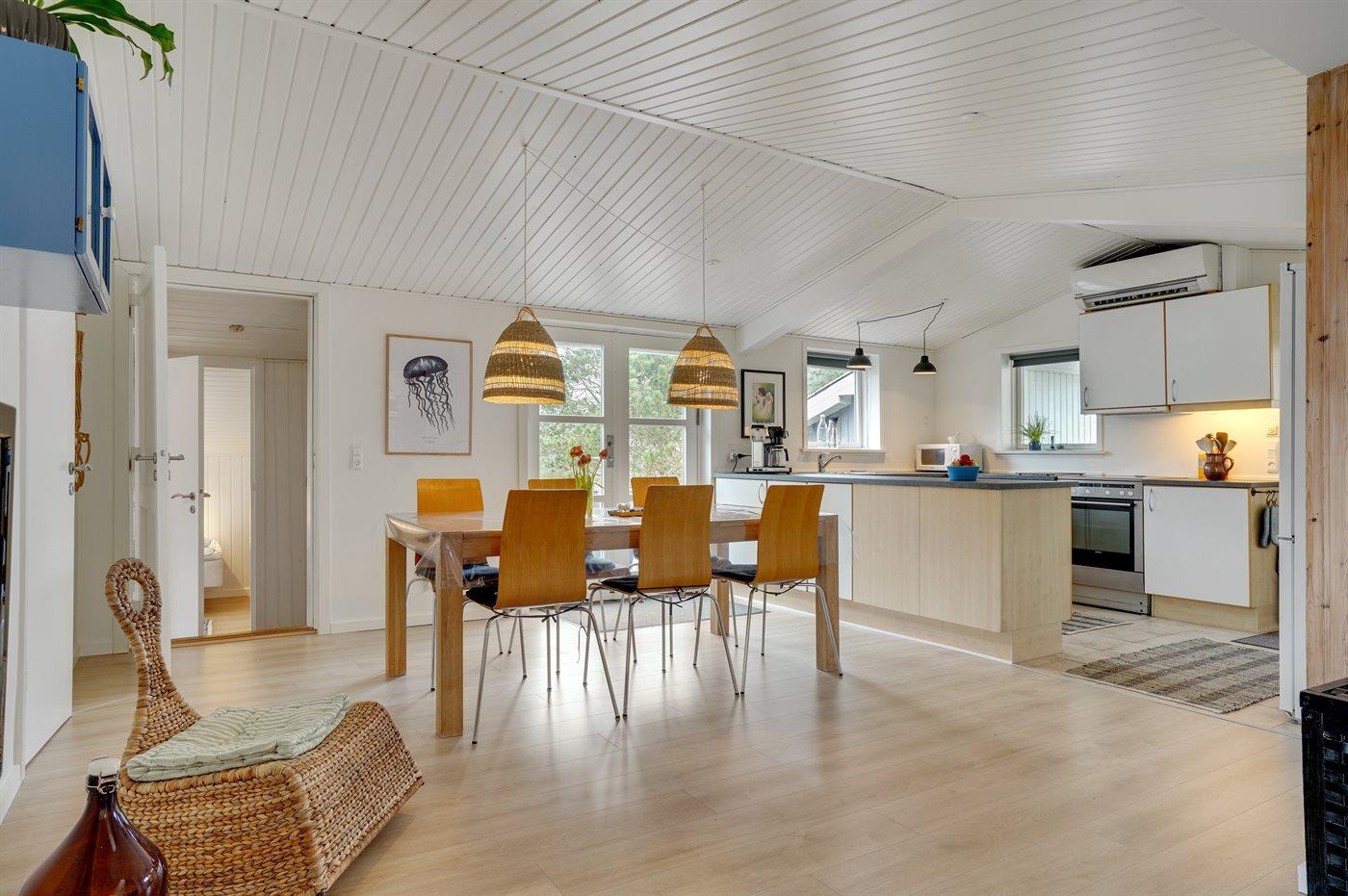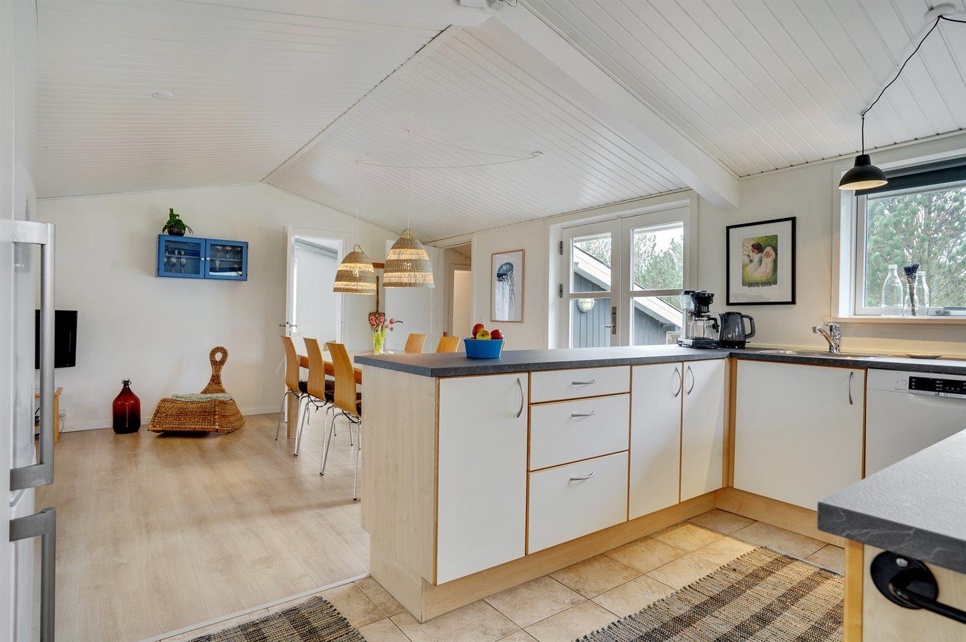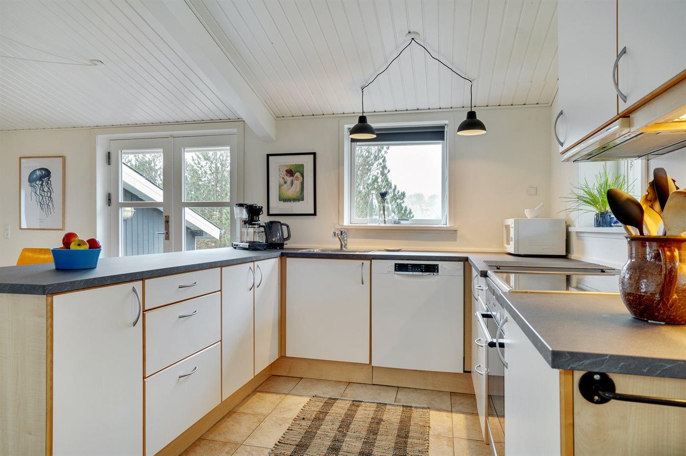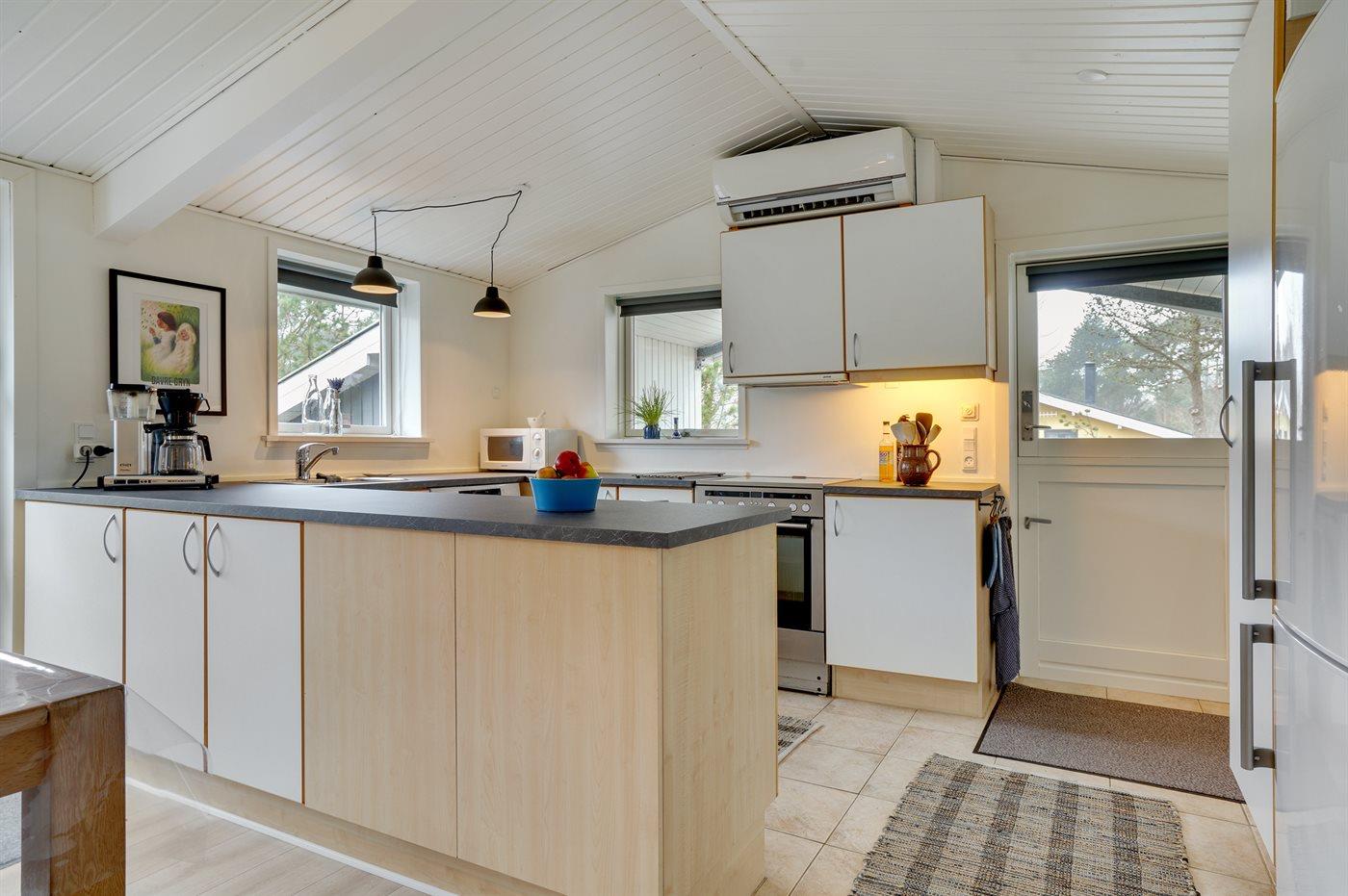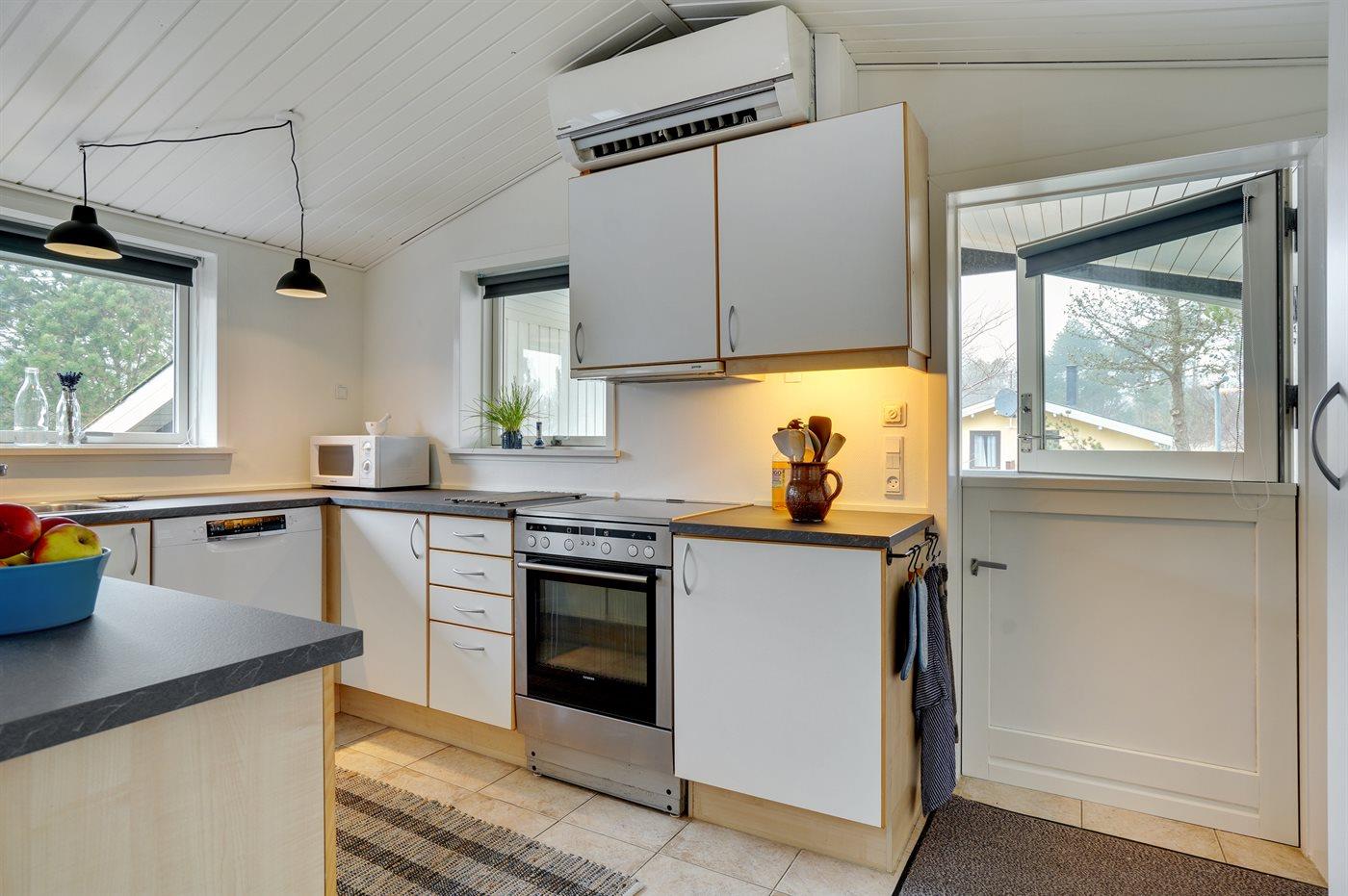 Køkkenet er udstyret med 1 køleskab. Der er 4 keramiske kogeplader, varmluftovn, mikrobølgeovn samt opvaskemaskine.