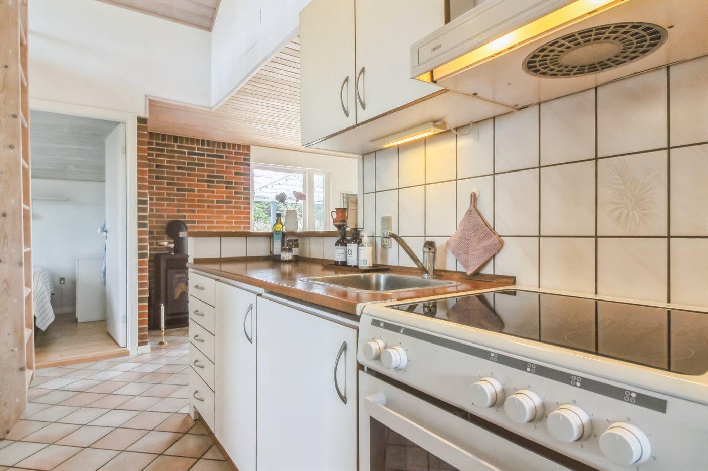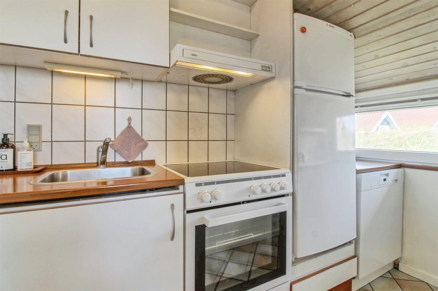 Køkkenet er udstyret med 1 køleskab. Der er 4 keramiske kogeplader, varmluftovn samt opvaskemaskine.