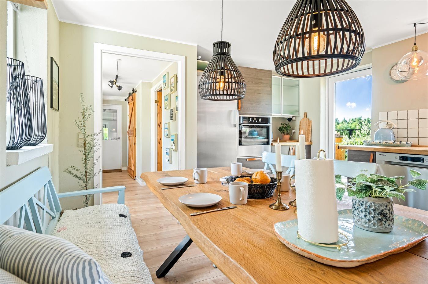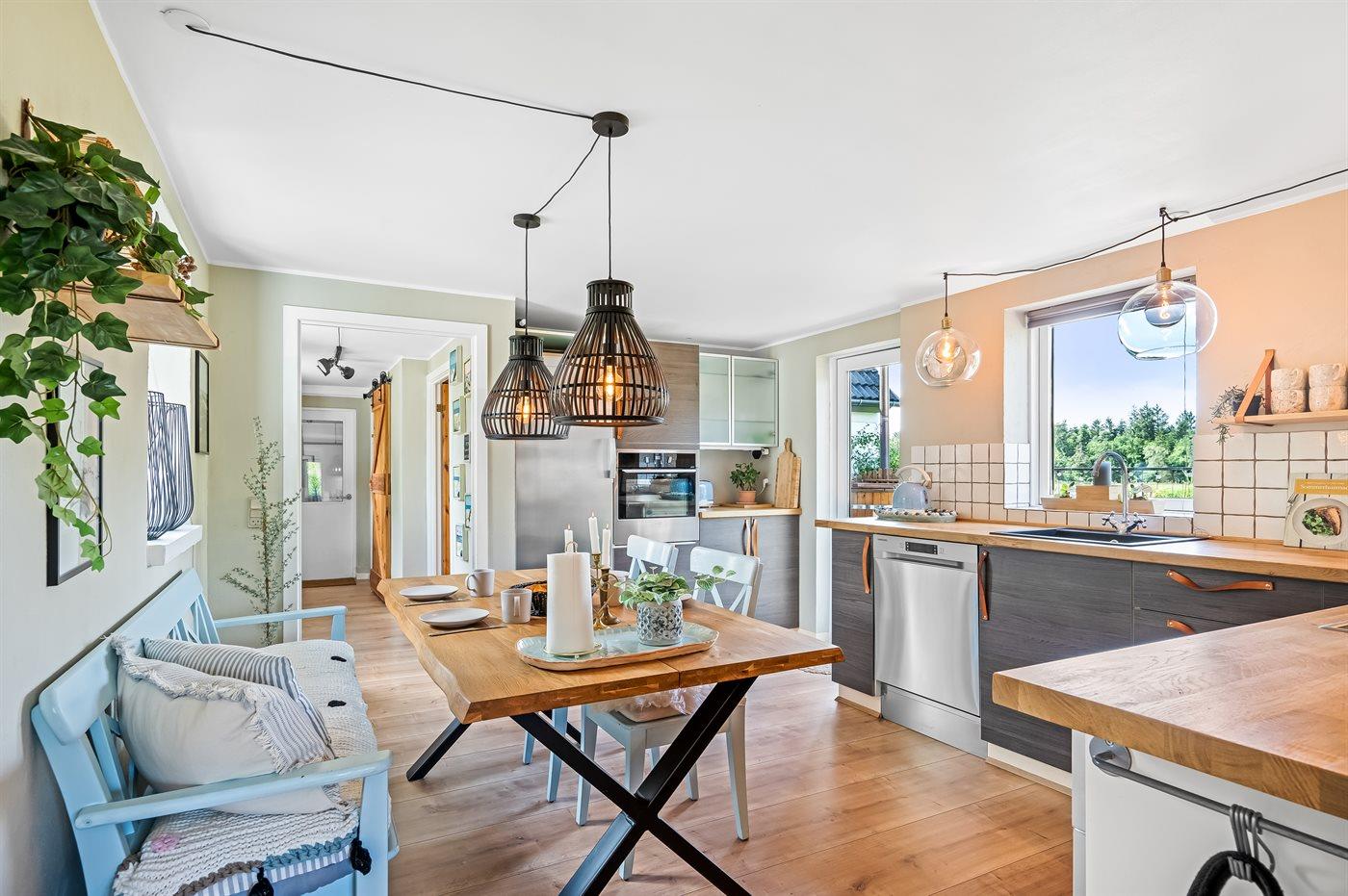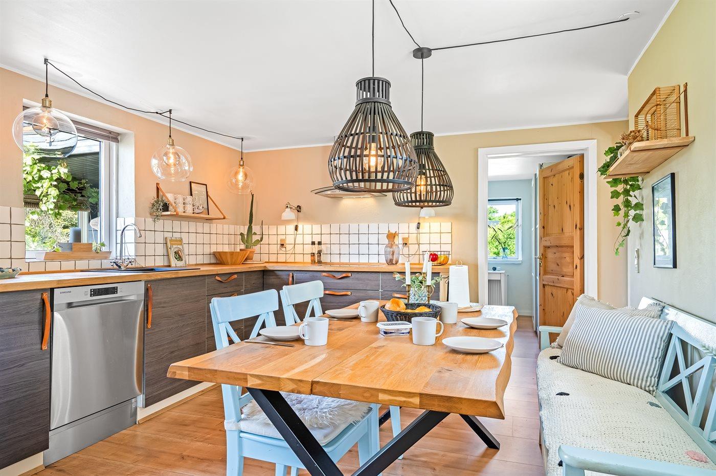 Køkkenet er udstyret med 1 køleskab. Der er 4 keramiske kogeplader, varmluftovn, mikrobølgeovn samt opvaskemaskine Der er gulvvarme i køkkenet.