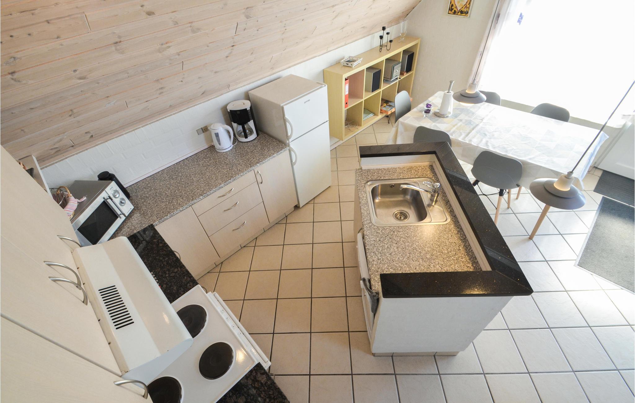 Det åbne køkken har opvskemaskine, kaffemaskine og mikroovn. Her kan I tilberede feriens måltider, eller I kan vælge at anvende grillen på den overdækkede terrasse. Her kan I også nyde morgenkaffen eller et glas vin på de lune sommeraftener. Fra terrassen kan I også nyde udsigten over det smukke landskab.