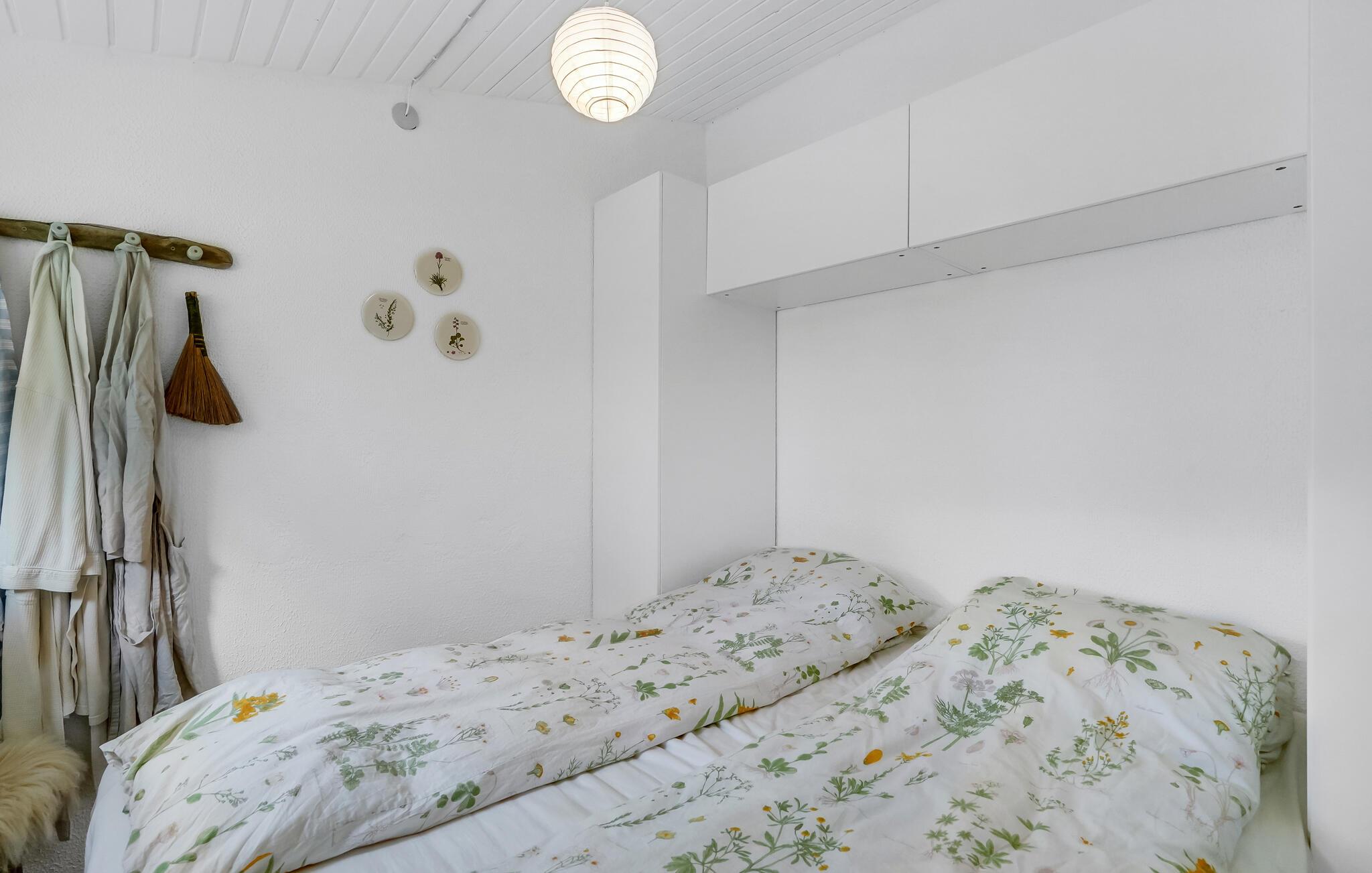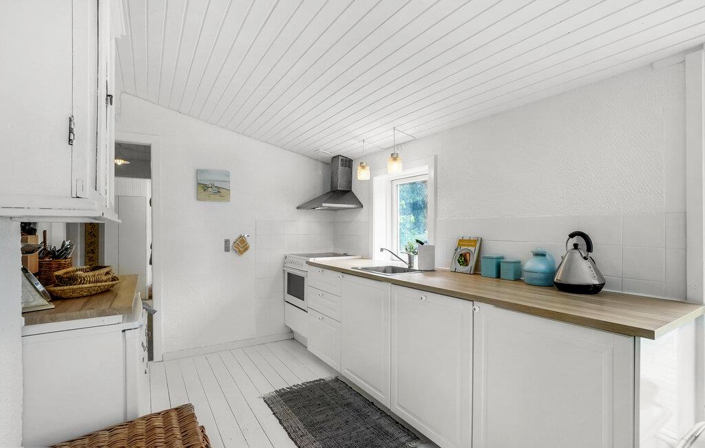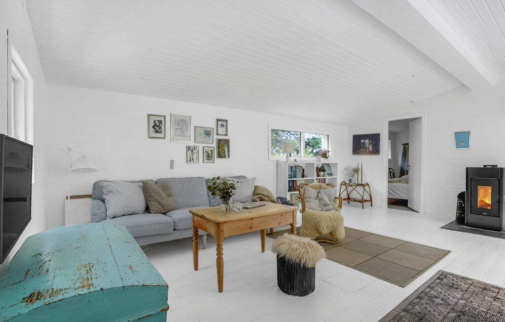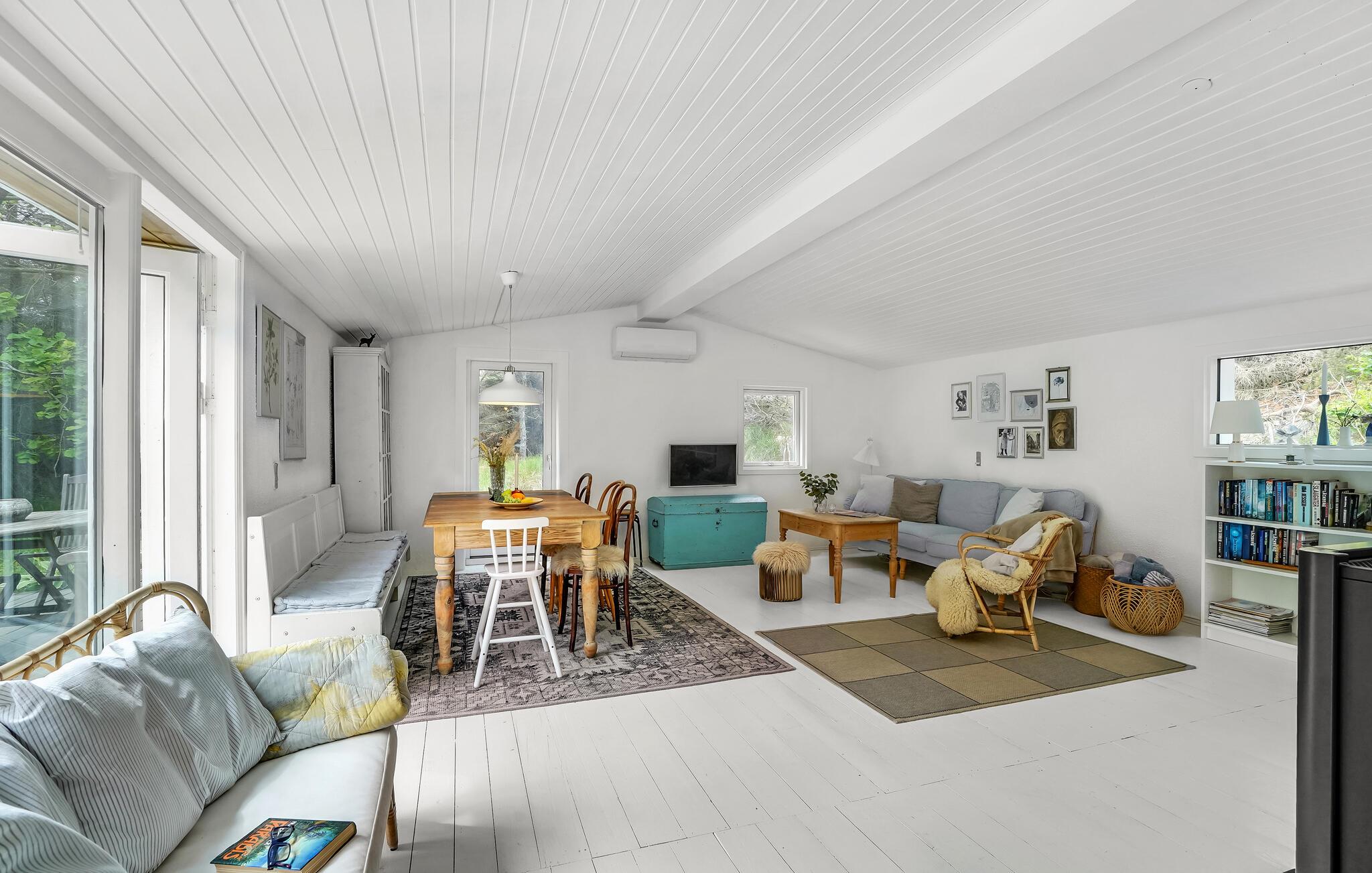 Dette skønne sommerhus egner sig perfekt til en familieferie eller en hyggelig tur for en vennegruppe. Huset er lyst og skandinavisk indrettet, og de harmoniske rammer gør det nemt at sænke skuldrene, slappe af og indstille tankerne på ferie. Den hvide træbeklædning gør det dejligt lyst indenfor, også på overskyede dage, og brændeovnen bidrager med hyggelig varme på kølige aftener. Lad børnene lege i haven, mens I solbader på terrassen og lytter til lyden af ??vinden og bølgerne.
