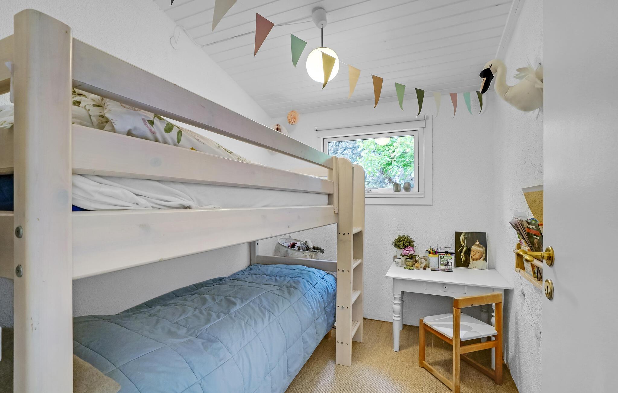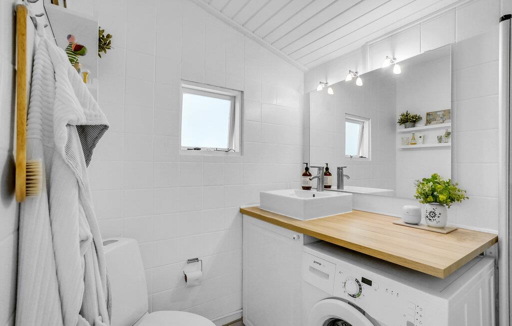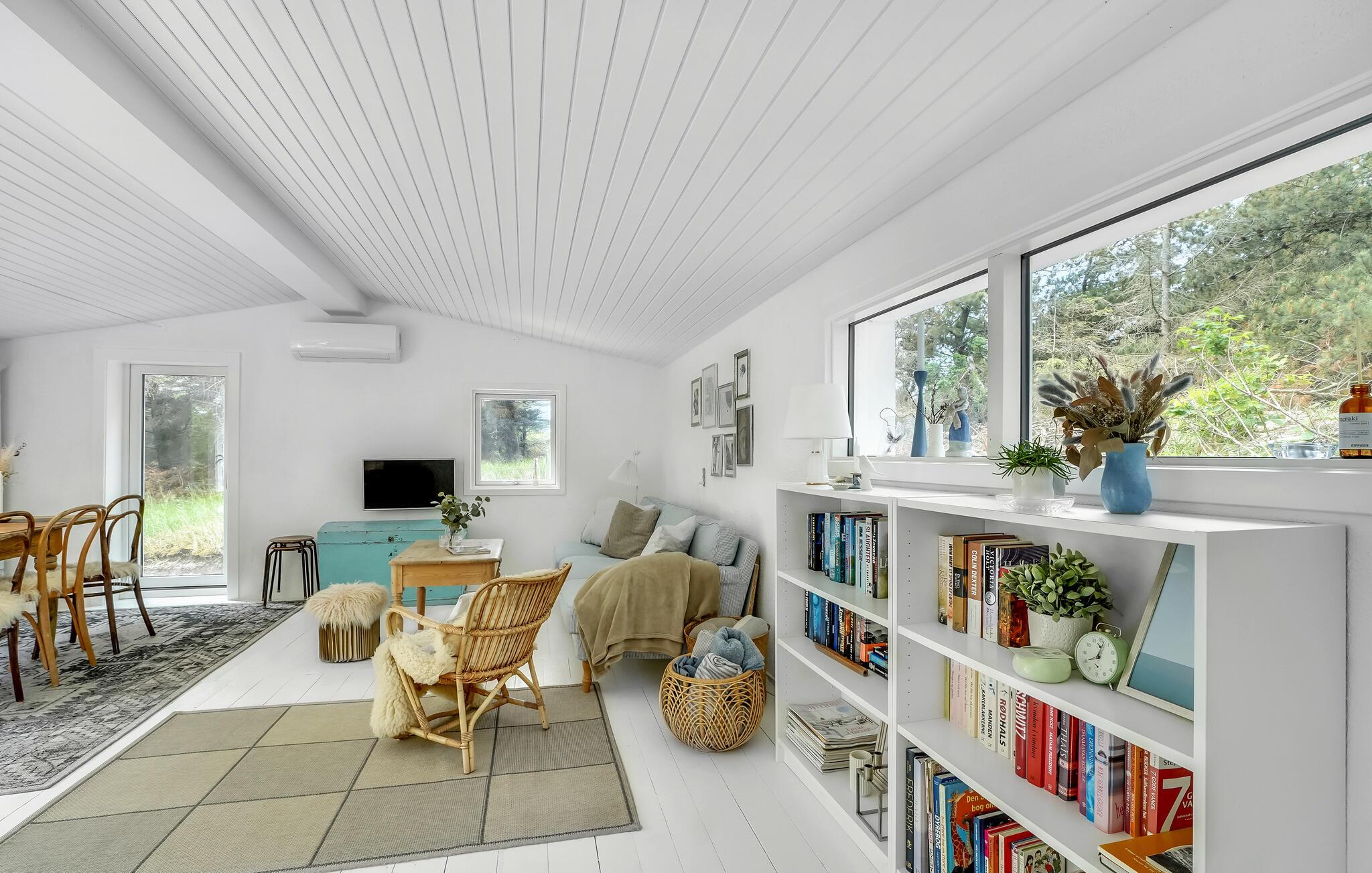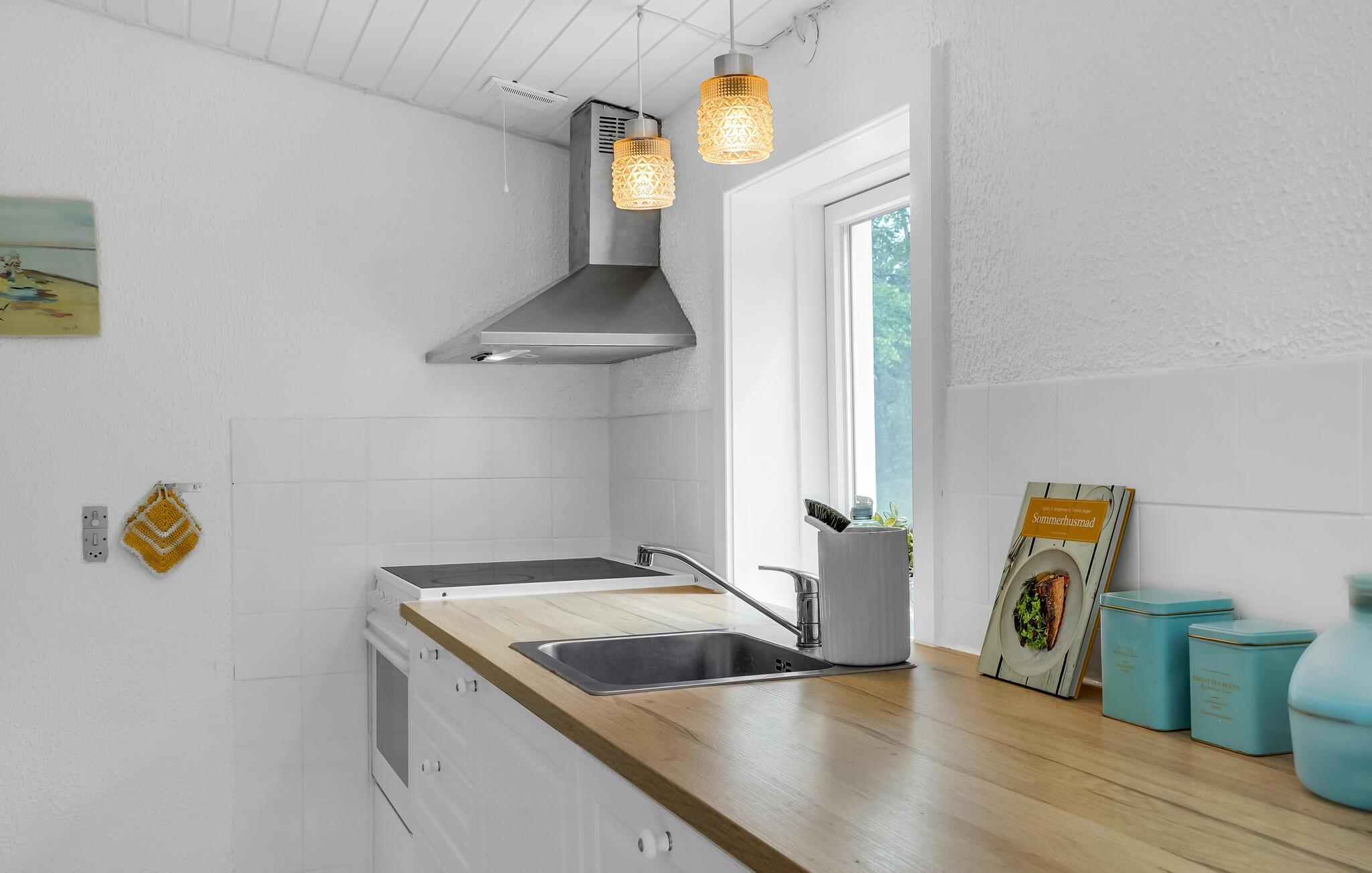 Dette skønne sommerhus egner sig perfekt til en familieferie eller en hyggelig tur for en vennegruppe. Huset er lyst og skandinavisk indrettet, og de harmoniske rammer gør det nemt at sænke skuldrene, slappe af og indstille tankerne på ferie. Den hvide træbeklædning gør det dejligt lyst indenfor, også på overskyede dage, og brændeovnen bidrager med hyggelig varme på kølige aftener. Lad børnene lege i haven, mens I solbader på terrassen og lytter til lyden af ??vinden og bølgerne.