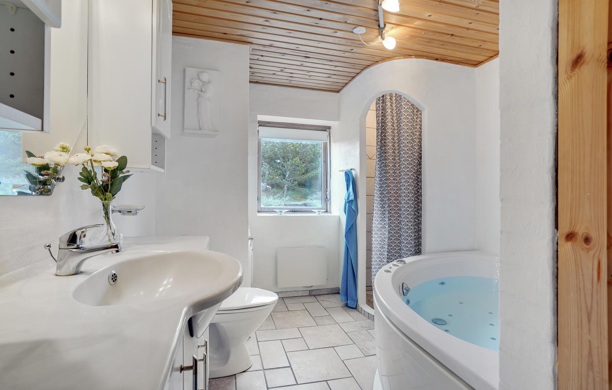 Det ligger på en skøn klitgrund med høje nåletræer. Fra 1. sal, hvor der er stue, tekøkken og bad samt to soveværelser, har I udsigt over klittoppene. Huset har en stor dagligstue med udgang til en dejlig, sydvendt terrasse og desuden adgang til en skøn havestue. I det flotte badeværelse lokker det boblende spabad og ved siden af, saunaen. Et rigtig dejligt feriehus - også for to familier!