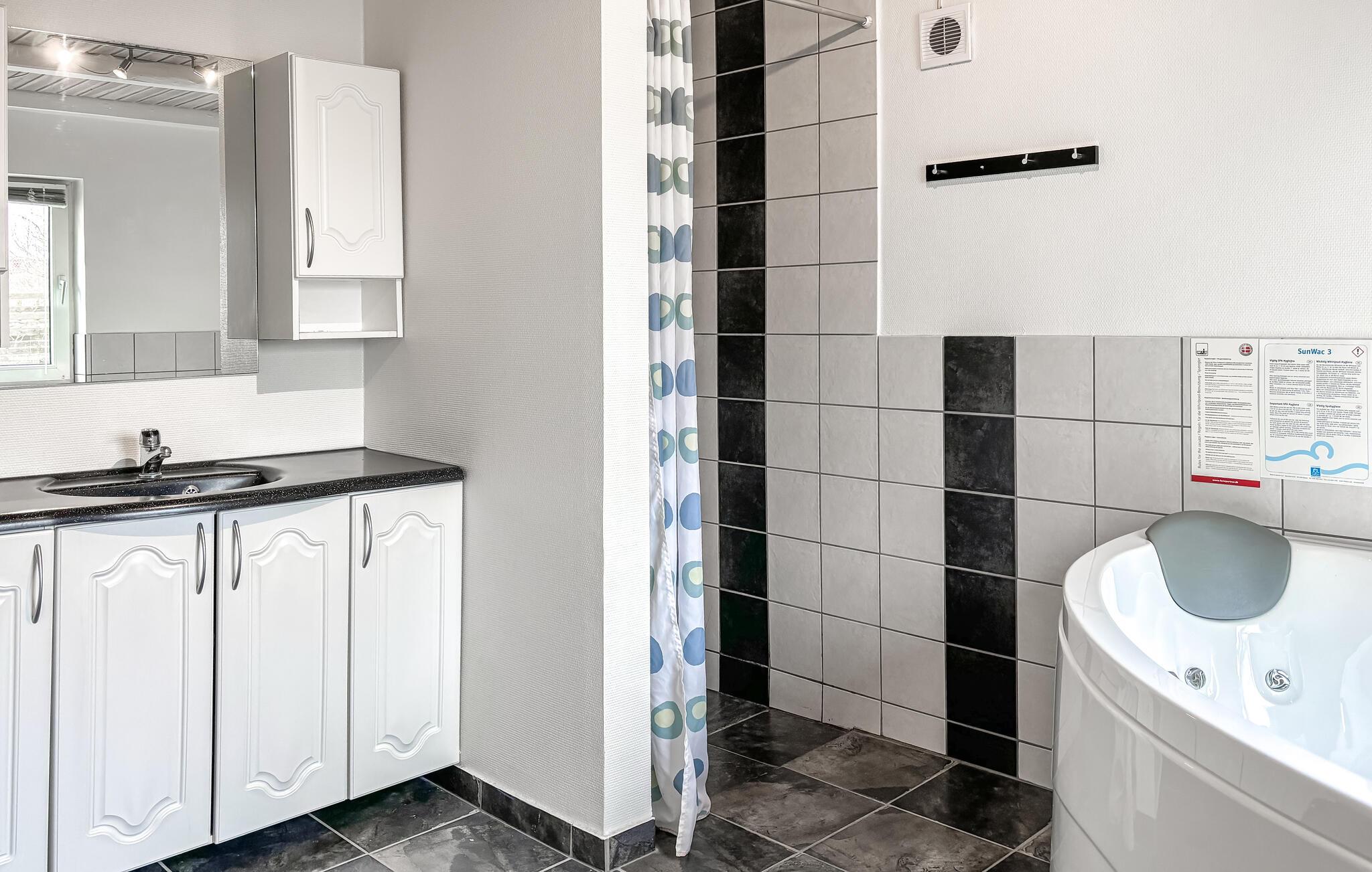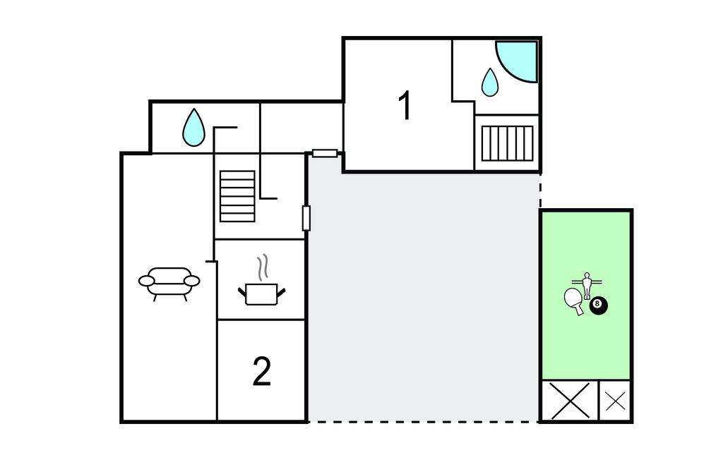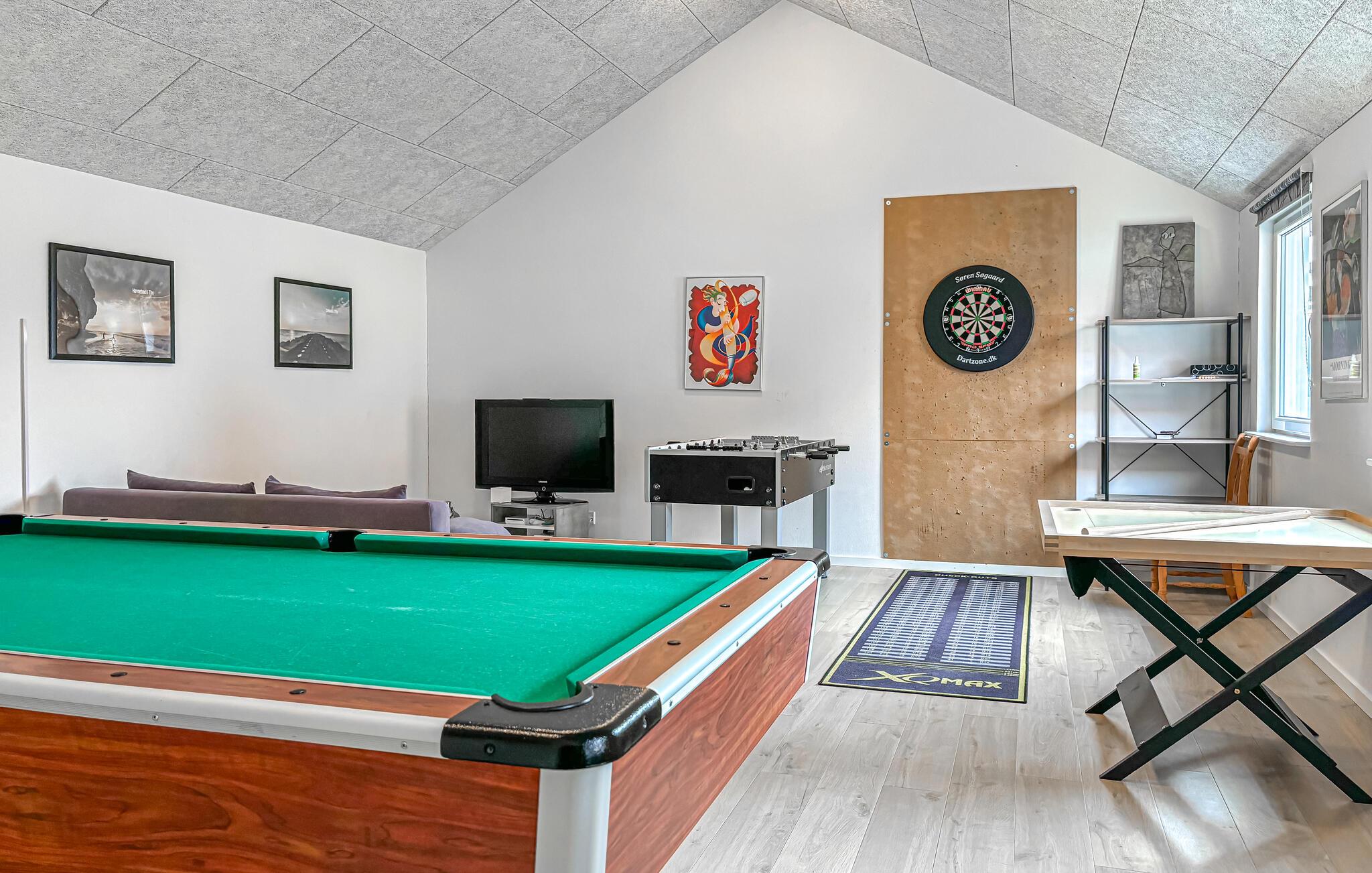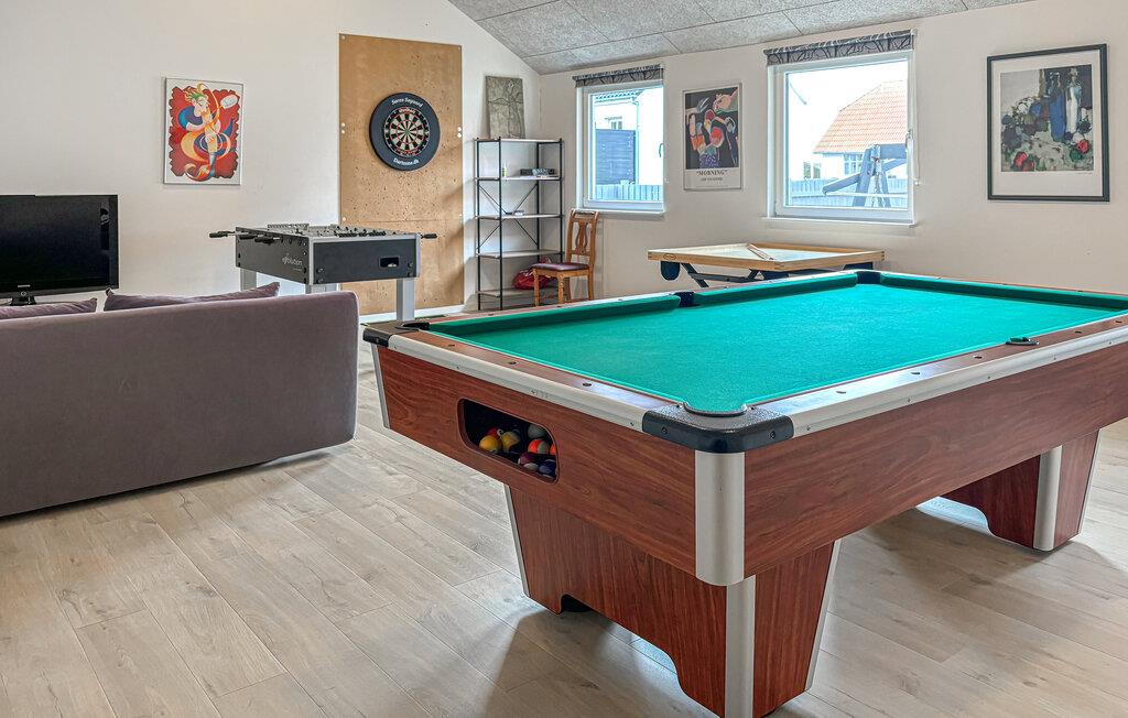 Det rummelige sommerhus med plads til en større gruppe giver jer de perfekte rammer for en afslappende pause. begynd jeres dage med morgenmad ved det lange spisebord, mens I diskuterer planerne for den kommende feriedag. Bagefter indbyder den hyggelige stue med det skønne sofahjørne til afslapning. Køkkenet giver jer alle muligheder for at tilberede lækre måltider. Udfordr jeres medrejsende med poolbillard eller bordfodbold og find feriemesteren i disse sjove discipliner. Et særligt højdepunkt er spabadet, som sikrer beroligende afslapning.