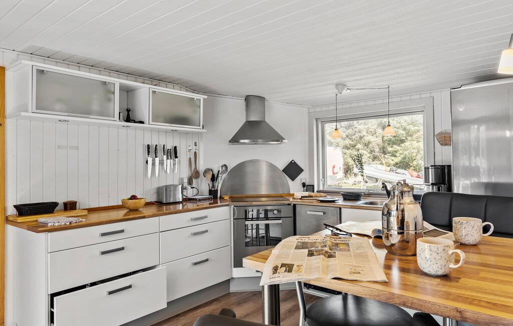 Velkommen til Vorupør, hvor dette nydelige træhus danner rammen om en ferie med fred, ro og store oplevelser i naturen. Omgivelserne er fredelige og rolige, og indvendigt emmer det af hygge med åbent boligkoncept, velholdte træpaneler og vinduespartier, der giver et lækkert lysindfald til stuen og udsigt til haven. Hvis vejret viser lidt tænder, kan I fyre op i brændeovnen, der giver varme og et knitrende lydtapet til madlavningen, fællesmåltiderne og aftenhyggen i sofaen efter en skøn feriedag.