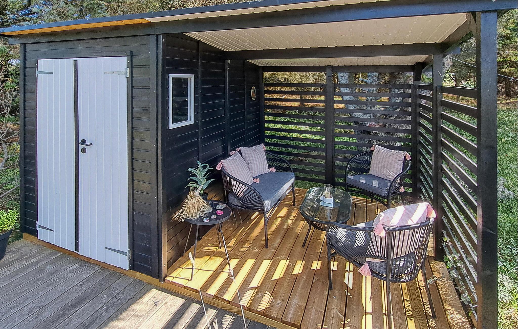 Udenfor er der en dejlig træterrasse med havemøbler, hvor I kan holde hyggelige grillaftener eller nyde morgenkaffen i fred og ro, med udsigt over den smukke naturgrund. På grunden er der også gyngestativ til de mindste.
