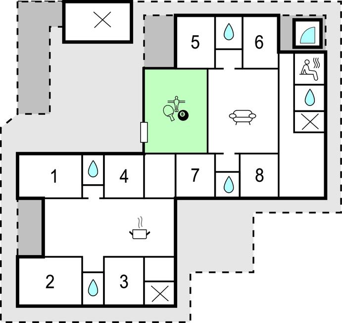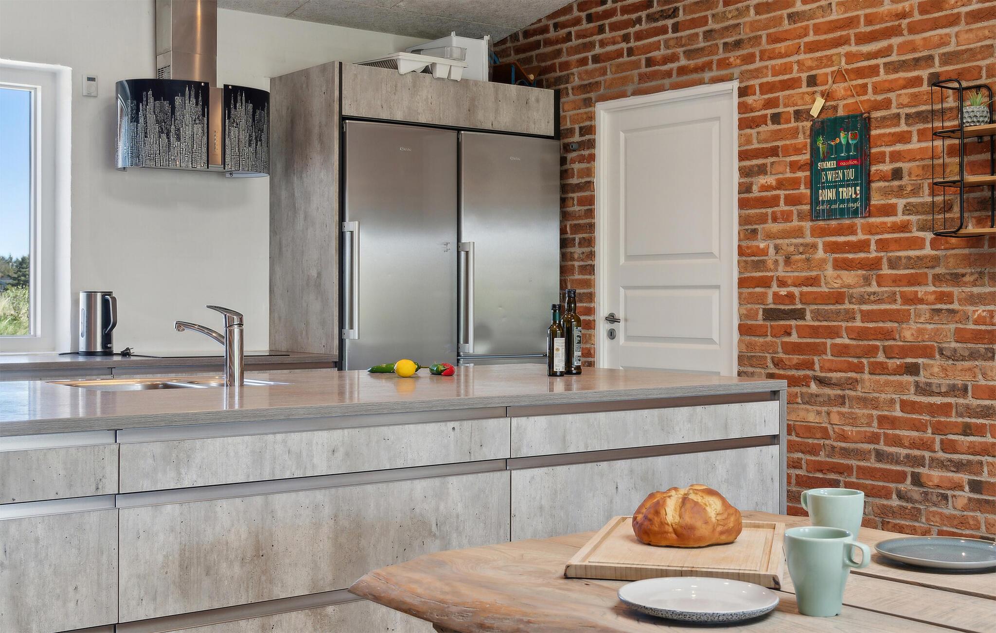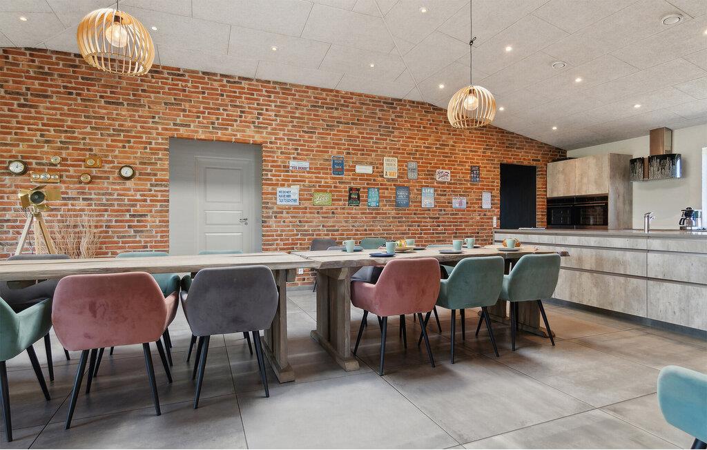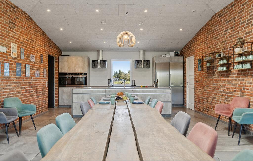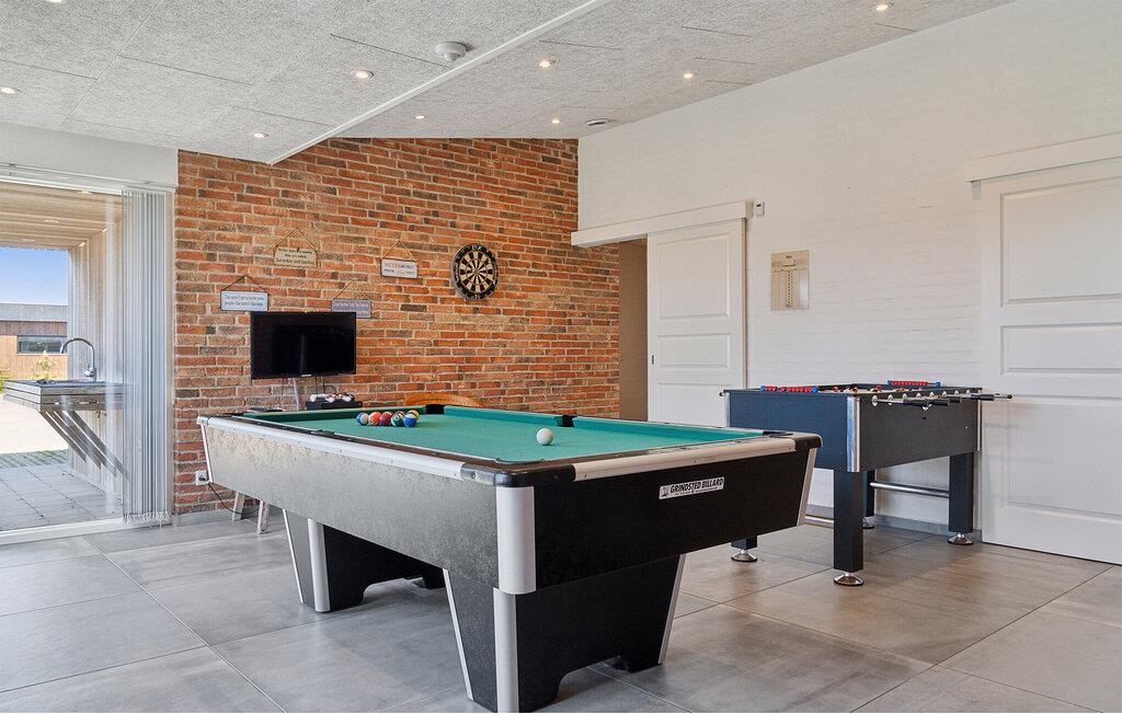 I aktivitetsrummet findes både billiard, bordfodbold, dart samt et tv med flere forskellige spillekonsoler. I gangen er der god plads til jer alles overtøj og fodtøj. Det åbne køkken er helt fantastisk indrettet med alt hvad en god køkkenentusiast kan ønske sig. Her er to ovne, to opvaskemaskiner, to komfurer og en ø med håndvask så det også er muligt at følge med i samtalerne der foregår i spisestuen - også her er der et ovenlysvindue, der giver det perfekte lys i rummet. I spisestuen er der god plads samt meget komfortable spisebordsstole og et stort fladskærms-tv så I kan følge med i nyhederne. Flere steder i huset er der rå mursten, som giver et råt, eksklusivt look. Terrasserne (både overdækkede og åbne) omkranser huset, og der er lavet en bar med borde I kan stå ved, så I kan holde et udeparty.