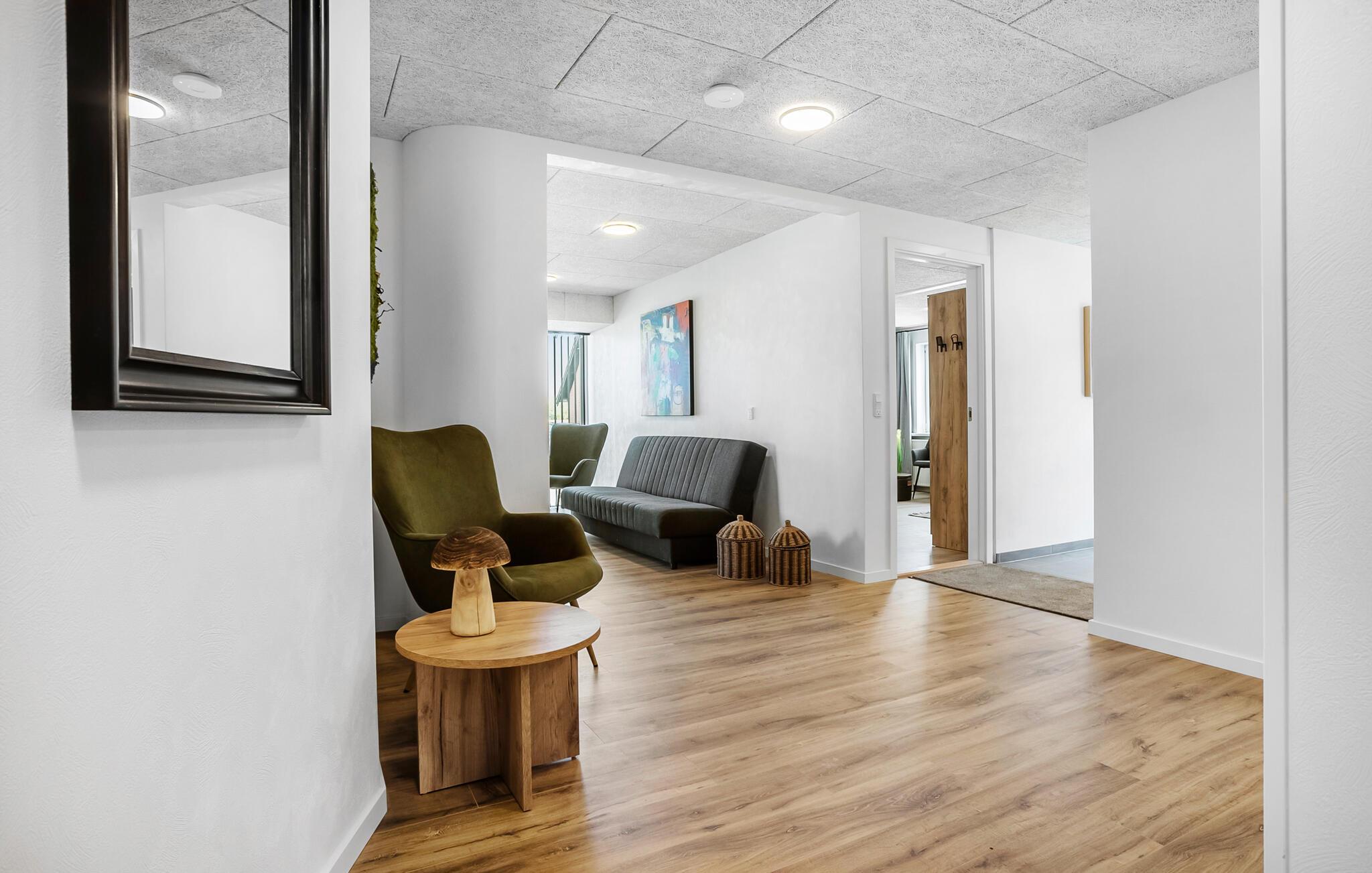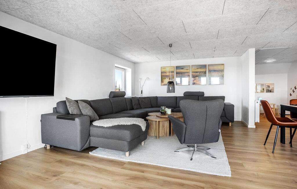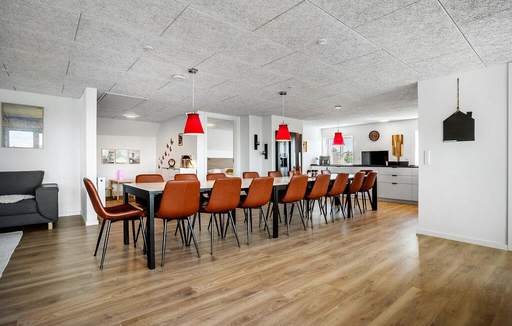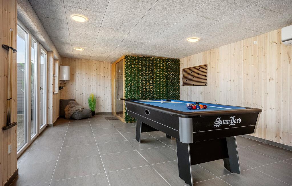Dette moderne feriehus tilbyder rigelig plads til en større rejsegruppe, der værdsætter komfort og samvær. Nyd tiden i den rummelige opholdsstue med et stort sofahjørne, spiseplads til mange personer og flere hyggelige opholdssteder. Benyt massagestolen, slap af med en film, eller lav måltider sammen i det veludstyrede køkken. Saunaen sørger for beroligende varme ved dagens afslutning, mens aktivitetsrummet med et poolbord inviterer til hyggelig underholdning. Der er tænkt på alt her.