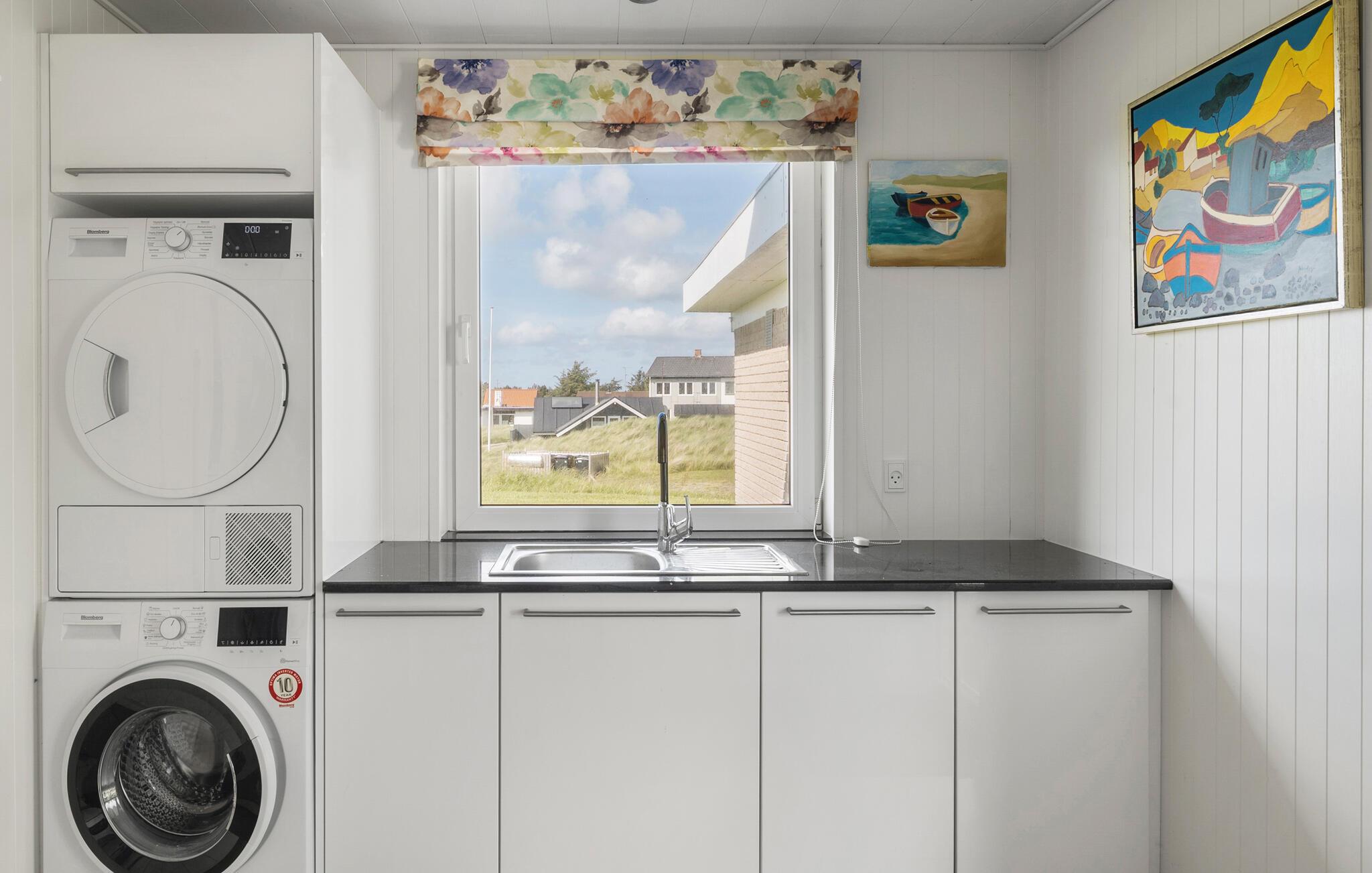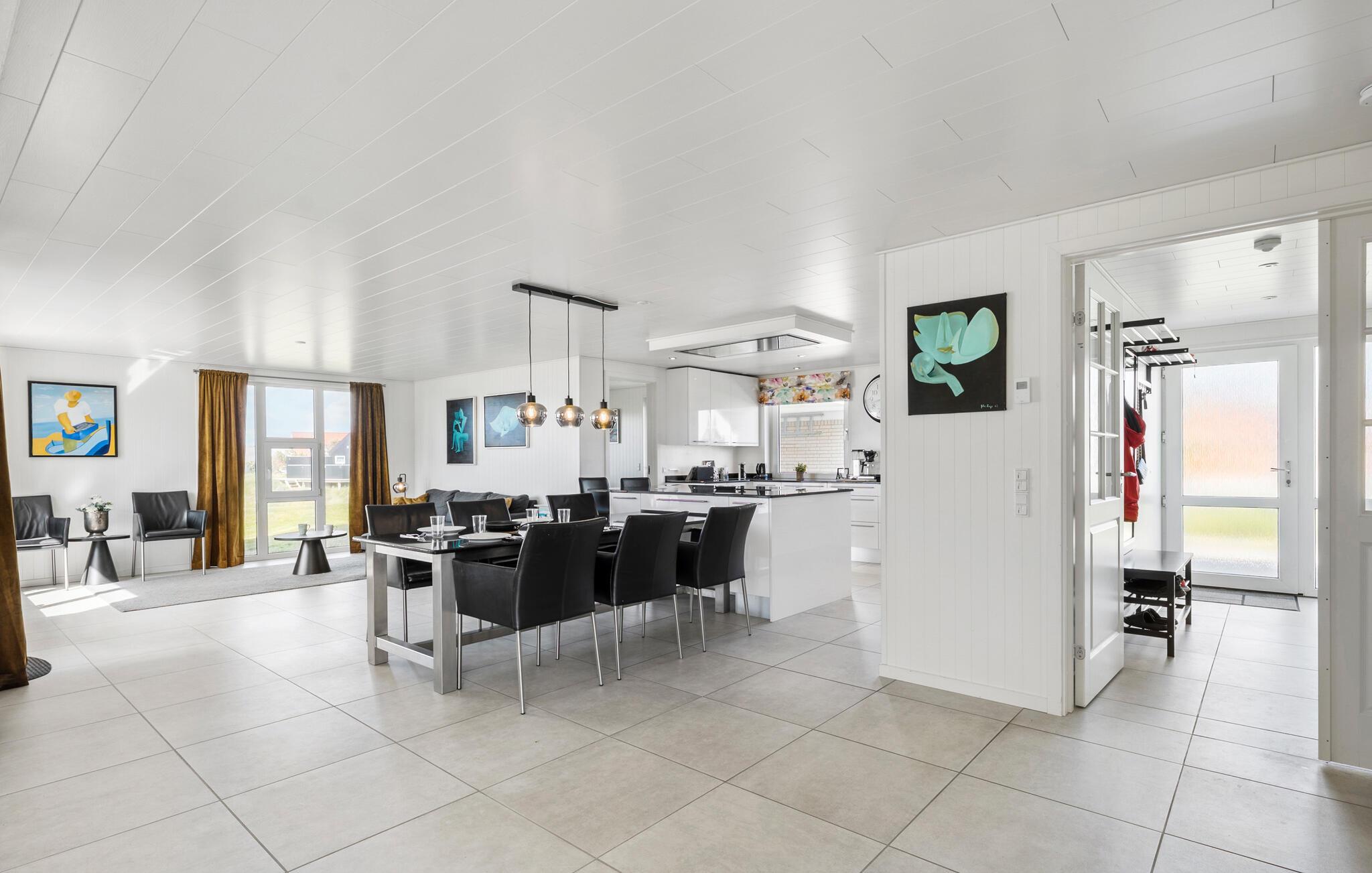 Dette rummelige feriehus med plads til en stor familie giver jer et godt udgangspunkt for en dejlig ferie med hygge og afslapning ved Vesterhavet. Få tanket ny energi i disse smukke omgivelser. Indendørs byder jeres hus på en elegant indretning. I det moderne køkken kan I tilberede jeres yndlingsretter og nyde dem ved spisebordet i opholdsstuen, som også har en hyggelig sofahjørne med brændeovn.