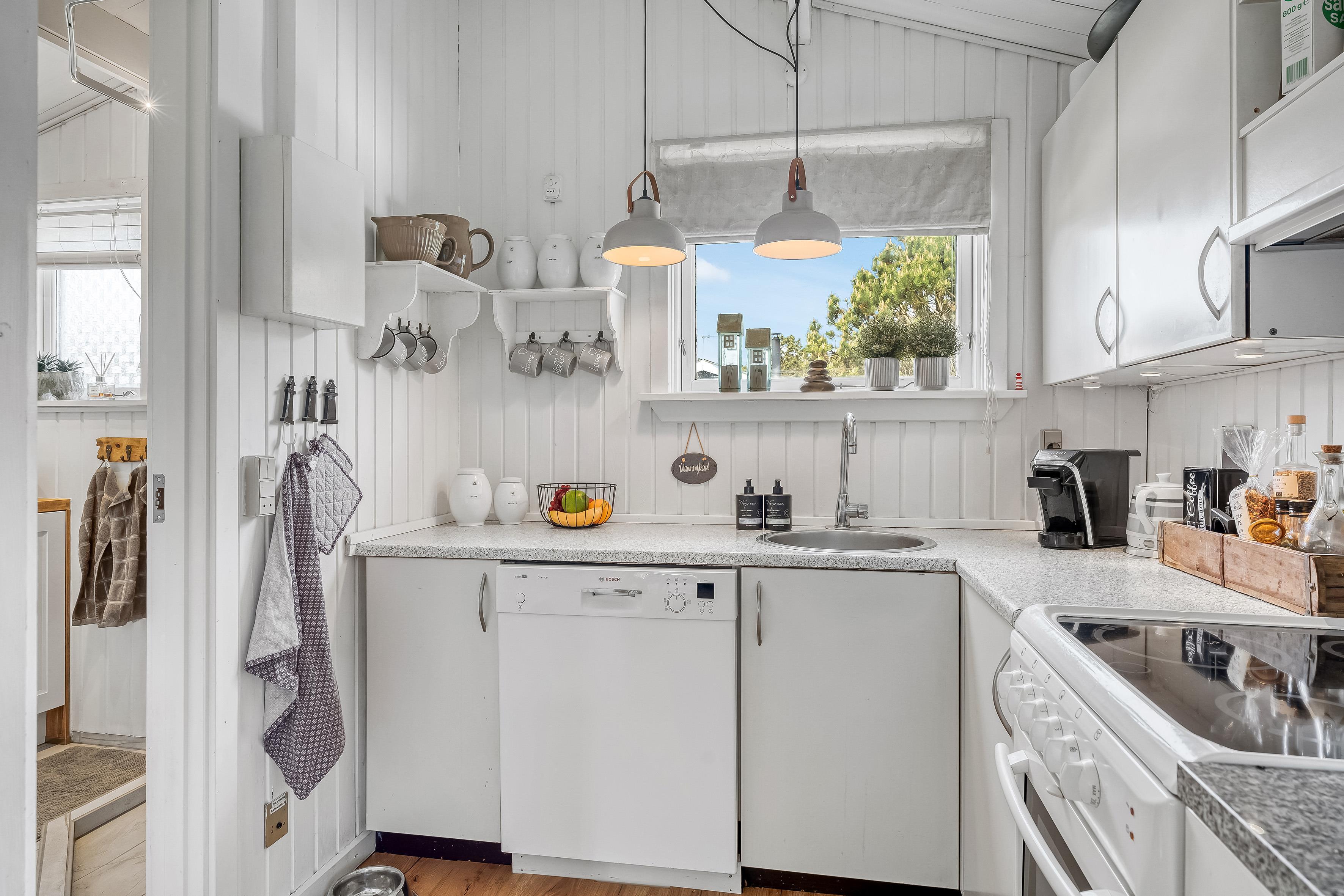 Køkkenet er funktionelt og veludstyret med moderne apparater, herunder en mikrobølgeovn, ovn, keramisk komfur, opvaskemaskine, køleskab og fryser med en kapacitet på 20 liter. Dette gør madlavningen til en leg, og du kan nyde måltider i det hyggelige spisekrog eller på den overdækkede terrasse, hvor du også finder en grill til skønne sommeraftener.