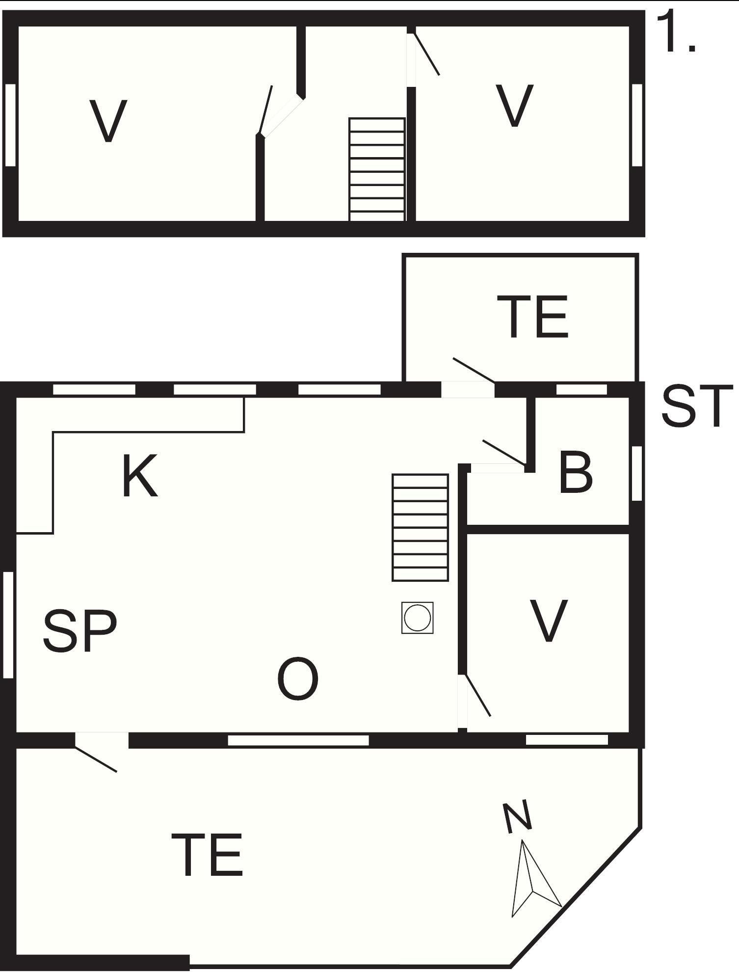 1 Opholdsstue: 34 m2, brændeovn, tv, parabol, høj stol