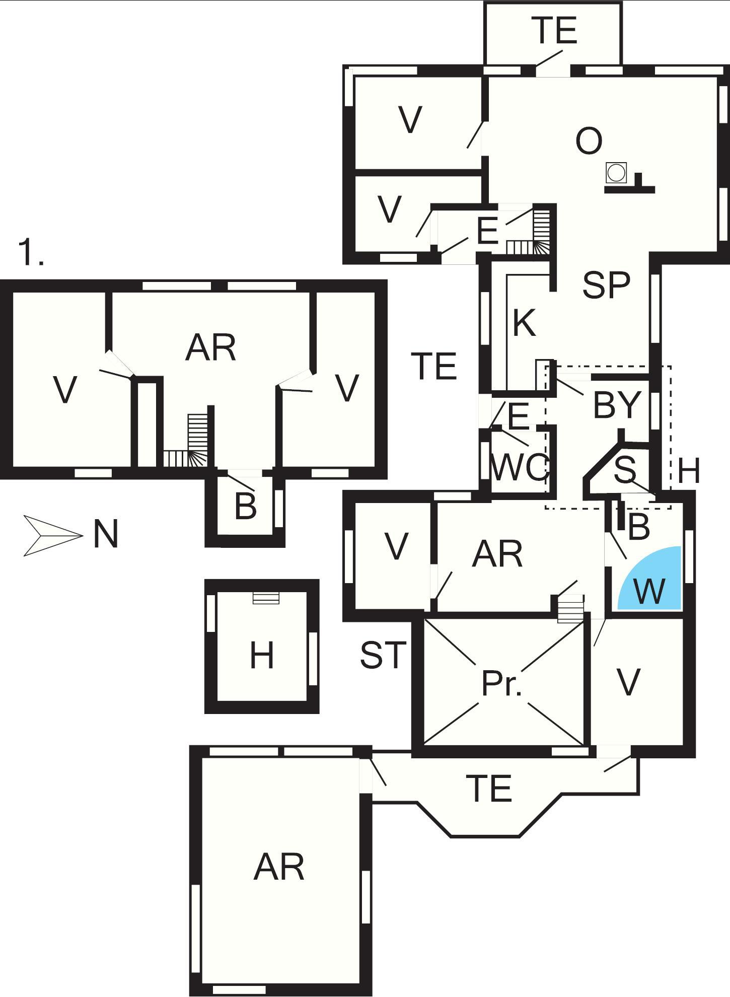 1 Opholdsstue: Brændeovn, cd-afspiller, dvd-afspiller, tv, parabol, høj stol