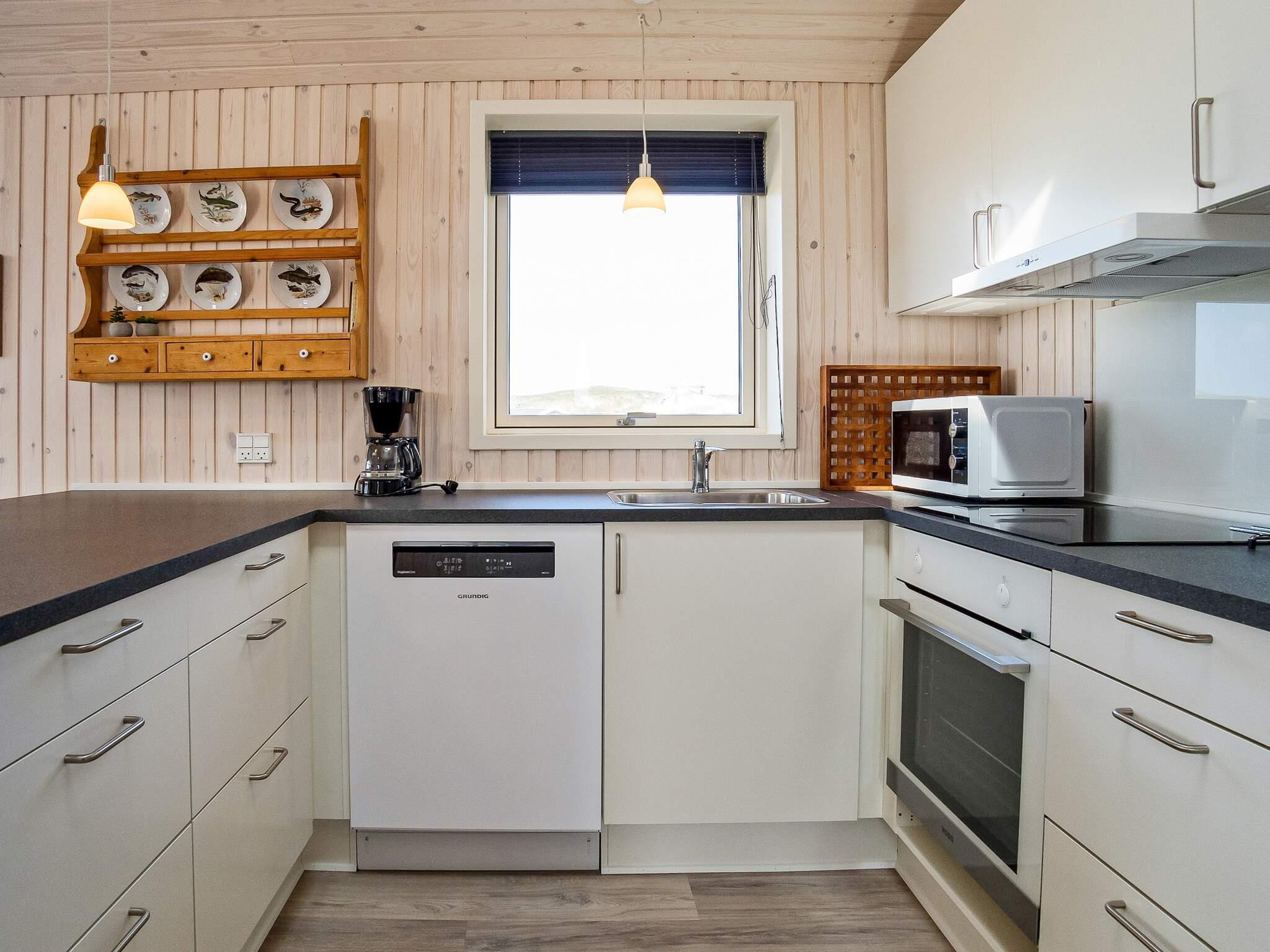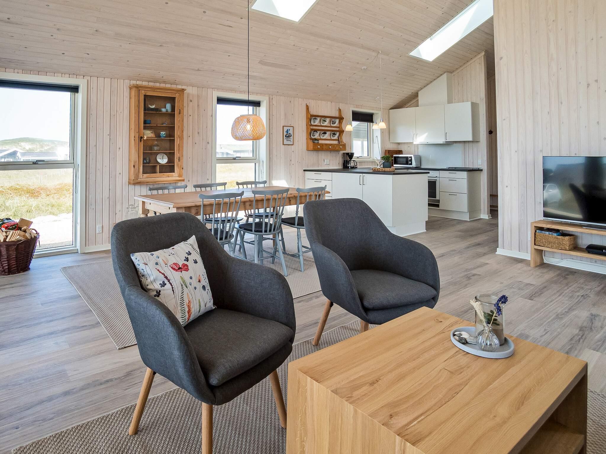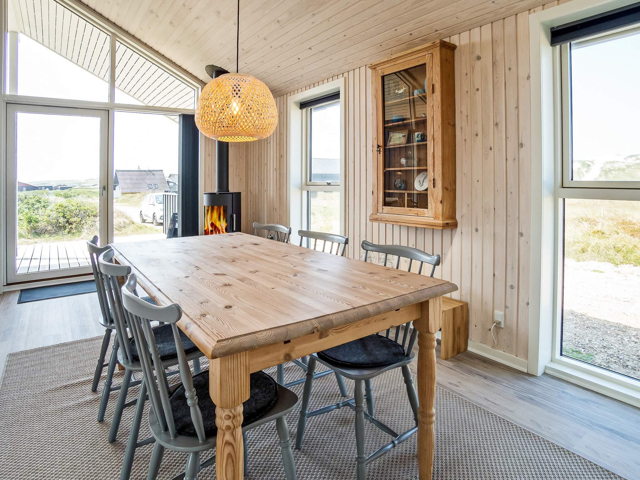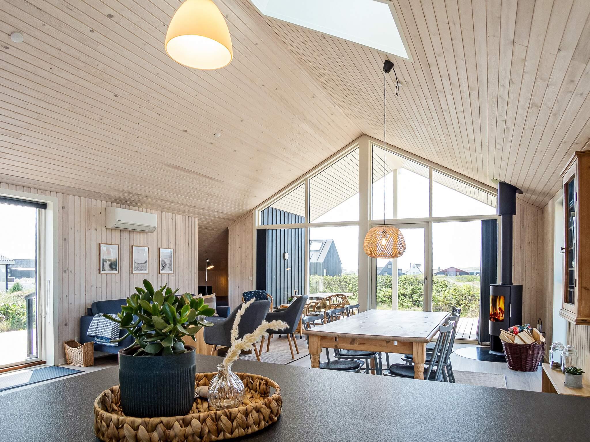 Åbent køkken/alrum til familieliv med spise- og opholdsafdeling. Spisepladsen har store vinduer fra gulv til loft med udsigt til klitlandskabet. Køkkenet er udstyret med blandt andet opvaskemaskine, køle/fryseskab, keramisk kogeplade, og mikroovn.