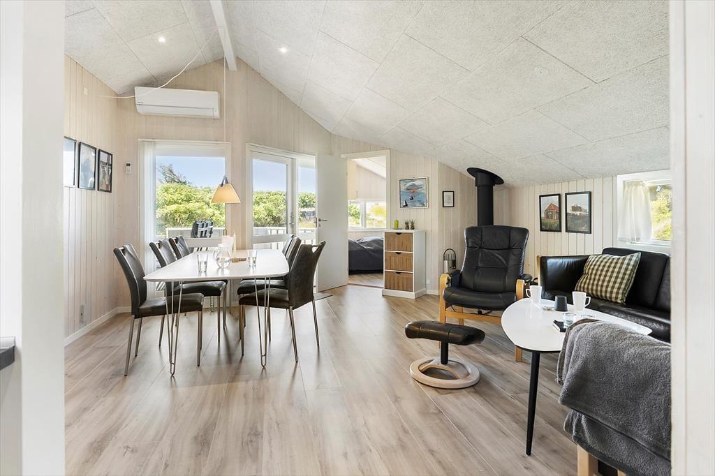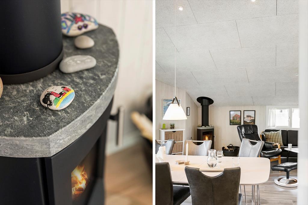 Når du træder ind, mødes du af et nyt, stilfuldt køkken fra 2020, der åbner op til en hyggelig stue. Her kan du lade dig synke ned i komfortable møbler foran brændeovnen, mens varmen og knitrende flammer skaber en behagelig atmosfære. Efter en dag ved stranden kan du forkæle dig selv i husets sauna. De fire lyse soveværelser tilbyder rolige rammer for en god nats søvn, så du er klar til nye oplevelser dagen efter.