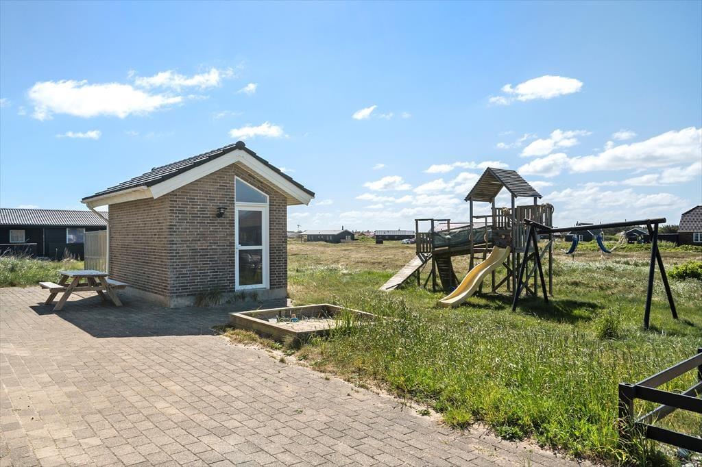 Haven omkring sommerhuset breder sig over en stor naturgrund på 2.600 m², som giver masser af plads til at boltre sig under åben himmel. Børnene vil elske gyngerne, sandkassen og legehuset, hvor fantasifulde lege kan få frit spil. Rundt om huset er der flere hyggelige terrasseområder, hvor du kan finde en solrig plet eller sidde i læ med en god bog. På lune sommeraftener kan grillen tændes, mens solen langsomt går ned over klitterne. Og selvfølgelig er familiens firbenede medlemmer også hjerteligt velkomne til at nyde ferielivet sammen med jer.