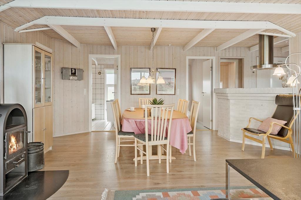 Når du træder ind i sommerhuset på Fourmivej 55, mødes du af en lys og indbydende atmosfære, hvor det store vinduesparti i stuen lader sollyset strømme ind og skaber en skøn fornemmelse af rummelighed. Stuen, spisepladsen og køkkenet ligger i åben forbindelse, så her er god mulighed for at samles om hyggelige måltider, sjove brætspil eller bare afslapning i sofaen foran den knitrende brændeovn. Har du lyst til lidt ekstra selvforkælelse, kan du nyde en tur i husets indendørs spa eller varme dig igennem i saunaen – en perfekt afslutning på en frisk dag ved stranden. Her får du en feriebase, der både emmer af ægte sommerhushygge og dejlig komfort.