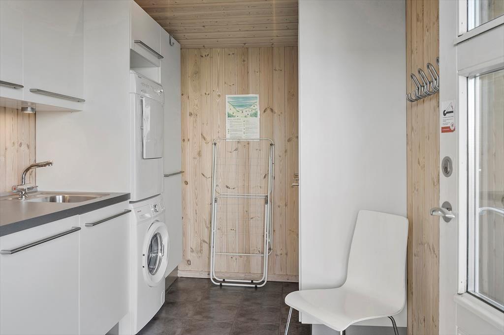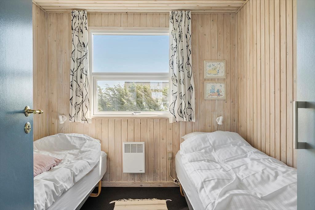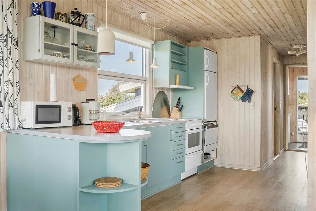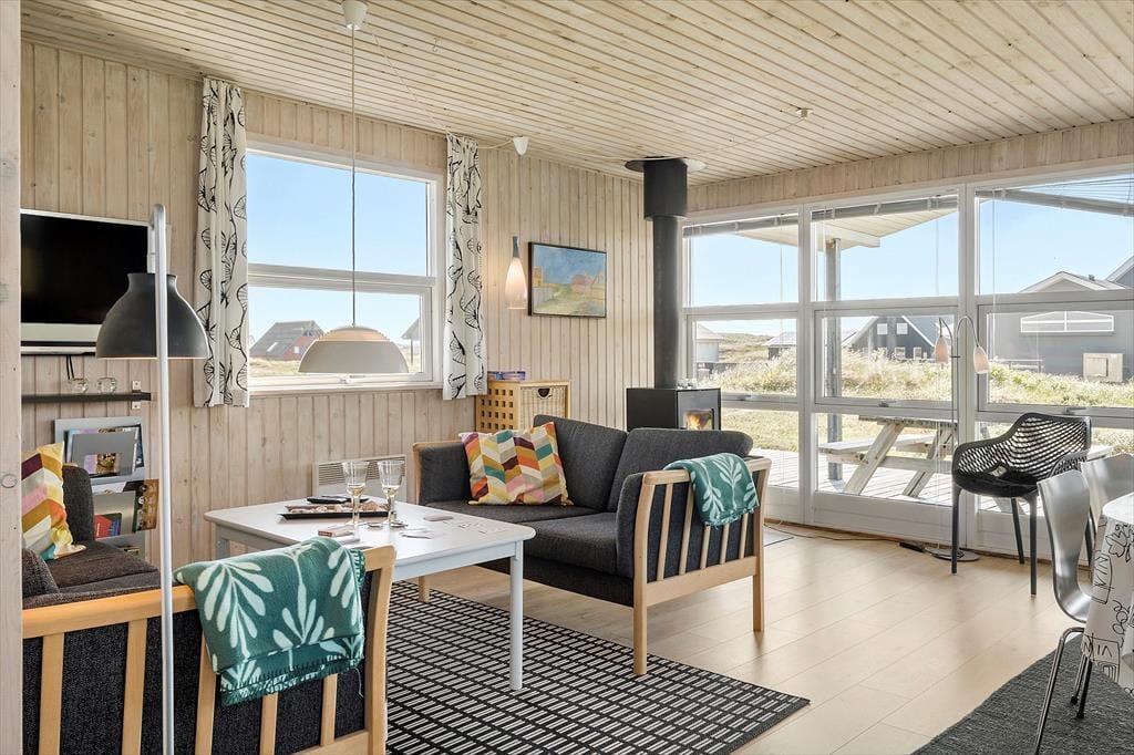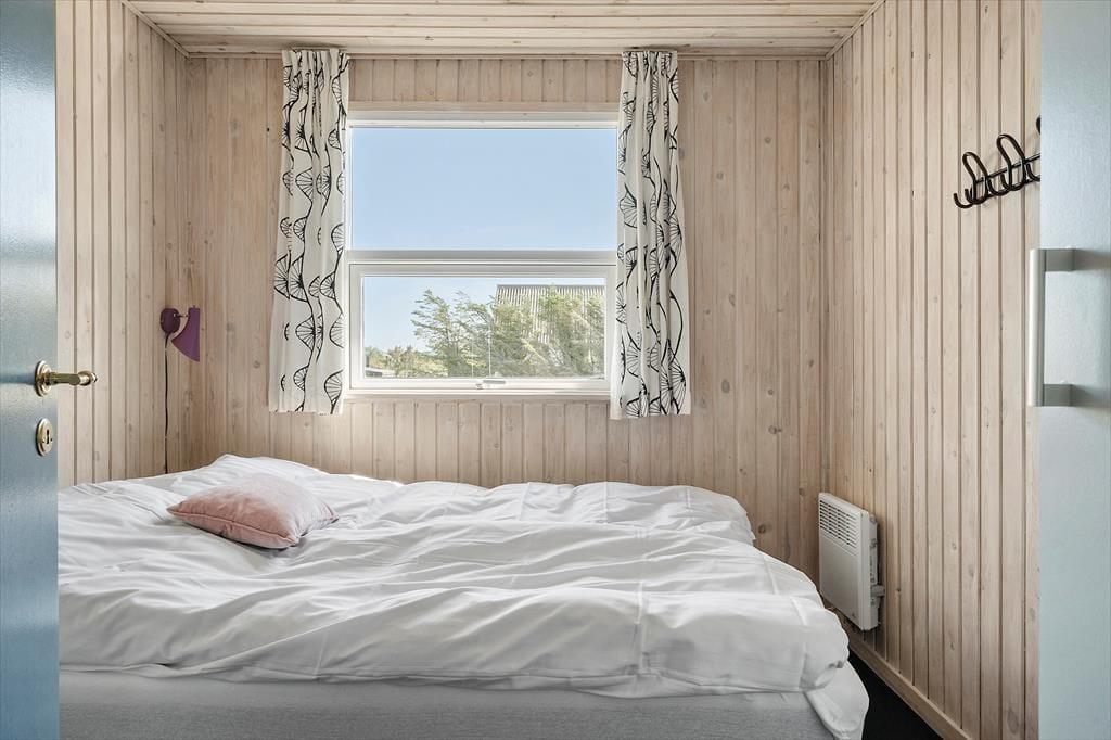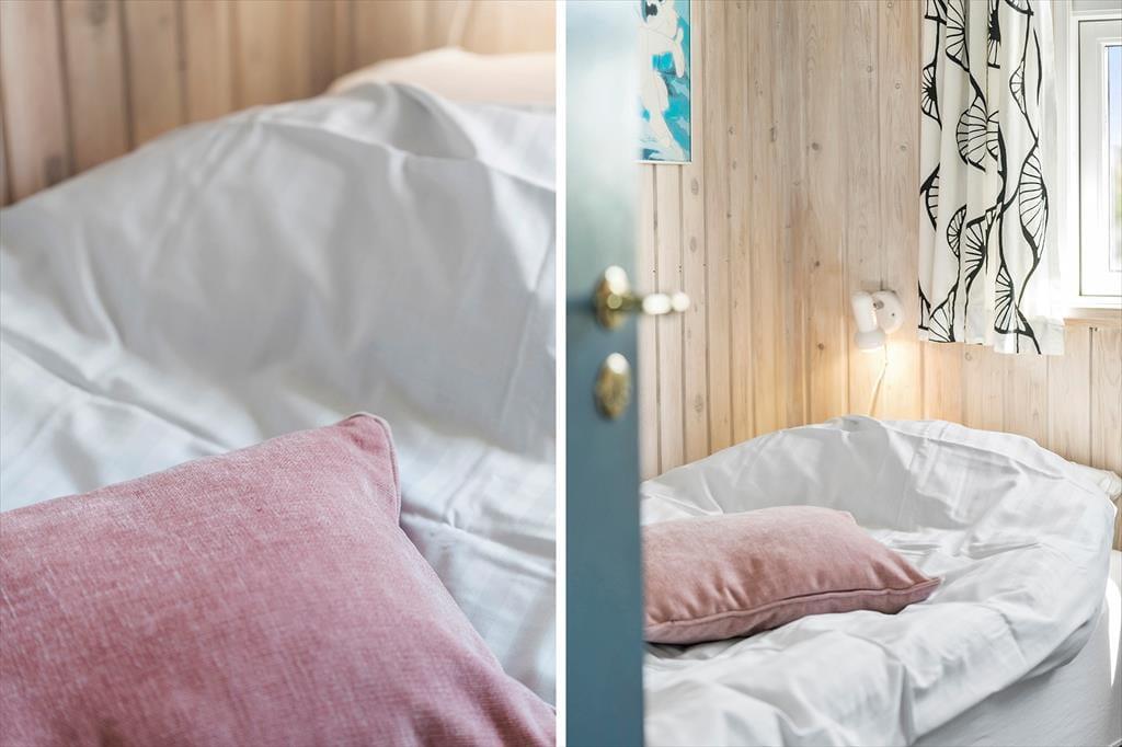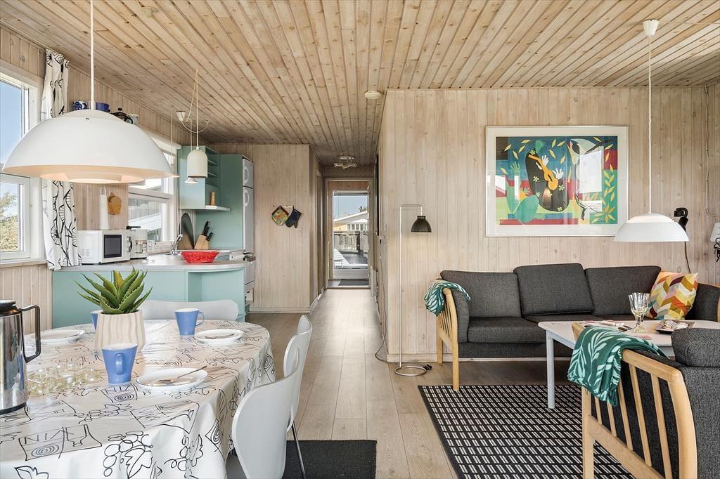 Indenfor i sommerhuset bliver du mødt af en varm og imødekommende stemning, som straks sætter gang i feriefølelsen. Huset er lyst og indrettet med sans for hygge, hvor træets naturlige materialer – både på vægge og lofter – giver en afslappet og autentisk atmosfære. Det åbne køkken- og opholdsområde er perfekt til fælles ferietid, hvor familien kan samles omkring madlavning, brætspil eller en god film på en regnvejrsdag. De store vinduer lukker lyset ind og skaber en fin forbindelse til naturen udenfor, så du hele tiden har fornemmelsen af at være tæt på det, du kom for – nemlig ro og natur.
