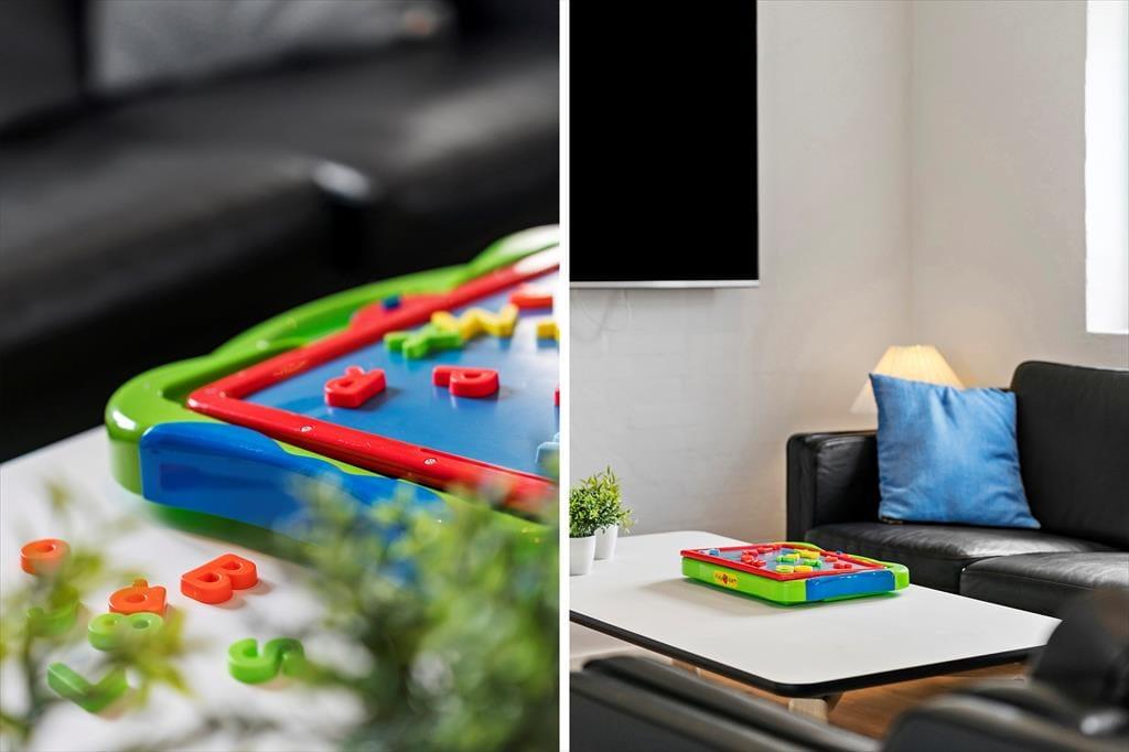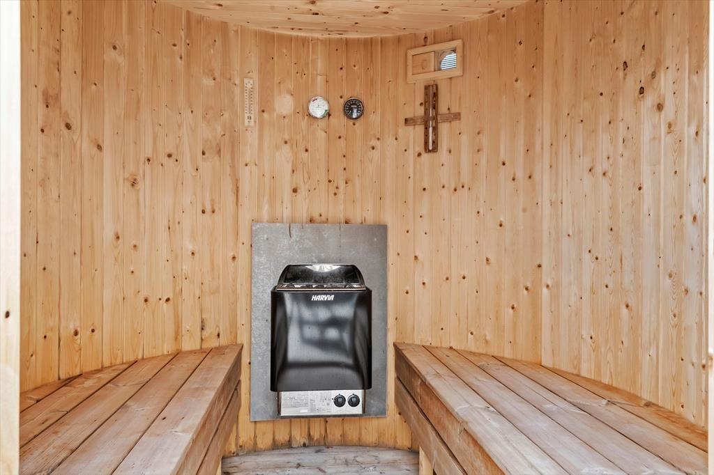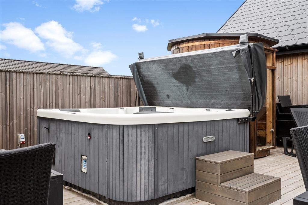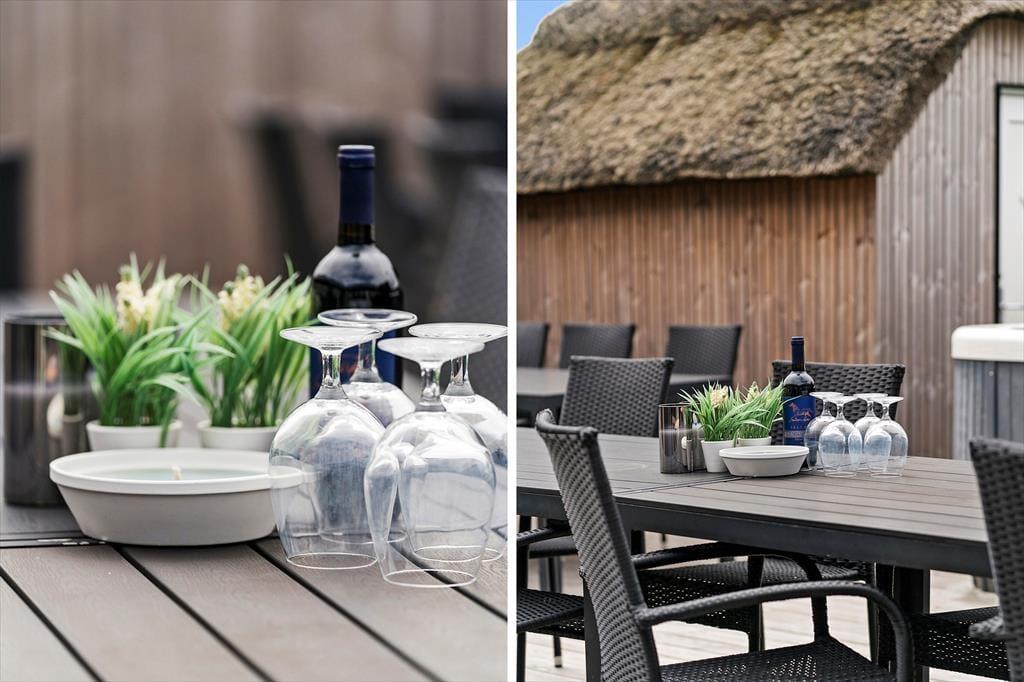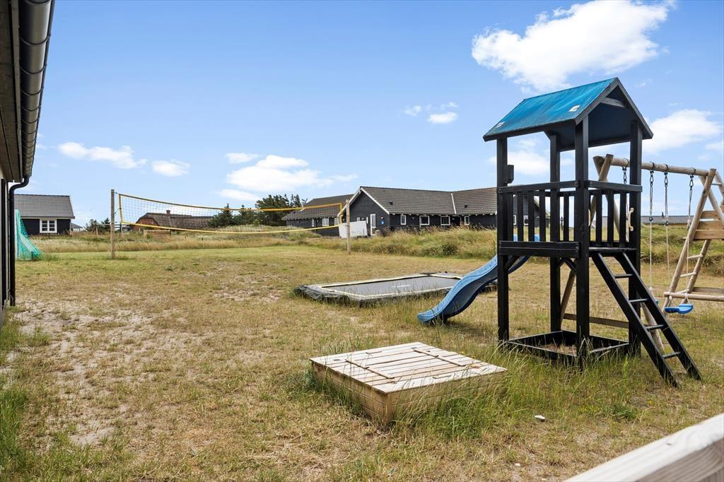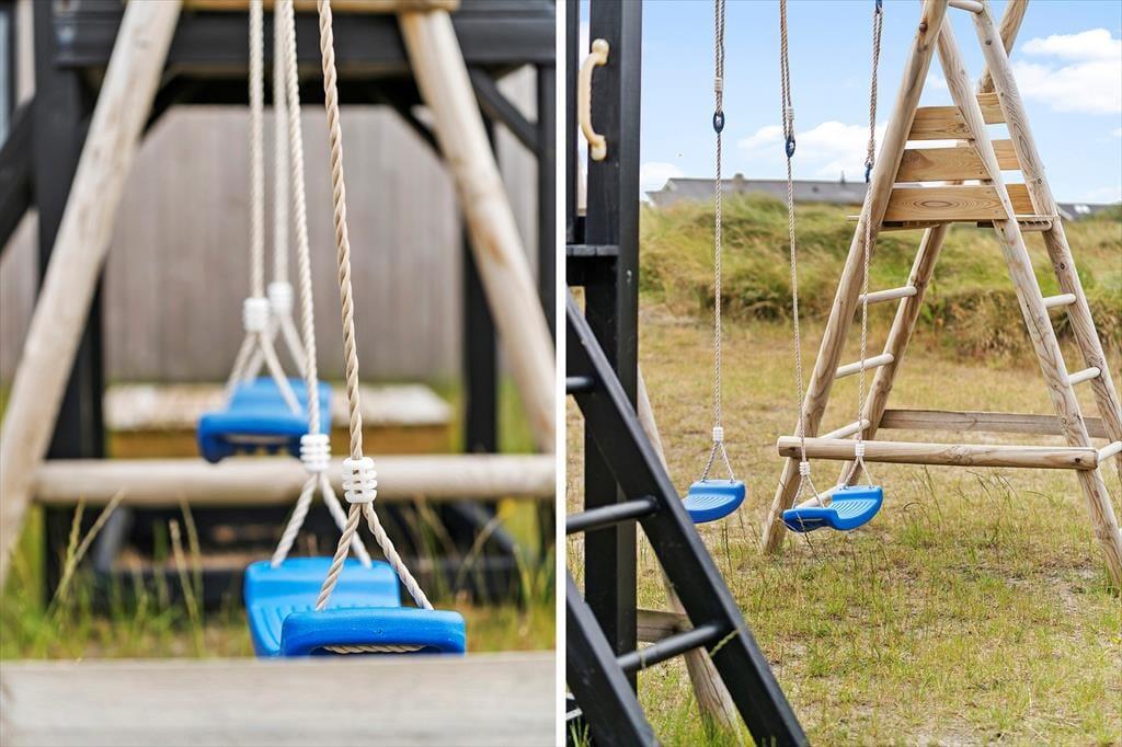 Den store terrasse åbner op for et skønt udeliv, hvor alle kan finde deres egen favoritplads – om det er med en kop kaffe i solen, en god bog i loungestolen eller lidt sved på panden i tøndesaunaen. Og der er masser af plads til, at børnene kan slå sig løs, mens de voksne nyder udsigten eller tilbereder maden på grillen. Haven er som skabt til leg med trampolin, legetårn, sandkasse og et net til volleyball, så her er rig mulighed for at få rørt sig og more sig sammen hele dagen. Og når solen begynder at gå ned, er det oplagt at samle hele selskabet omkring et godt måltid og lade roen falde på, mens dagen afrundes med latter og gode snakke under åben himmel.
