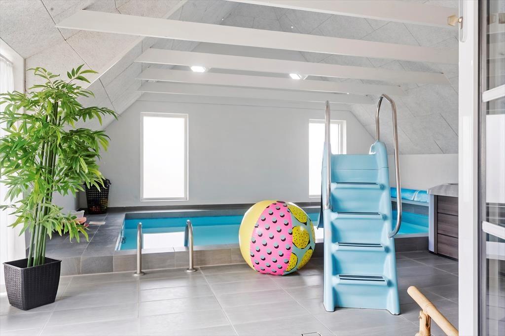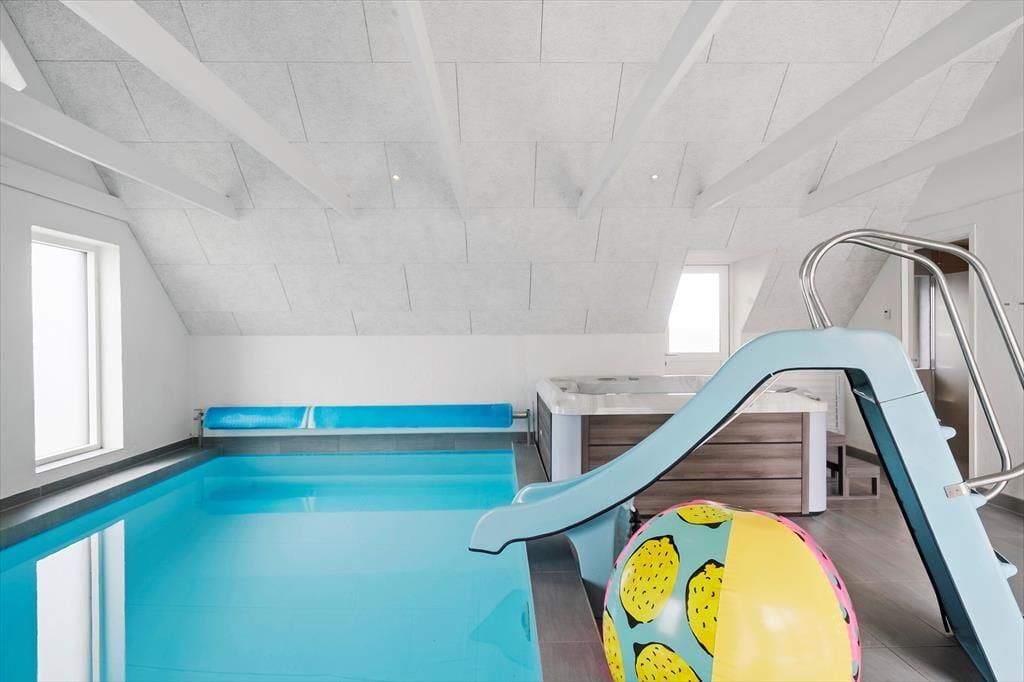 Allerede når du træder indenfor i sommerhuset, fornemmer du den moderne og indbydende stemning, som gennemsyrer hele huset. Her er plads til, at mange gæster kan være sammen og hver for sig, og hjerterummet bliver hurtigt det åbne opholdsrum med køkken og stue, hvor madlavning, spil og snak går hånd i hånd. Men det stopper ikke her – for her venter også et stort aktivitetsrum, der inviterer til timevis af sjov. Dyst mod hinanden i bordtennis, pool, bordfodbold og dart, eller slå jer bare løs med grin og højt humør. Når I trænger til at slappe af, er der heldigvis også tænkt på det: den indendørs pool på 18 m2 med rutsjebane og det lækre spabad er perfekte til stille stunder med varmt vand og afslappet velvære, uanset årstid og vejr.