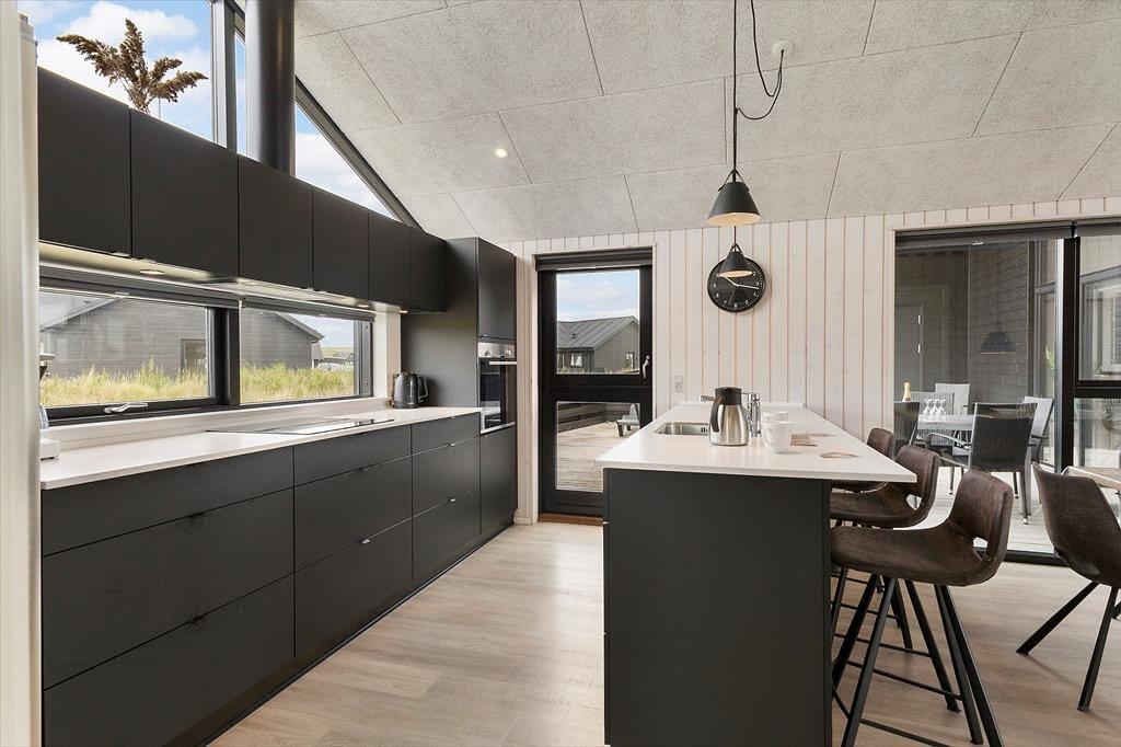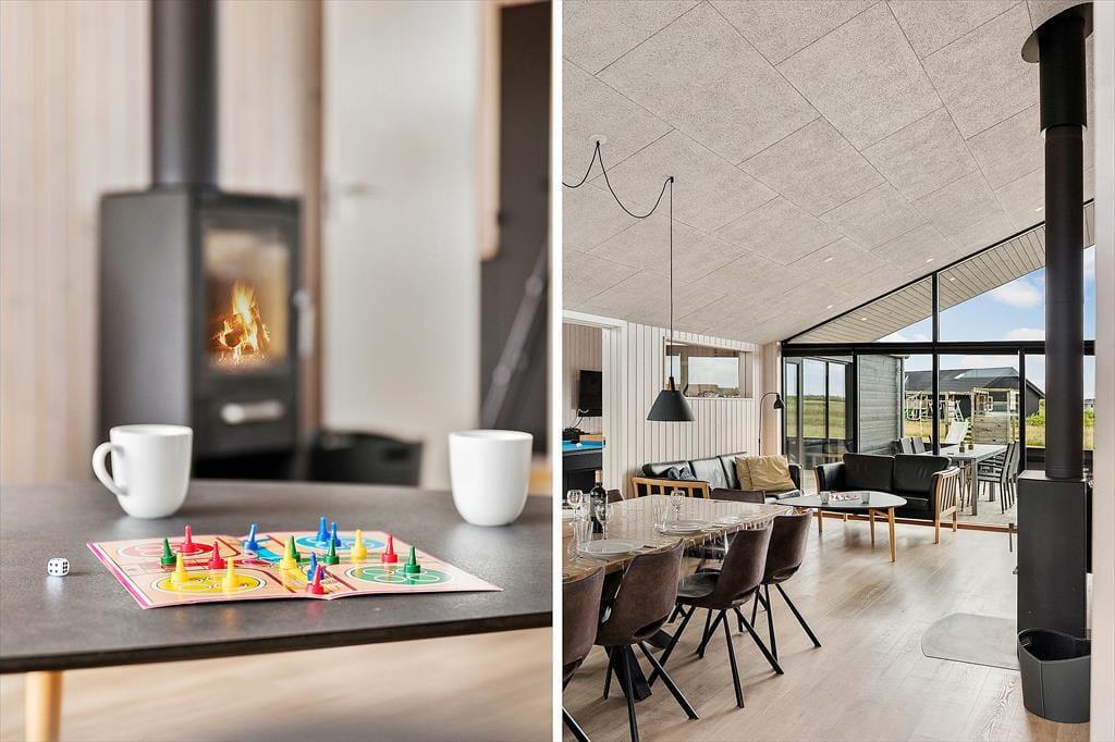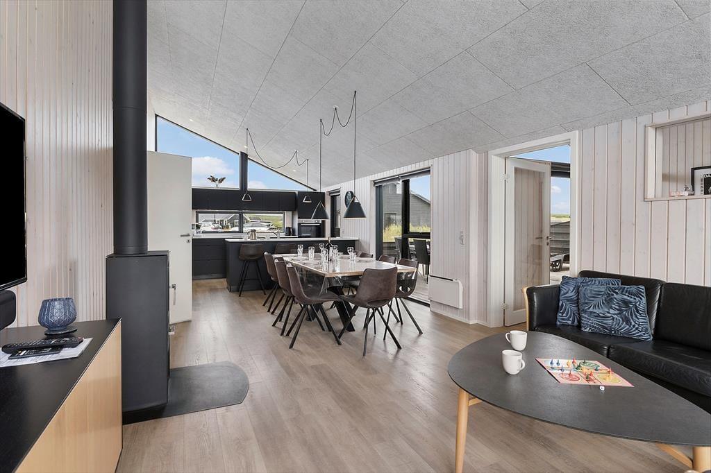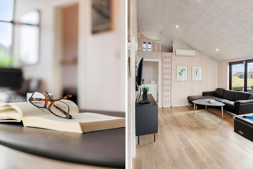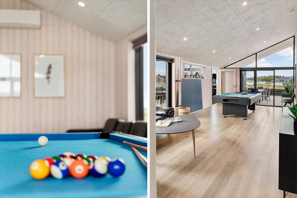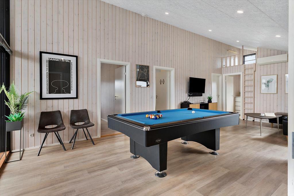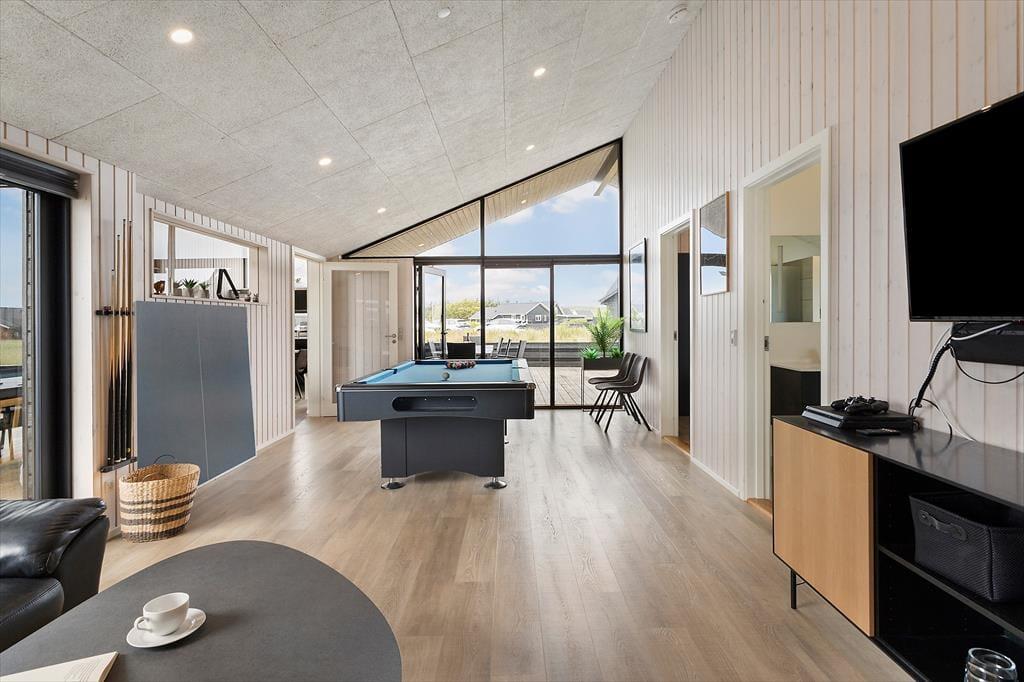 Når I træder indenfor i dette dejlige sommerhus, mødes I af en lys og luftig indretning, der emmer af afslapning og ferie. Køkken og stue ligger i åben forbindelse og fungerer som det naturlige samlingspunkt for hyggelige måltider og samtaler i afslappede rammer. Når der skal være lidt mere gang i den, er aktivitetsrummet klar med både billardbord og bordtennis – ideelt til familiens egne turneringer og fælles grin. To hemse giver ekstra opholdsrum til både børn og voksne, der ønsker en stille stund. Efter en lang dag i den friske havluft er det oplagt at finde ro i husets wellnessområde, hvor både spa og sauna står klar til at give kroppen ny energi og sindet fuld afslapning.