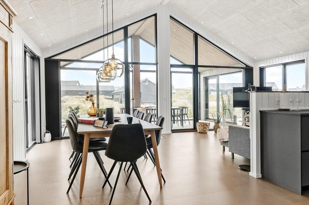 Indenfor i sommerhuset mødes du af en lys og venlig atmosfære, hvor store vinduespartier, loft til kip og stilrene løsninger skaber en rummelig og afslappende stemning. Køkken og stue ligger i åben forbindelse, så her er det oplagt at samles omkring madlavning og fælles hygge, hvad enten det er med kortspil, kaffe eller gode samtaler ved spisebordet. Spaen indenfor giver mulighed for at lade dagens indtryk synke til bunds i bobler og ro, og uanset vejret udenfor, er det en luksus, der sætter prikken over i’et. Huset er moderne møbleret og gennemtænkt, så både par, familier og vennegrupper kan føle sig godt tilpas. Her får du en fornemmelse af, at ferien begynder, lige så snart døren åbnes.