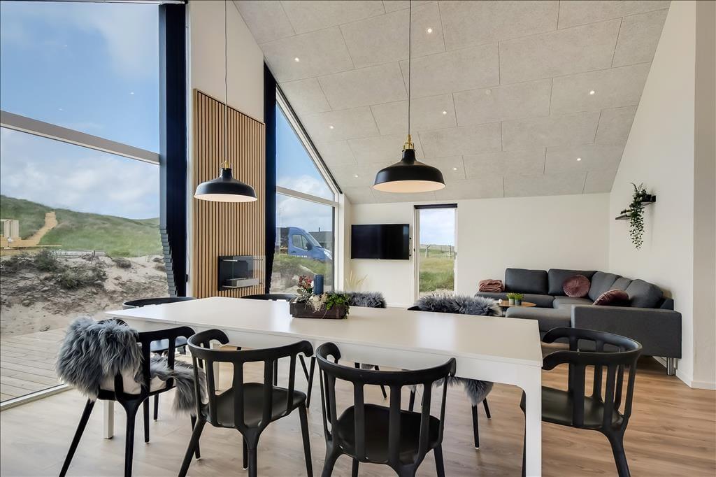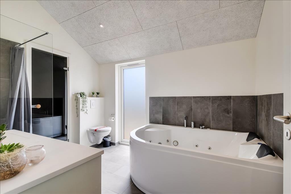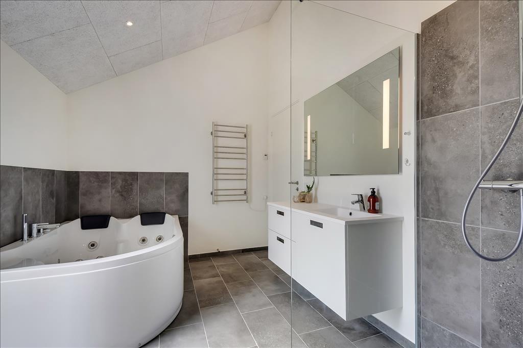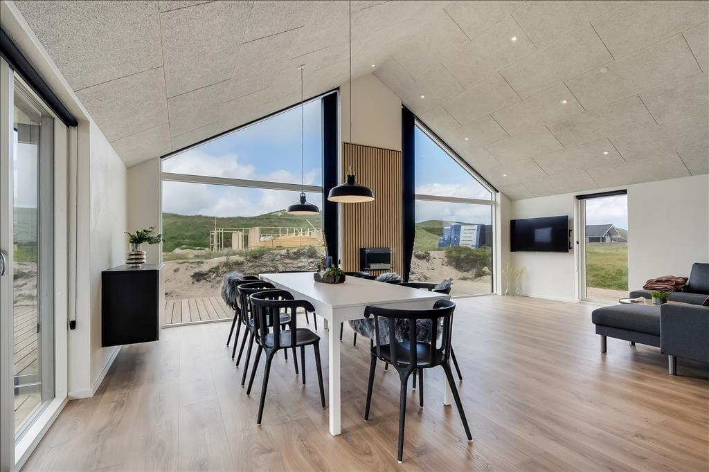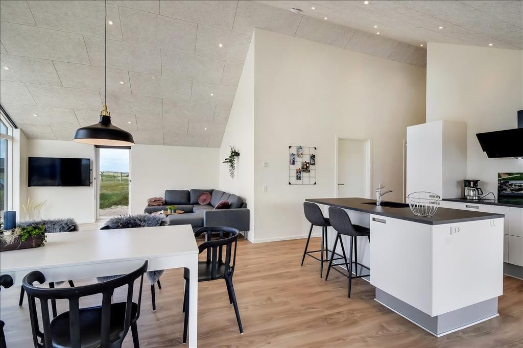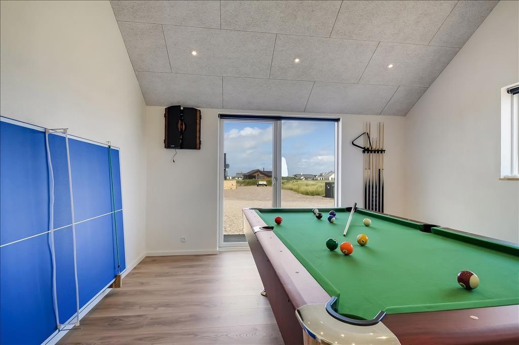 Sommerhuset emmer af lys og rummelighed, og indretningen er moderne og behagelig med højt til loftet og store vinduespartier, der inviterer naturen indenfor. Køkkenet ligger i åben forbindelse med spiseplads og stue, så det føles naturligt at samles til hyggelige stunder, uanset om I laver mad, spiller kort eller bare nyder en rolig stund foran tv’et. Badeværelset er indrettet som en lille wellness-oase med spa og sauna, og herfra er der direkte udgang til terrassen – hvilket gør det nemt at bevæge sig fra varme til frisk luft. Når det er tid til leg og konkurrence, venter aktivitetsrummet med både poolbord og bordtennis – her kan alle i selskabet være med, uanset alder og niveau.